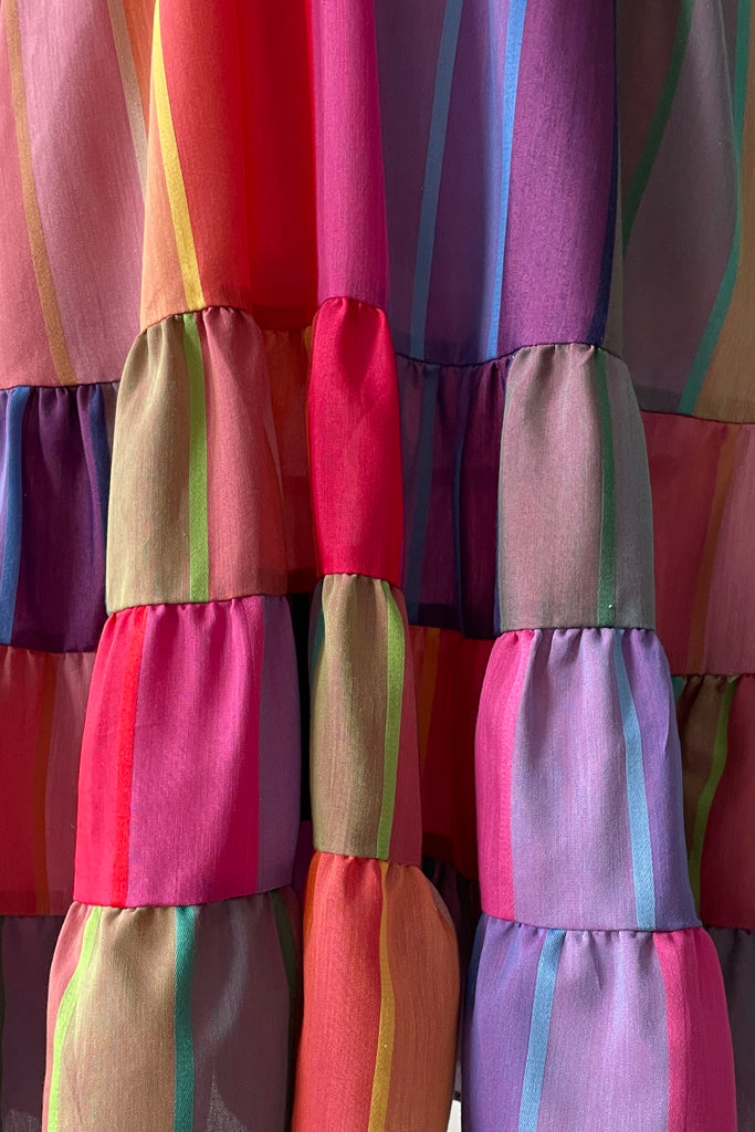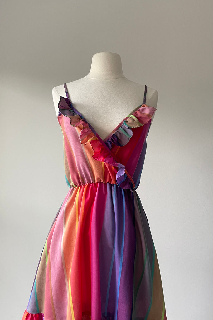 d e t a i l s : beautiful sunset stripe sun dress with ruffled trim, wrapped style bodice, elastic at waist + bust