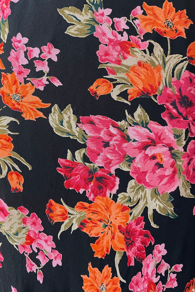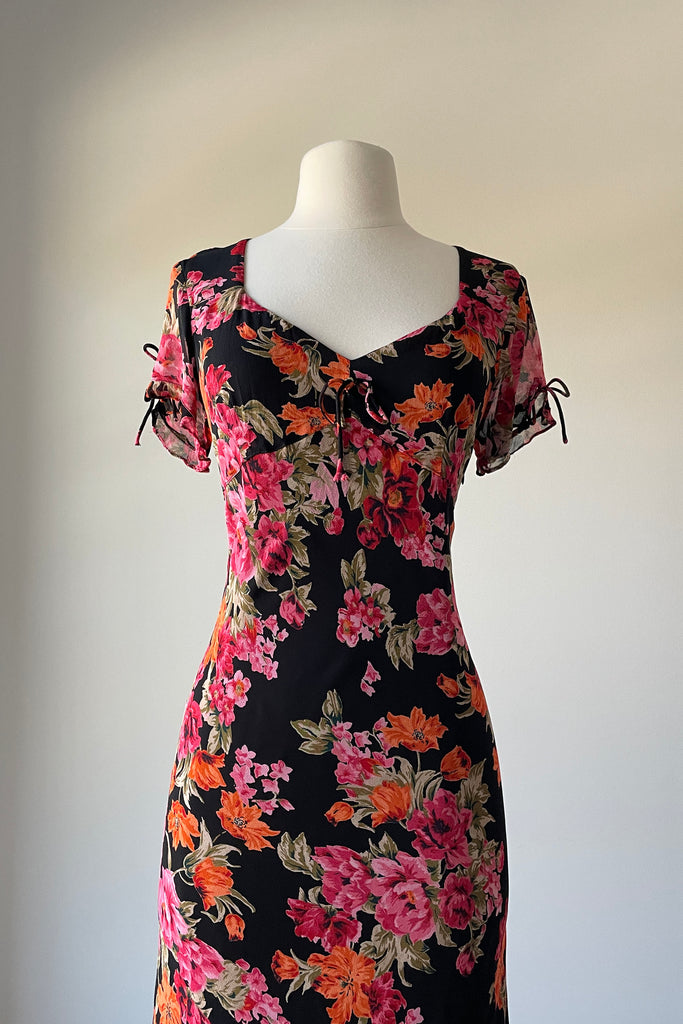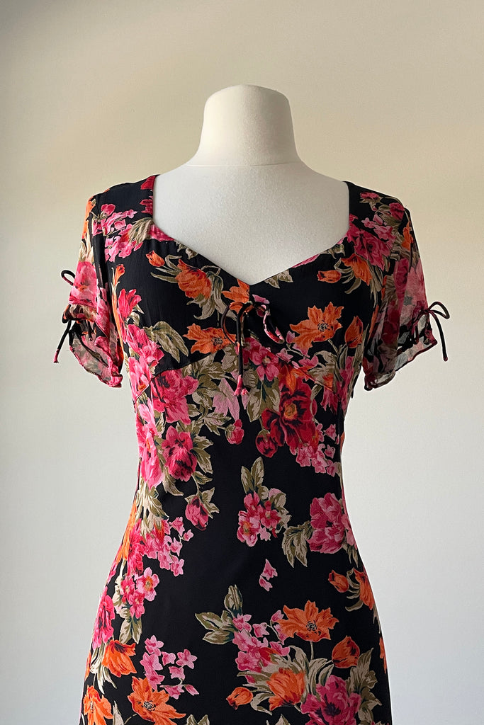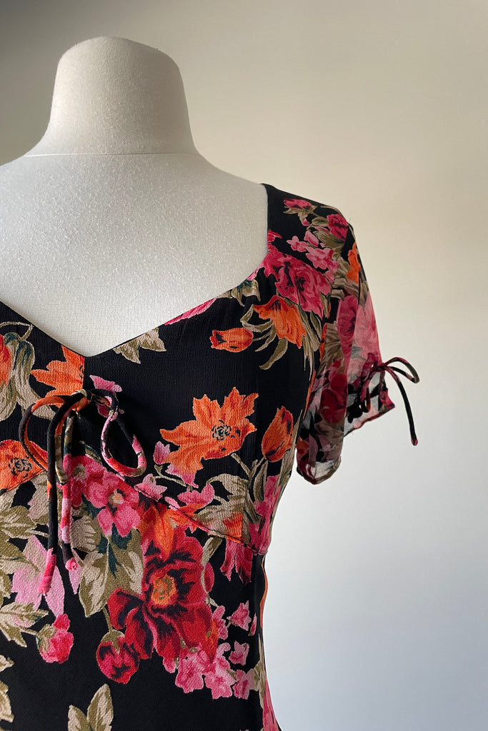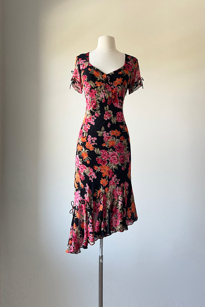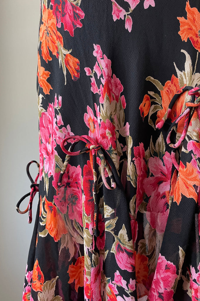 d e t a i l s : beautiful saturated floral print on black background, asymmetrical hem, tiny ties adore sleeves and skirt, fully lined