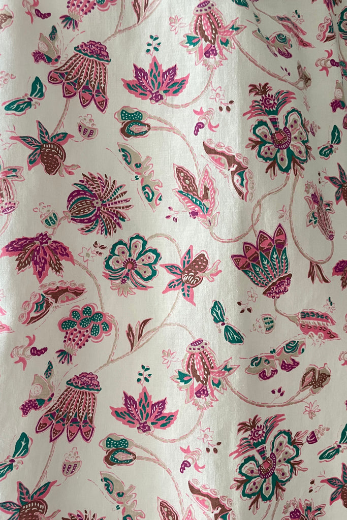 Beautiful paisley floral and butterfly print, full skirt, lined bodice with stays, adjustable halter necktie, skirt pockets.