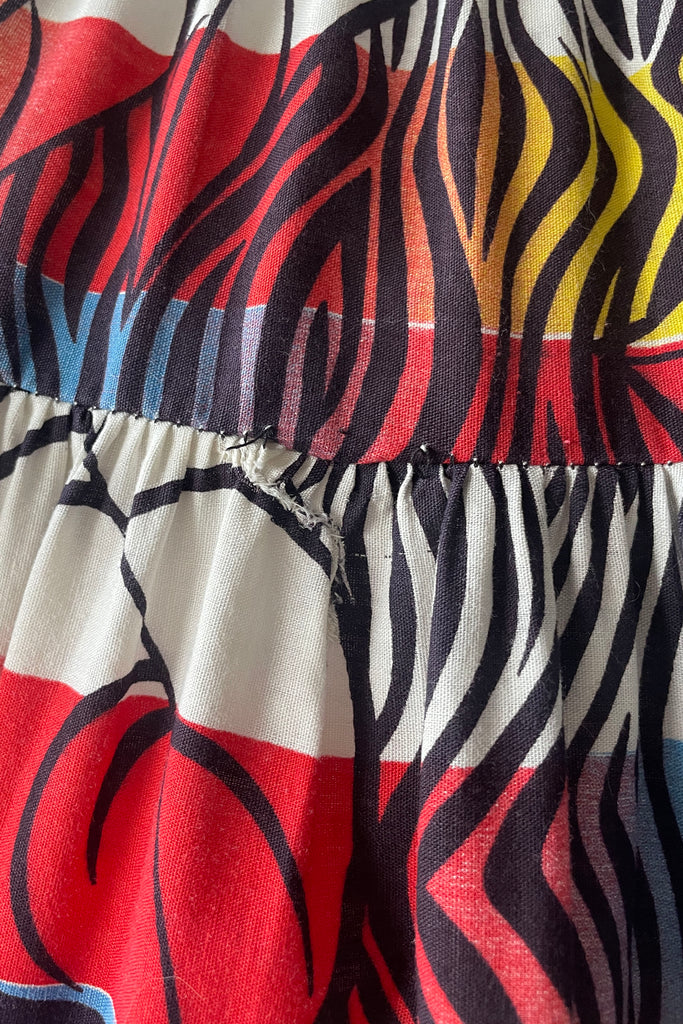 Stunning bold saturated color tropical print dress. Full tiered skirt, wrap style bodice, matching waist sash can be tied in front or back.