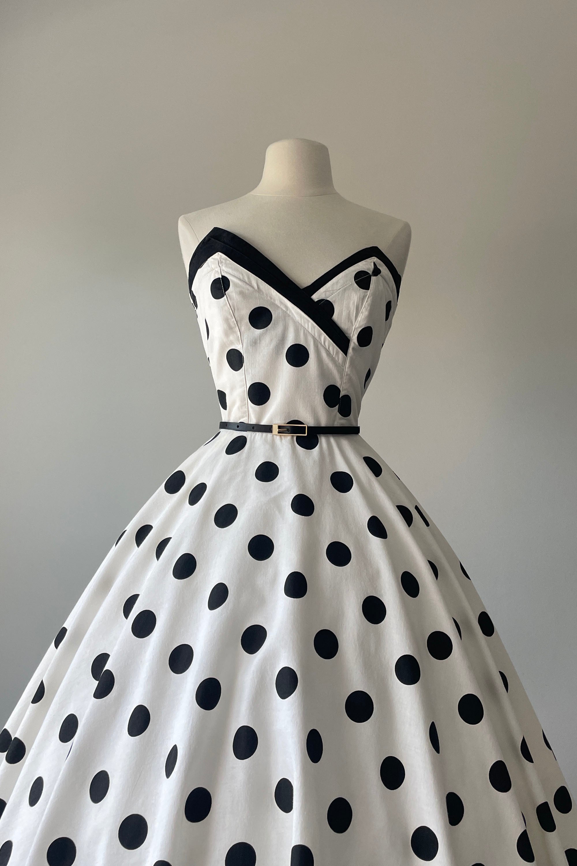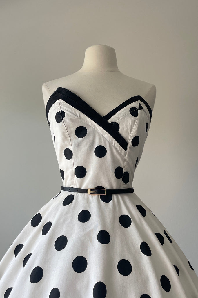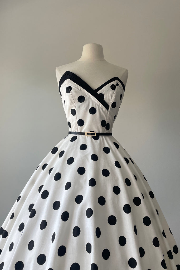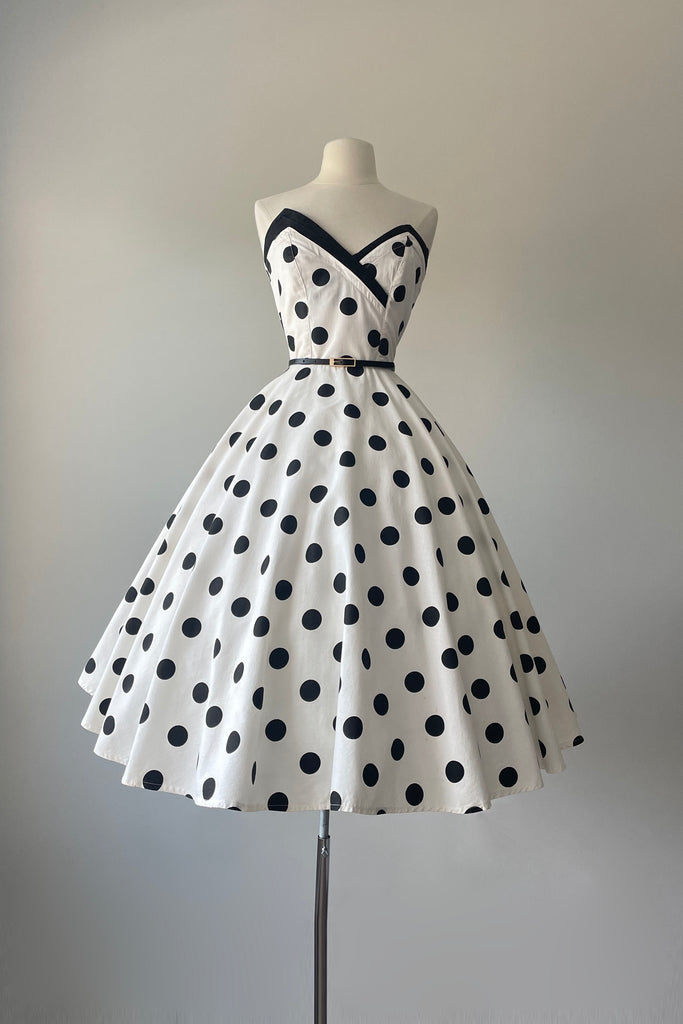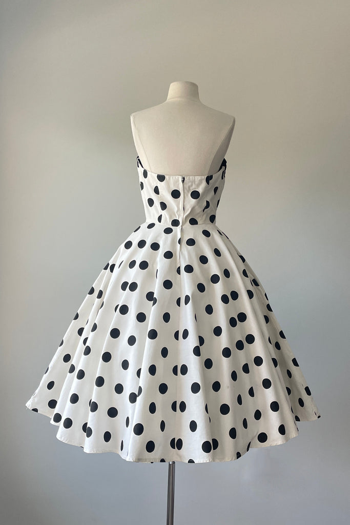 Beautiful heavy cotton in ivory with black polka dot print, strapless bodice with stays to give extra support + structure, full skirt with pockets, back zipper. Fabulous quality and design with a nod to the 1950's by one of our favorite labels - Karen Alexander. Belt is not original but will be included in your order.