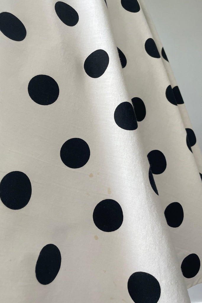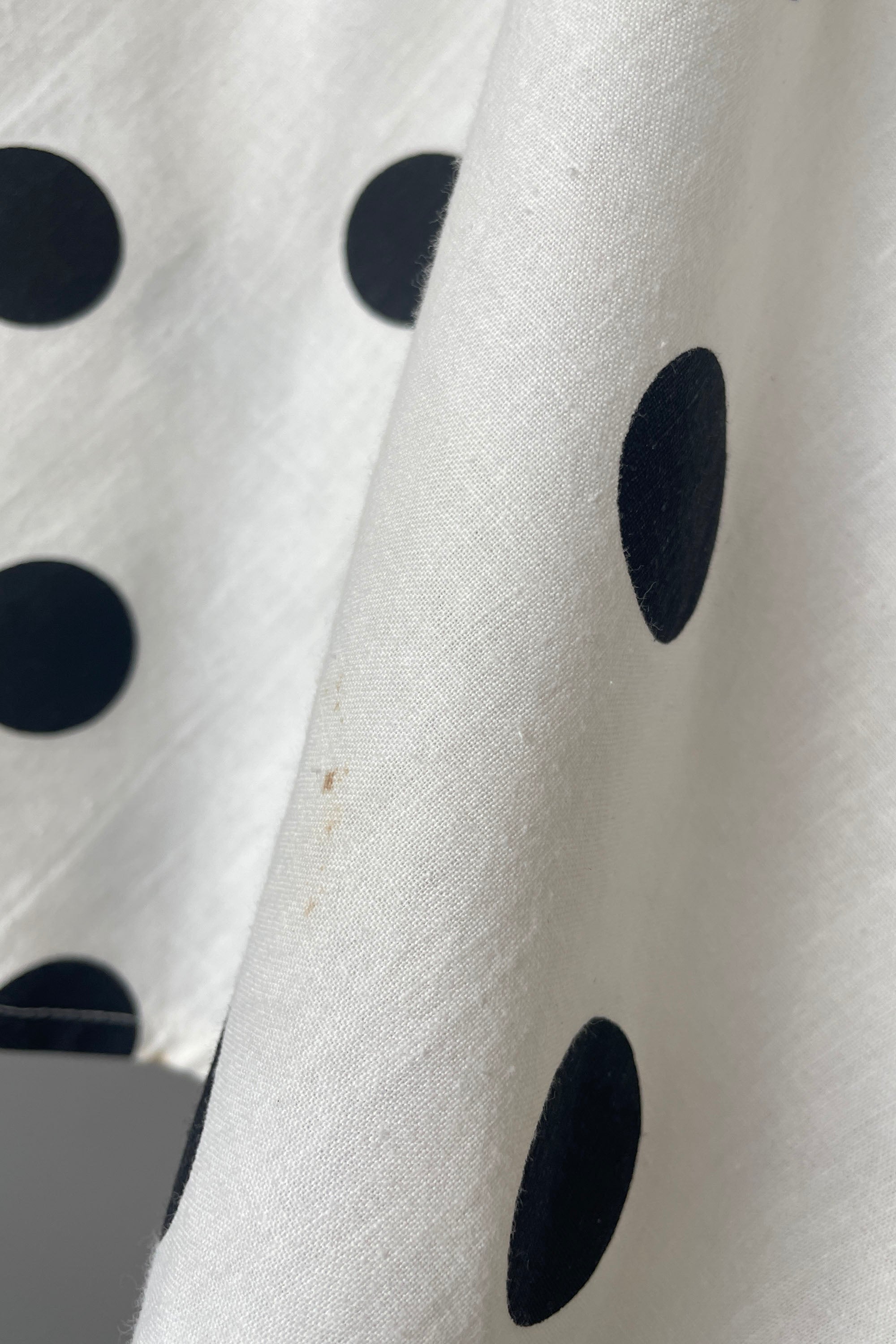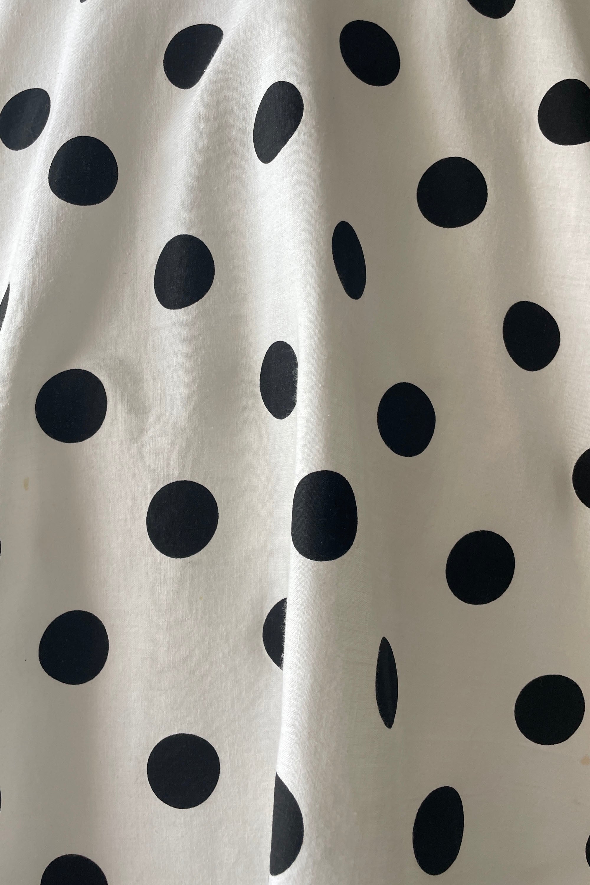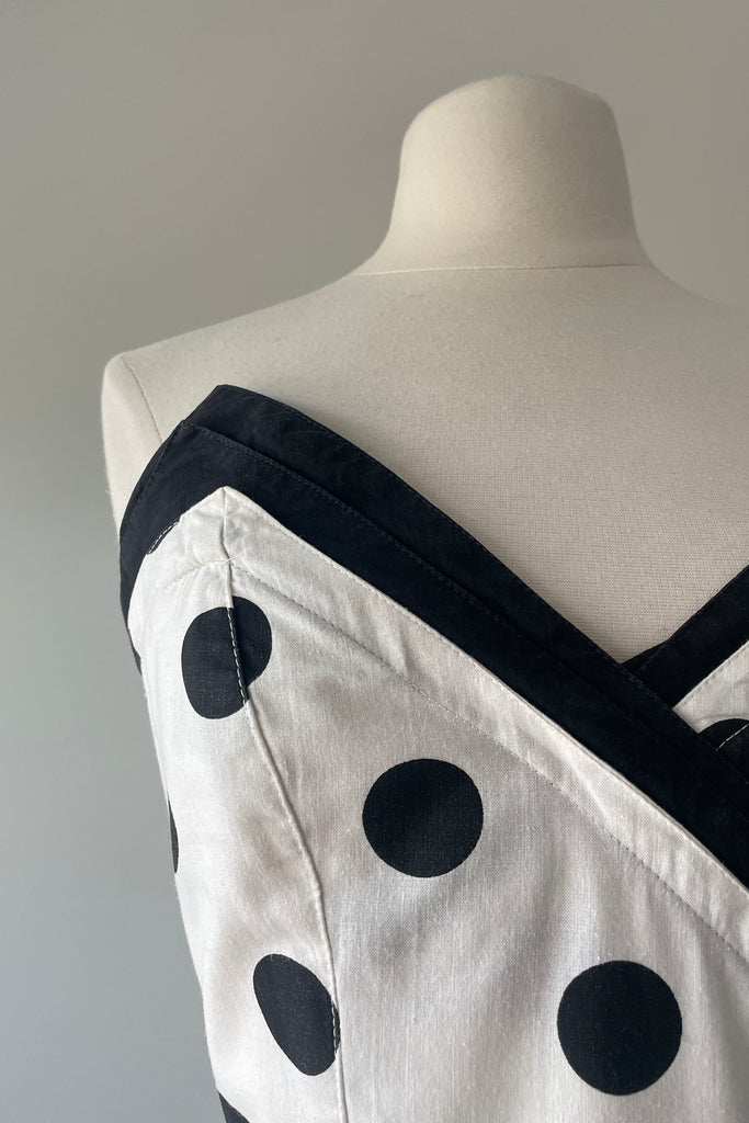 Beautiful heavy cotton in ivory with black polka dot print, strapless bodice with stays to give extra support + structure, full skirt with pockets, back zipper. Fabulous quality and design with a nod to the 1950's by one of our favorite labels - Karen Alexander. Belt is not original but will be included in your order.