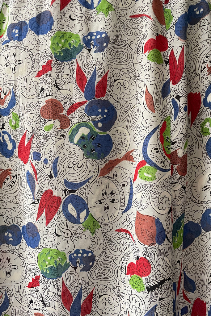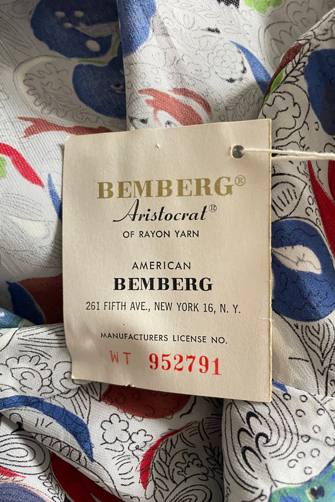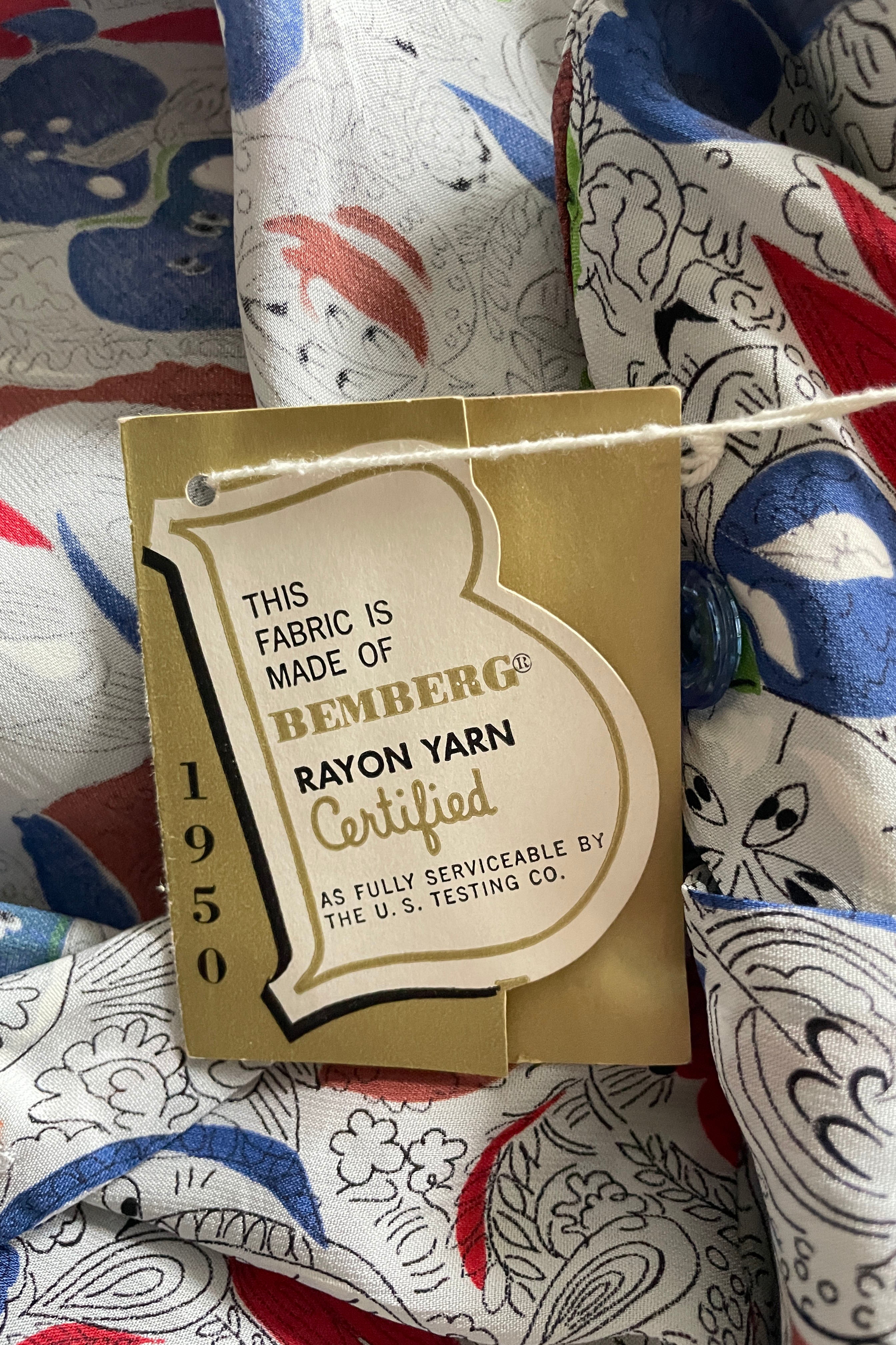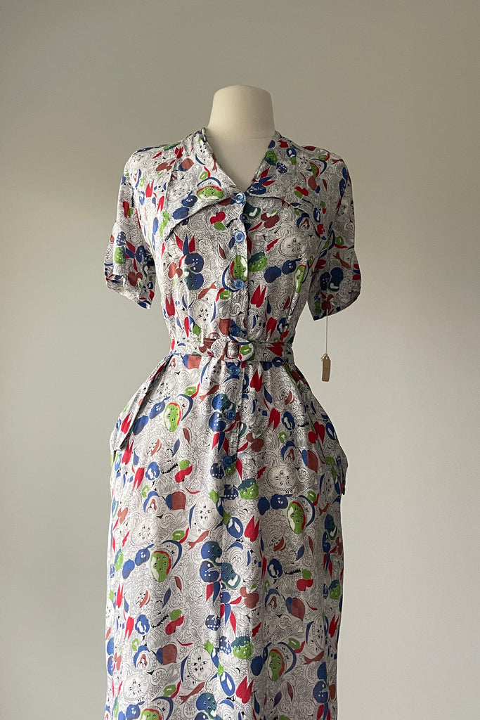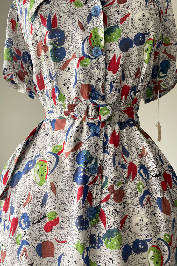 d e t a i l s : gorgeous fruit novelty print rayon dress, original belt, hip pockets, button front closure, RARE dead stock with original tags