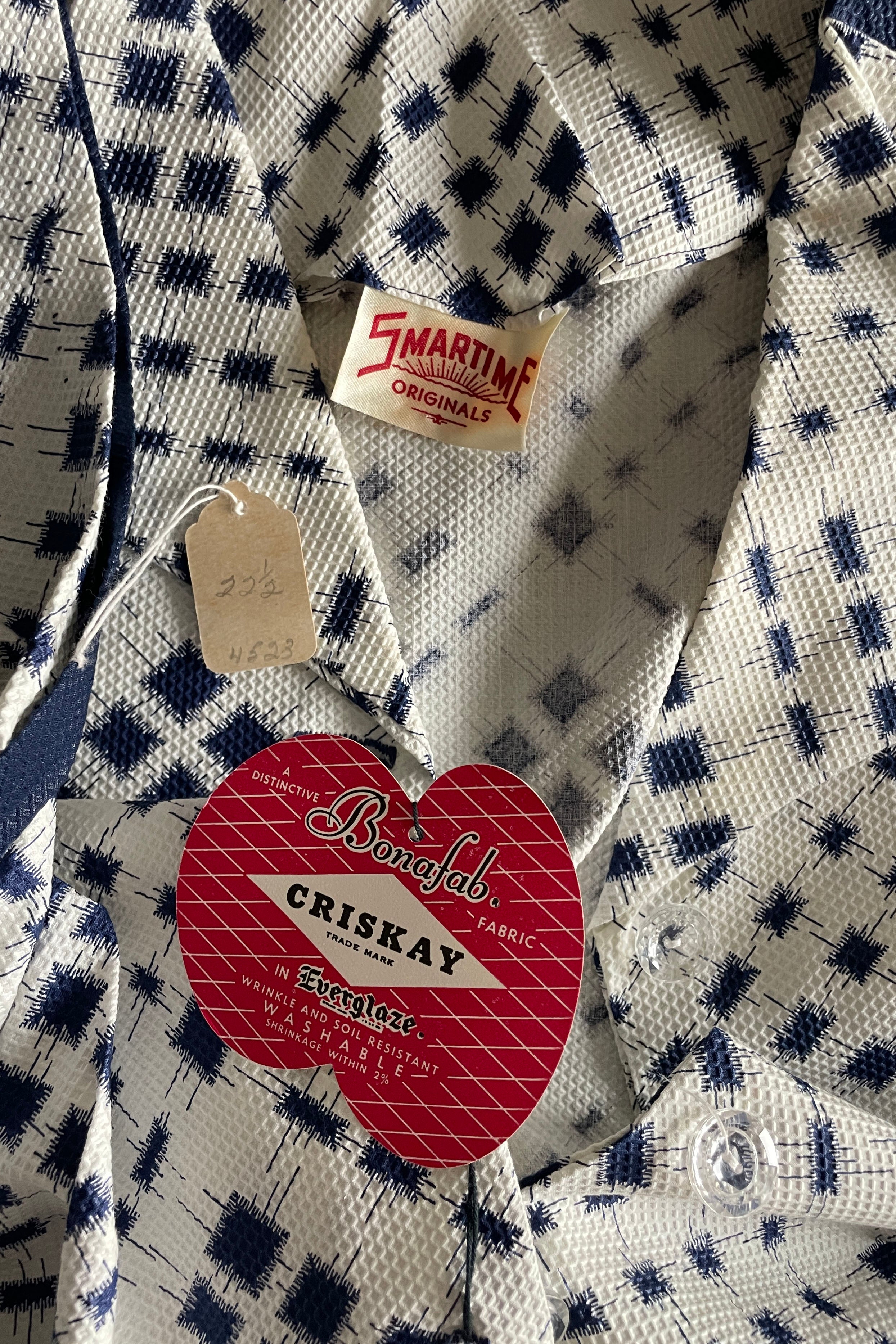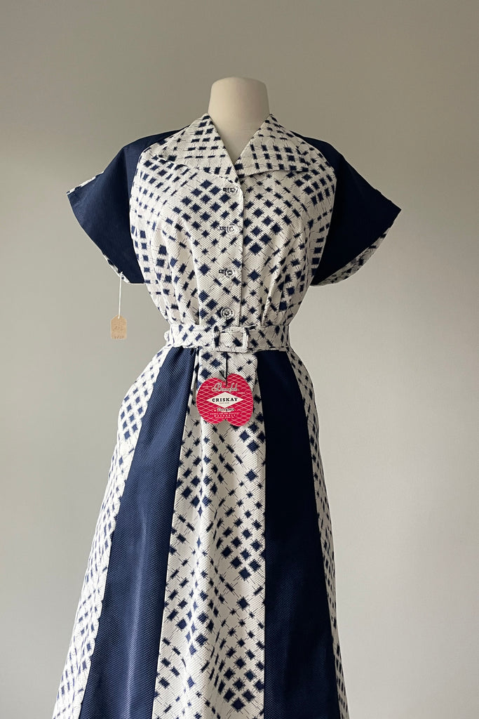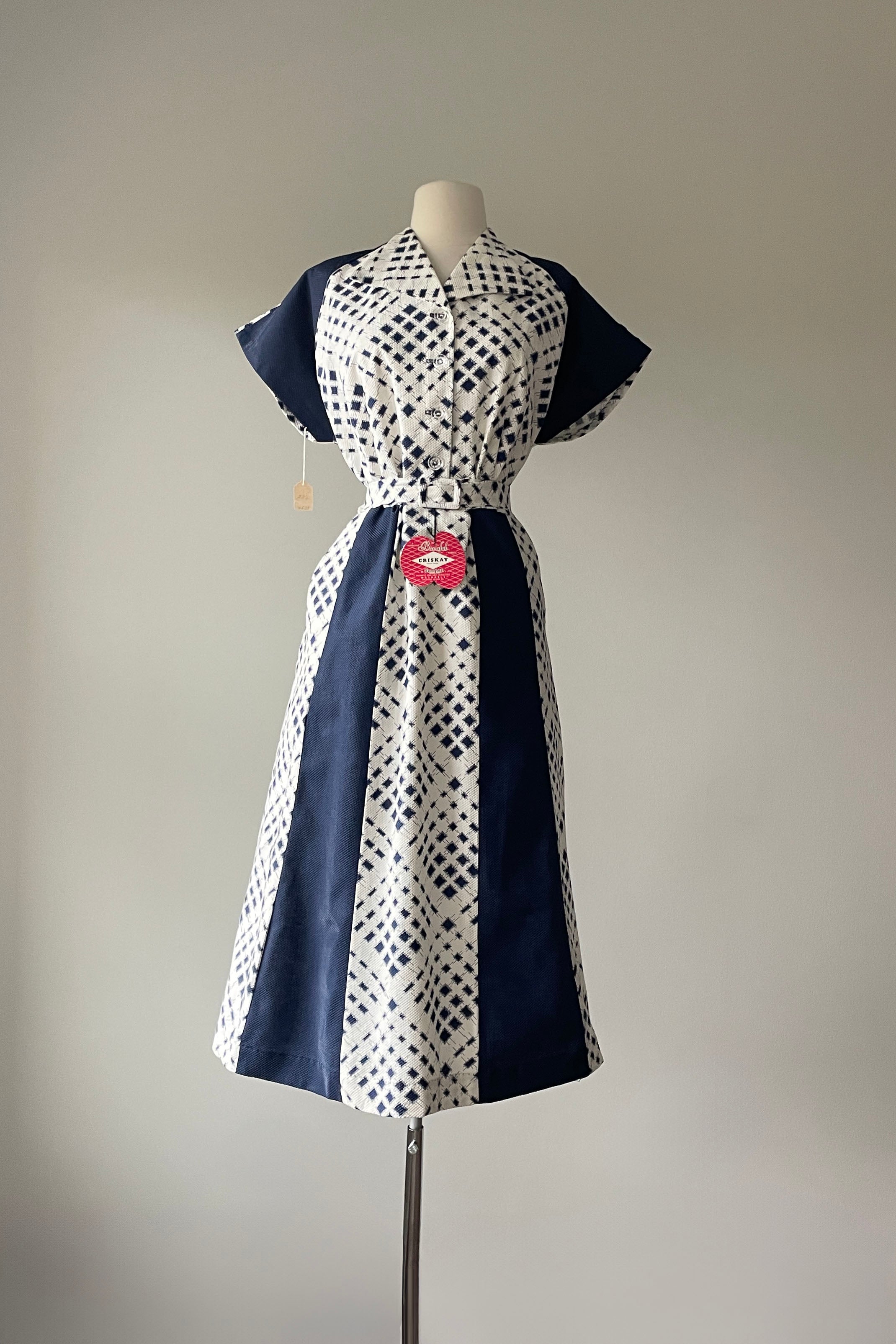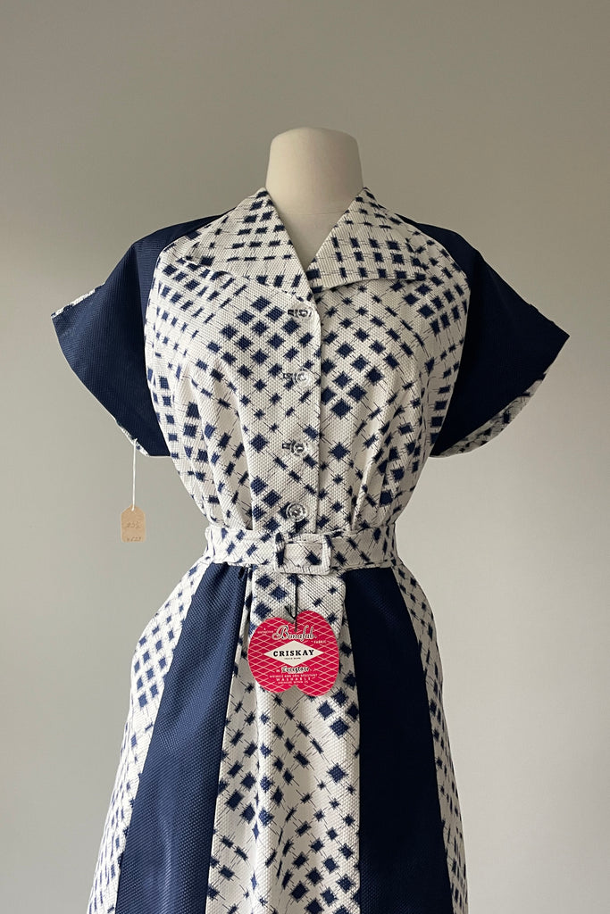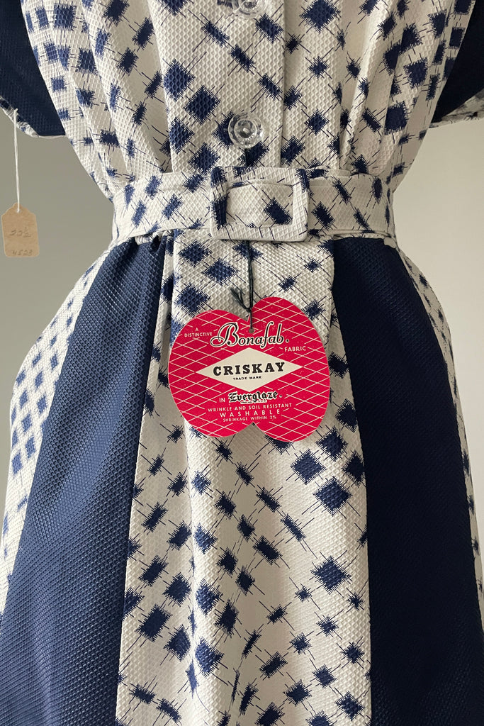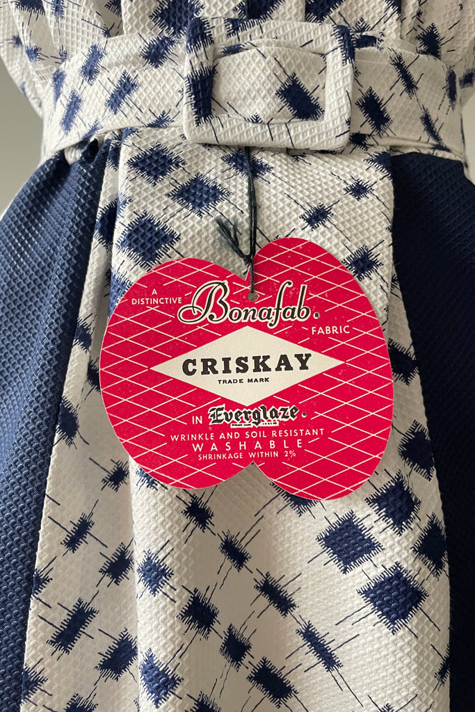 d e t a i l s : incredible blue + white atomic print dress from Smartime, Everglaze shiny textured cotton, button front closure, hip pockets, original belt, RARE dead stock with designer tags AND store price tag. exceptional quality in a size that doesn't come along often. be the first person to wear this beauty