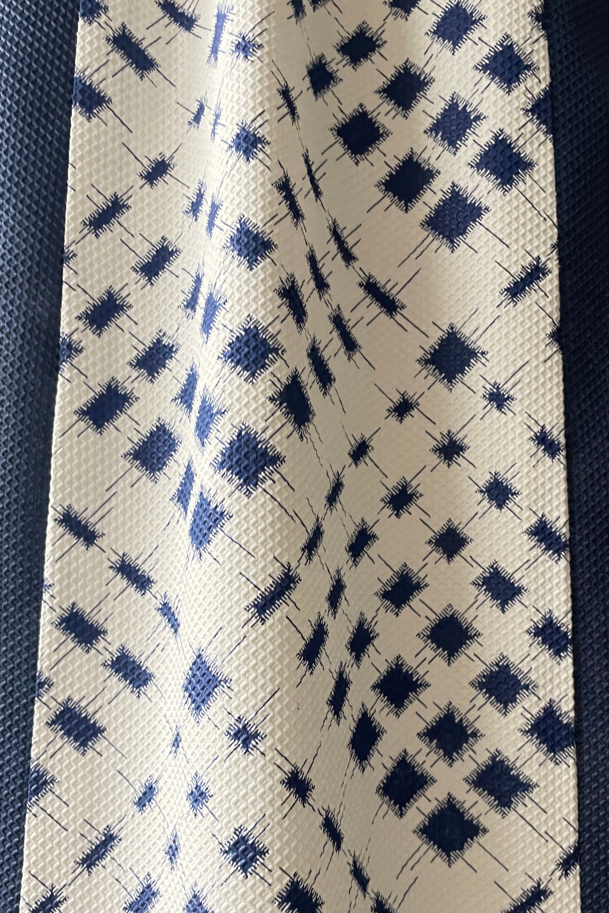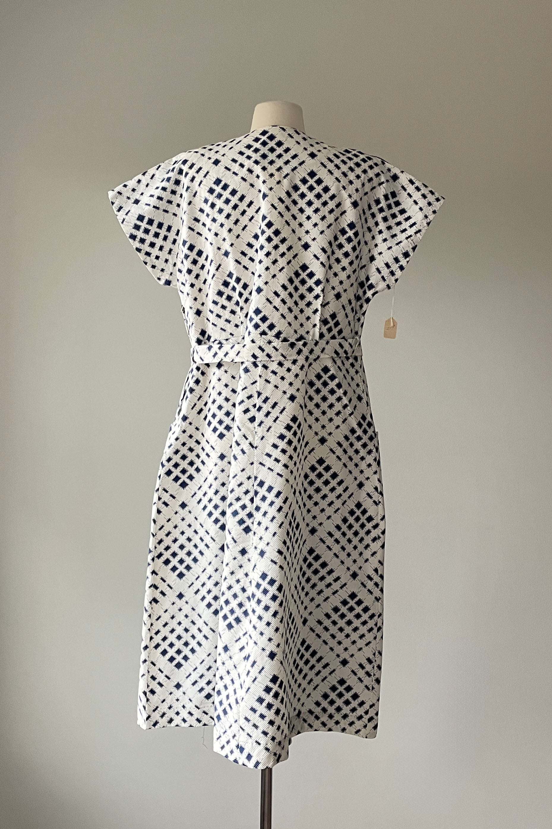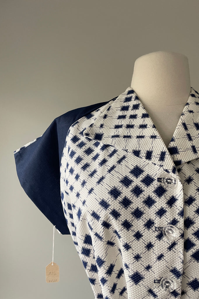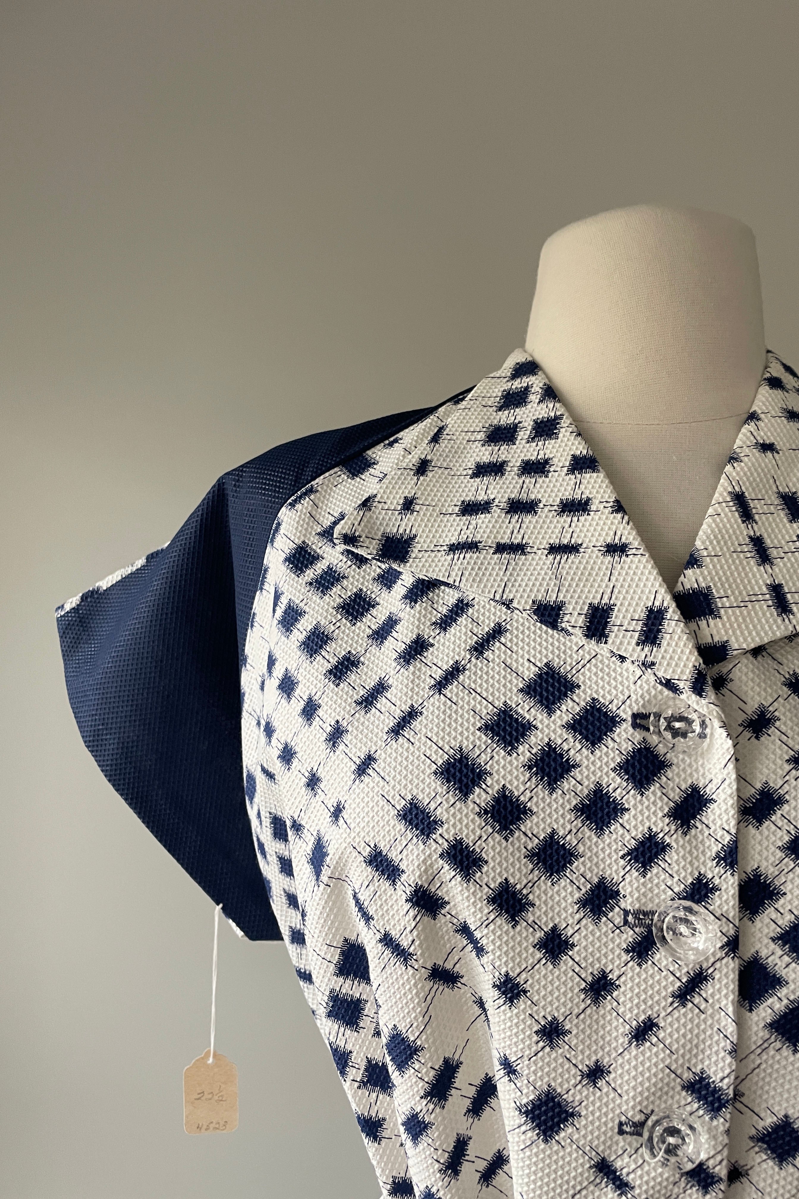 d e t a i l s : incredible blue + white atomic print dress from Smartime, Everglaze shiny textured cotton, button front closure, hip pockets, original belt, RARE dead stock with designer tags AND store price tag. exceptional quality in a size that doesn't come along often. be the first person to wear this beauty