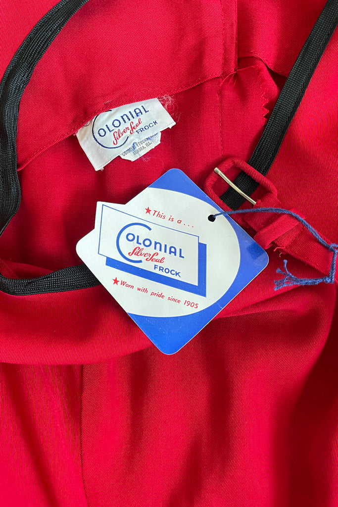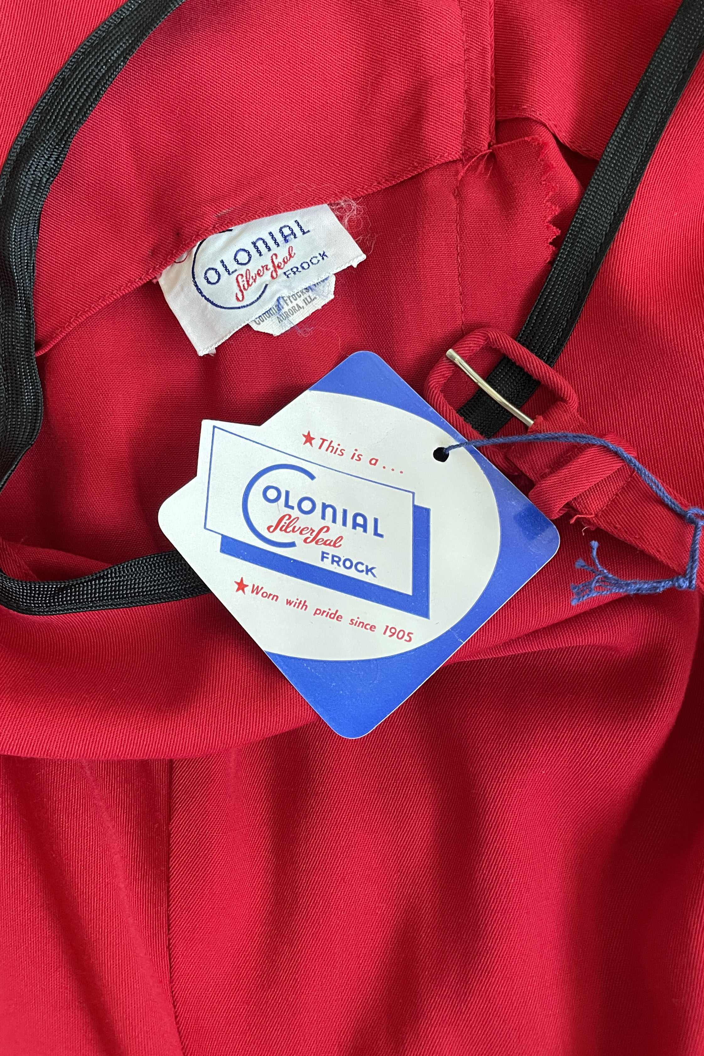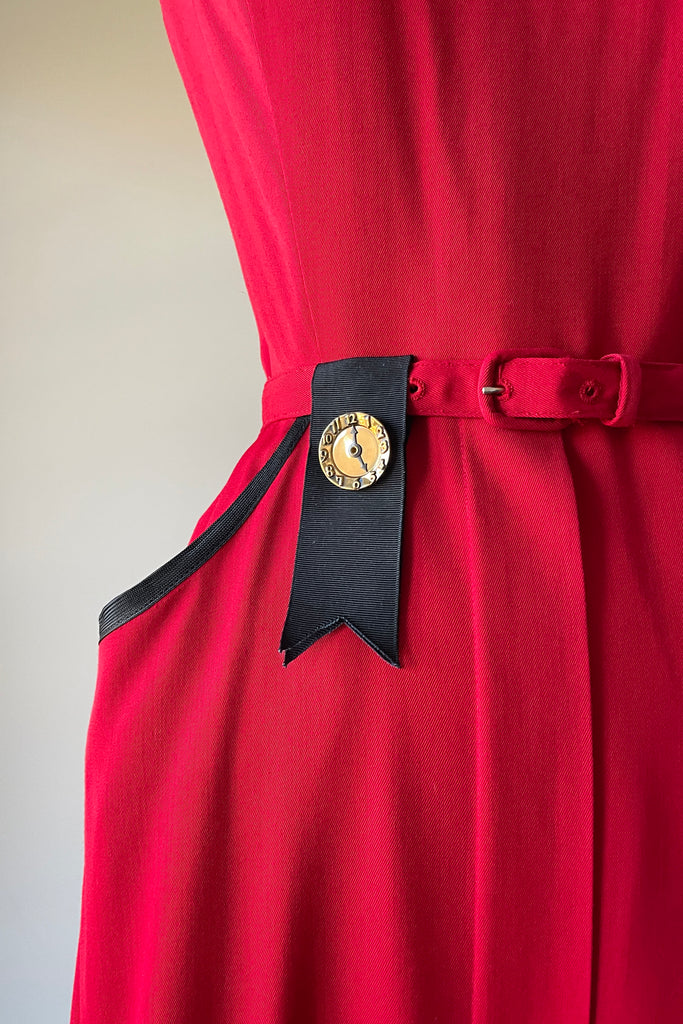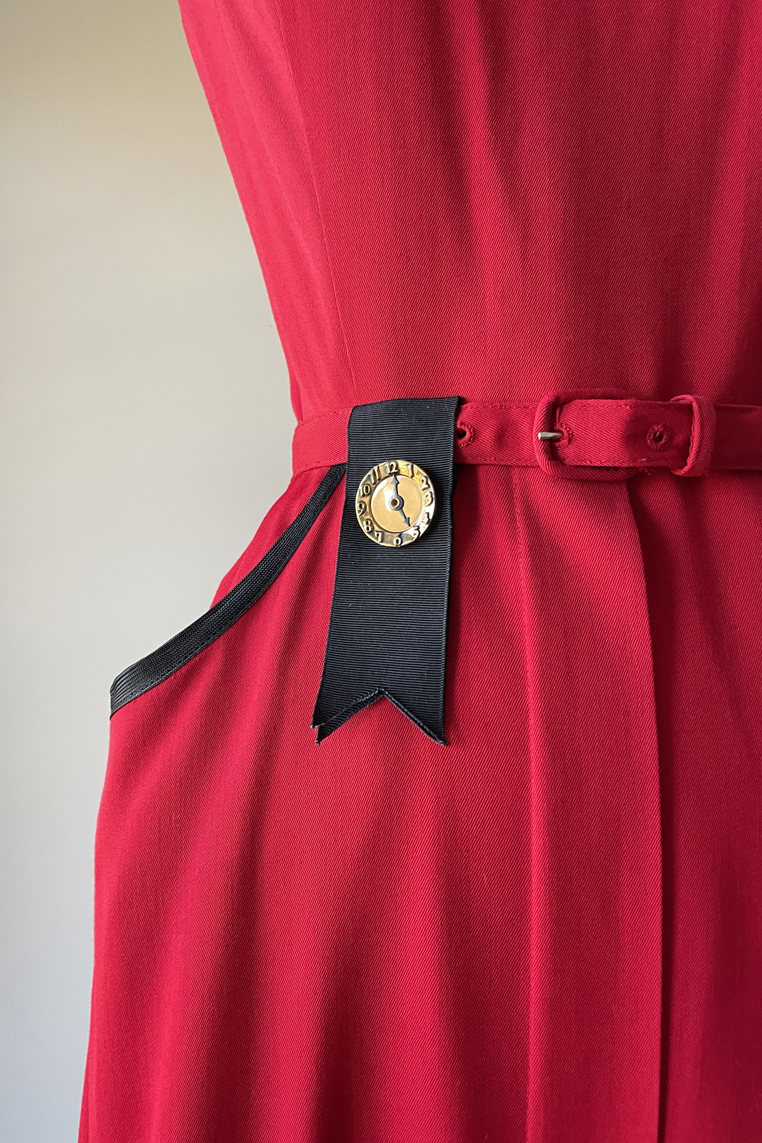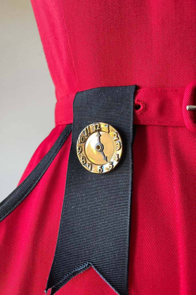 d e t a i l s : incredible dead stock NWT tags dress by Colonial Silver Seal, black flat ribbon trim, hip pockets, original tags and belt with ADORABLE articulating clock piece