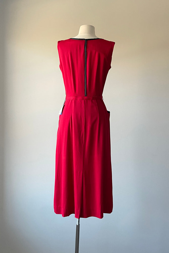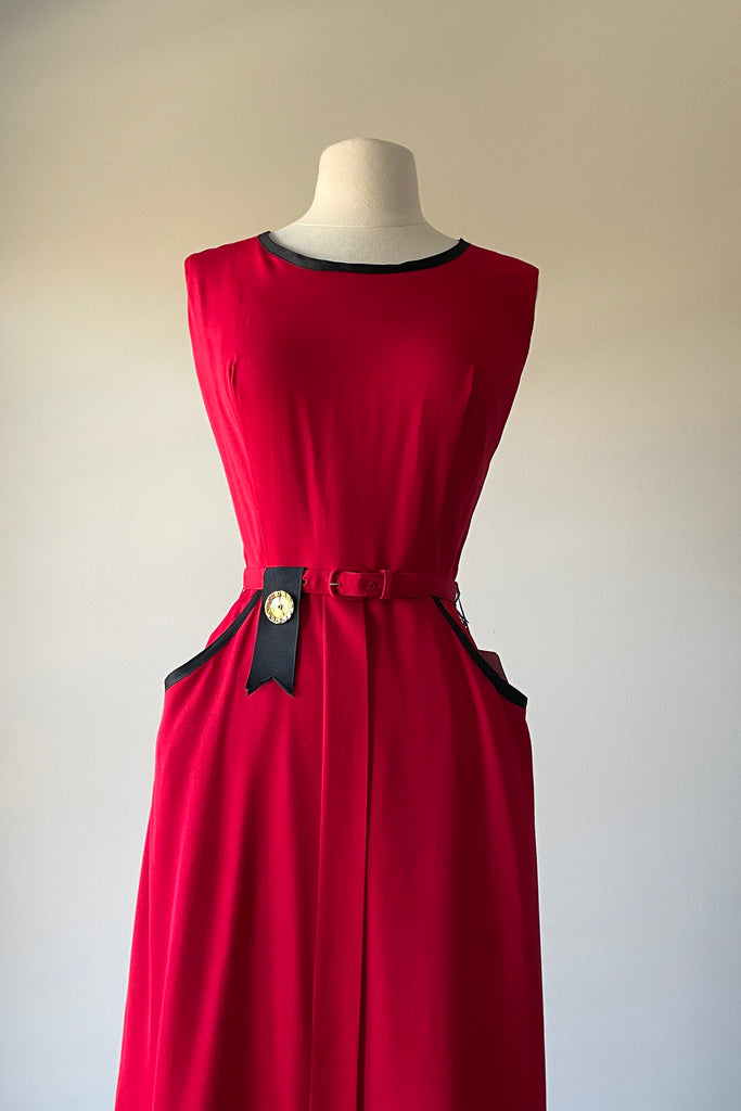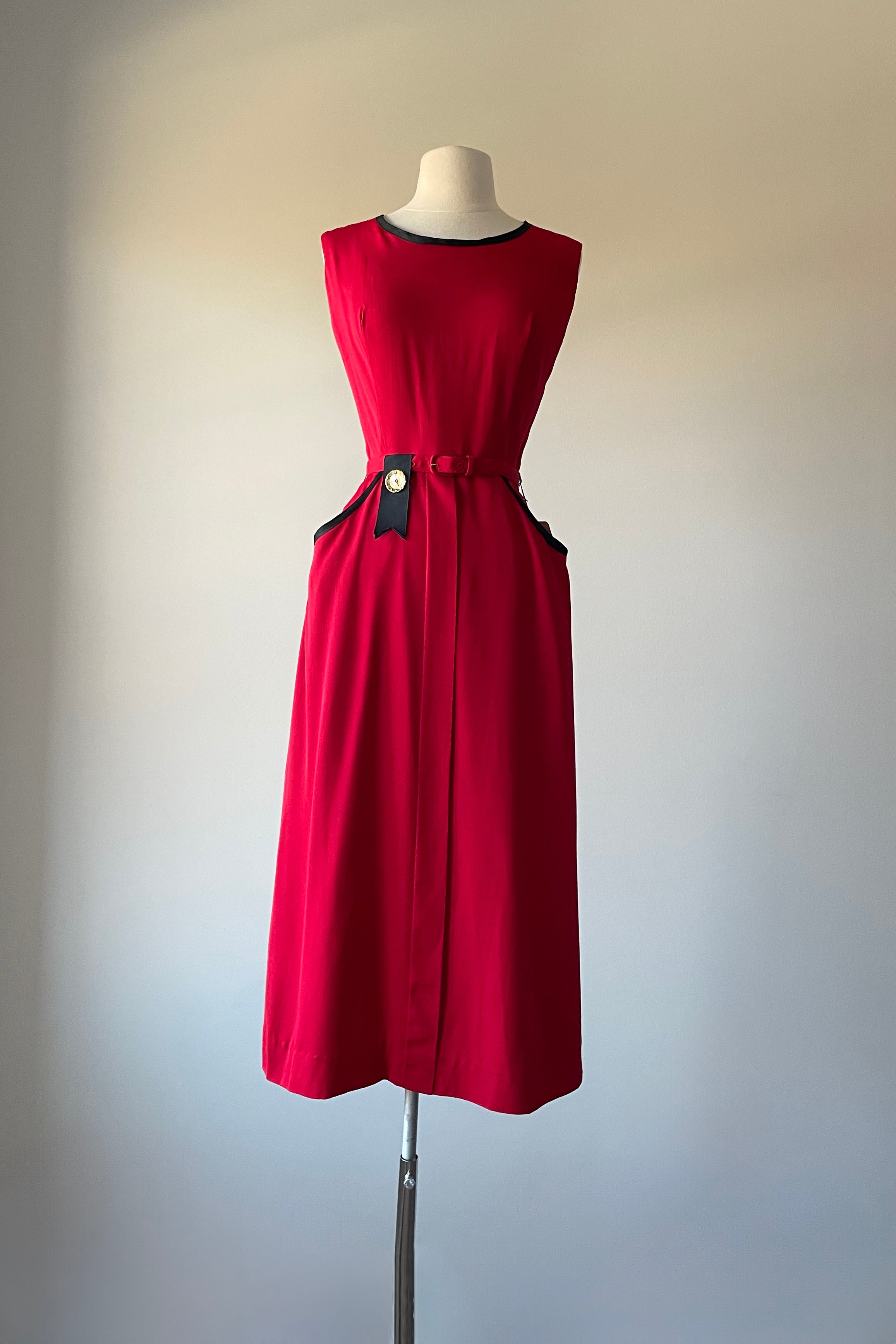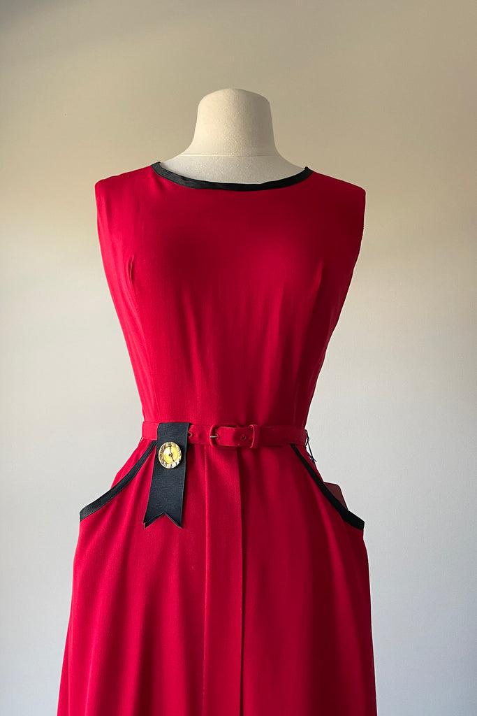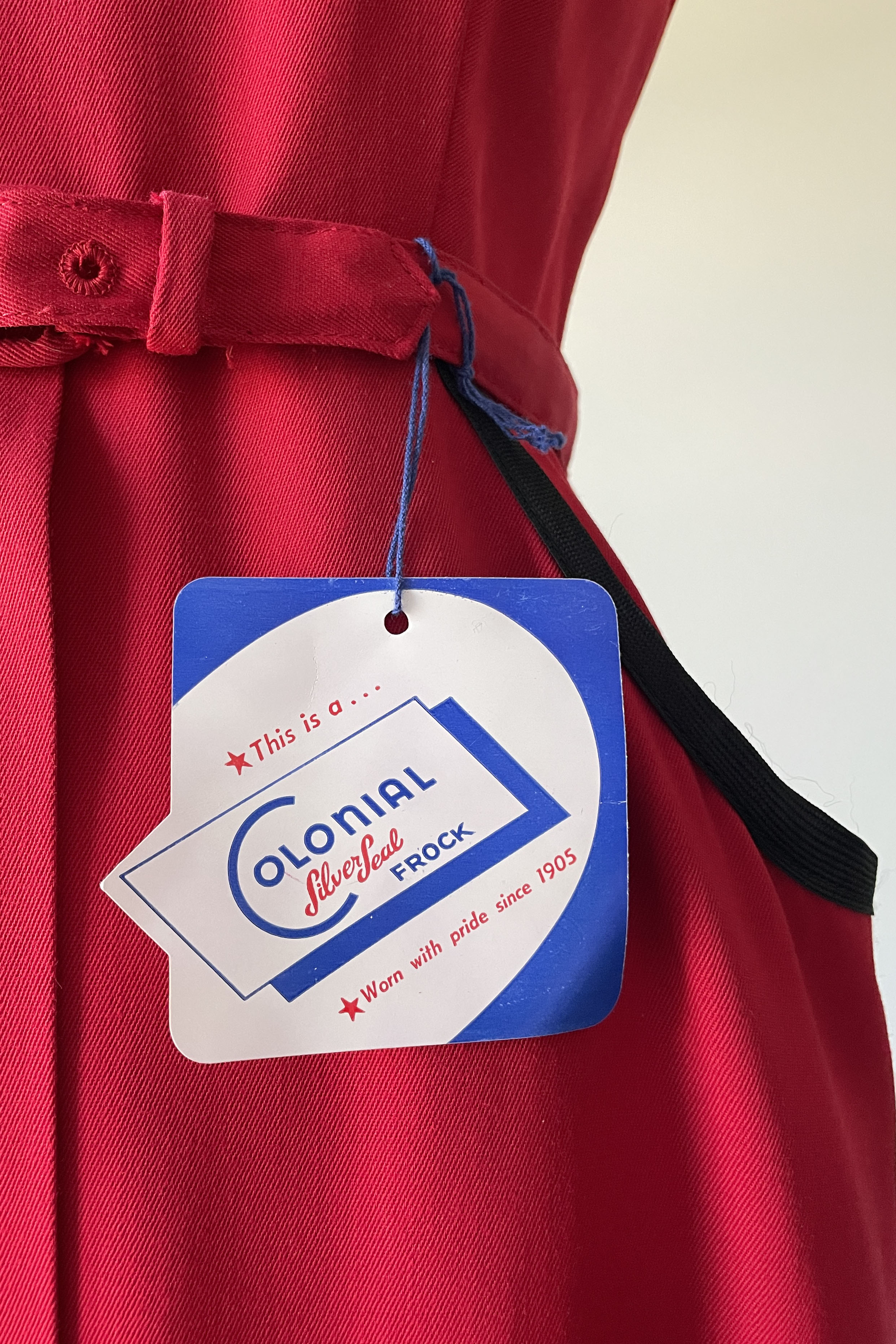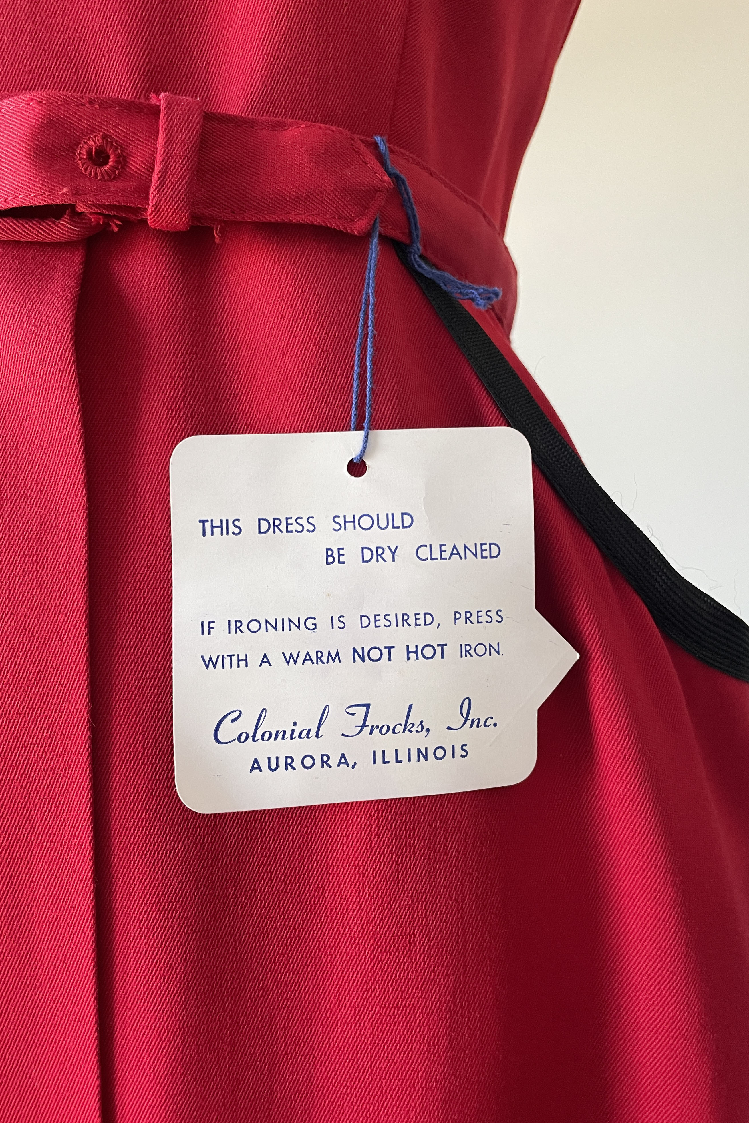 d e t a i l s : incredible dead stock NWT tags dress by Colonial Silver Seal, black flat ribbon trim, hip pockets, original tags and belt with ADORABLE articulating clock piece