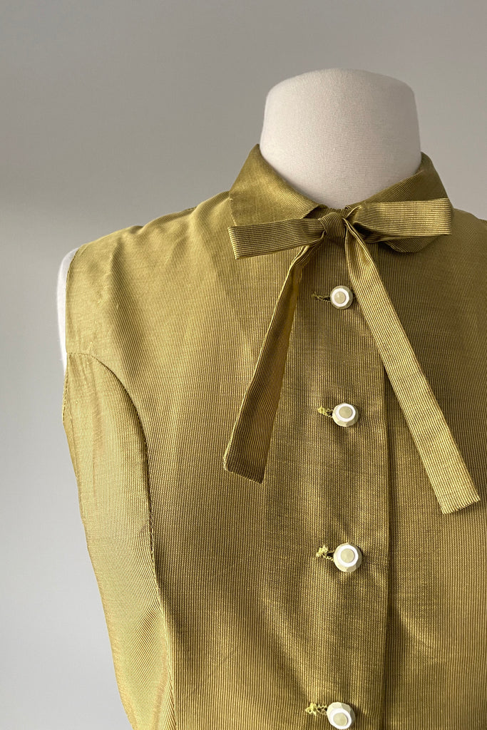d e t a i l s : stunning electrum green cotton/nylon blend, button front closure, bow tie neck, matching belt, RARE dead stock with original tags. be the first to wear this beauty!