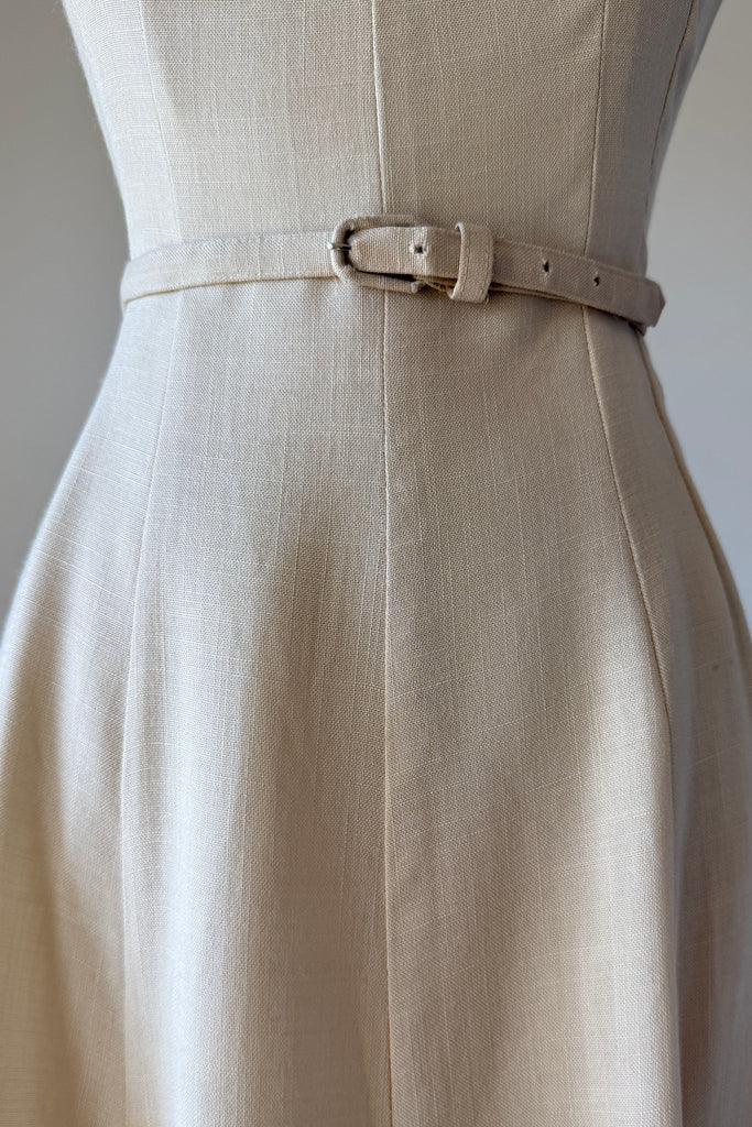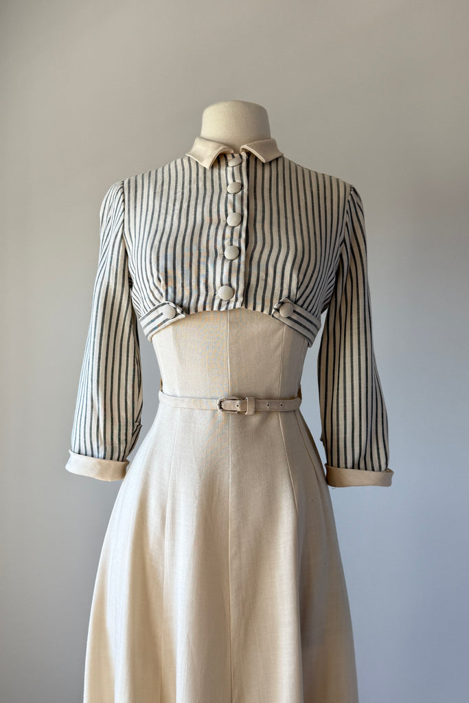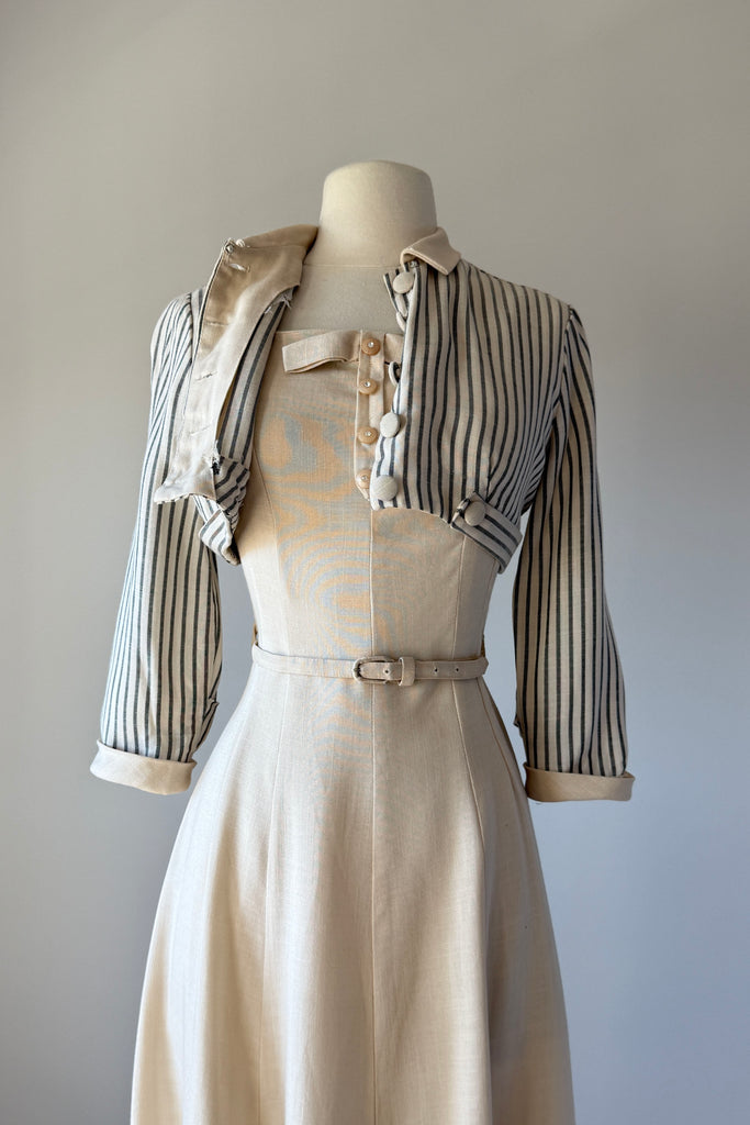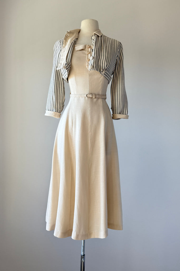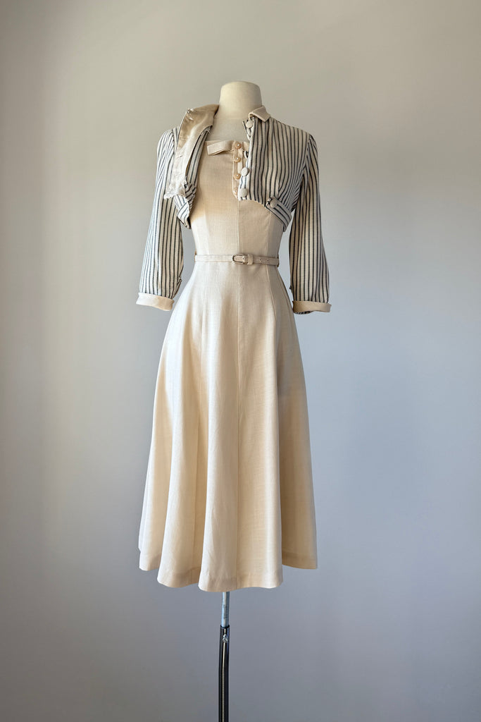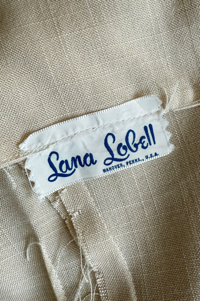 Vintage 1950s linen dress + bolero by Lana Lobell. Metal back zipper, original belt, button front jacket.One small repair at back of jacket collar otherwise excellent condition. As with all vintage, please expect minor wear consistent with age.Fits like XS. Measurements (in inches):Length 44Bodice 15Bust 34Waist 25-26Hips 480596 | 2540