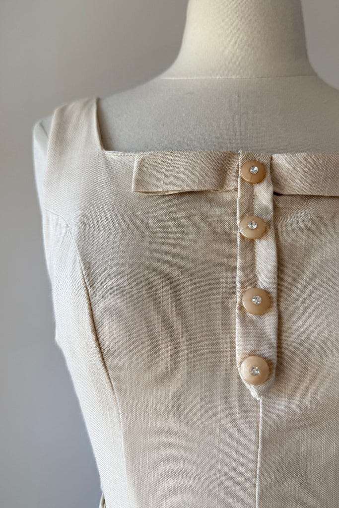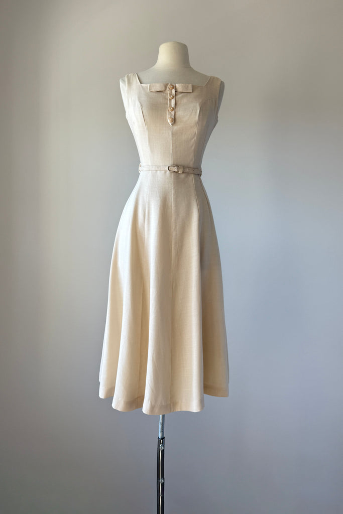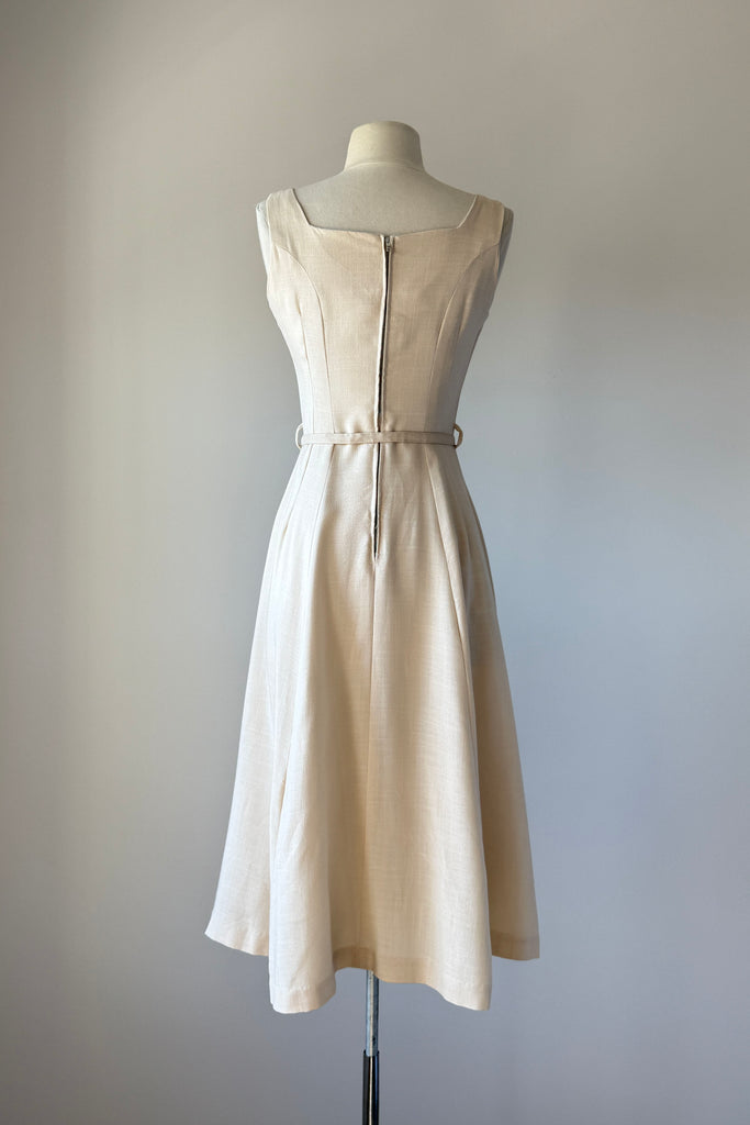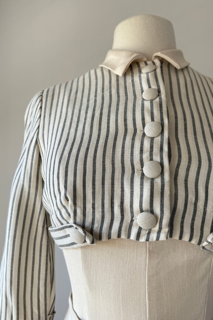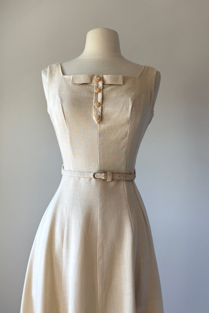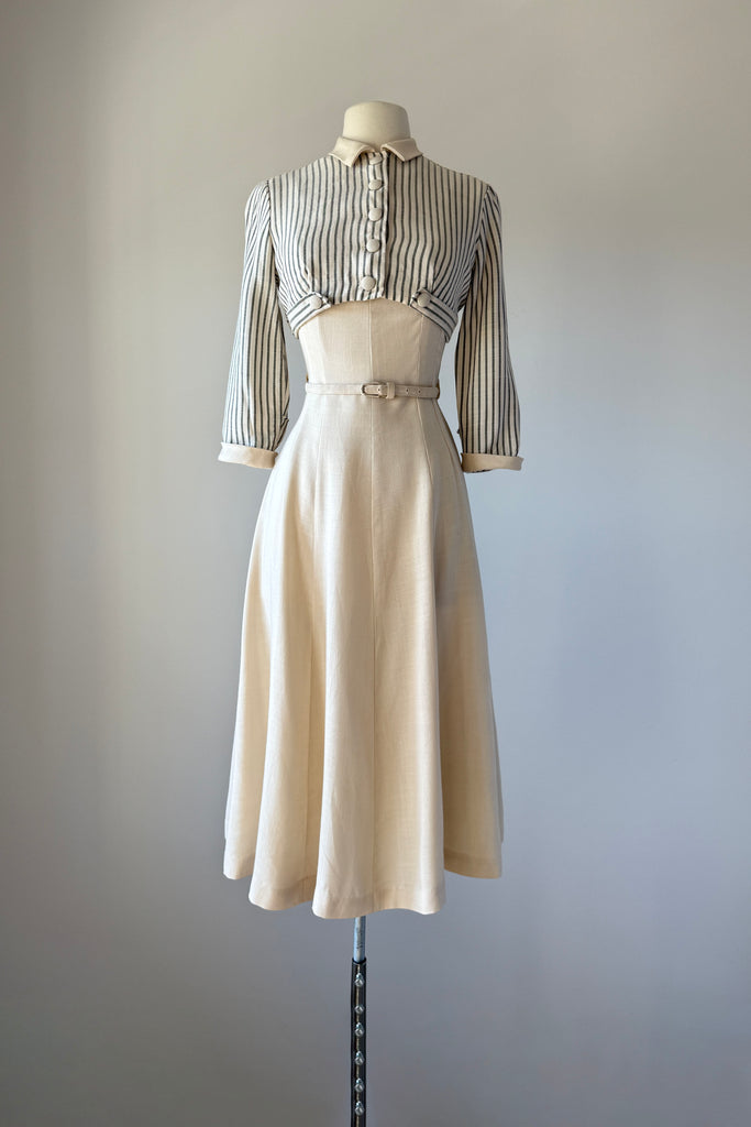 Vintage 1950s linen dress + bolero by Lana Lobell. Metal back zipper, original belt, button front jacket.One small repair at back of jacket collar otherwise excellent condition. As with all vintage, please expect minor wear consistent with age.Fits like XS. Measurements (in inches):Length 44Bodice 15Bust 34Waist 25-26Hips 480596 | 2540