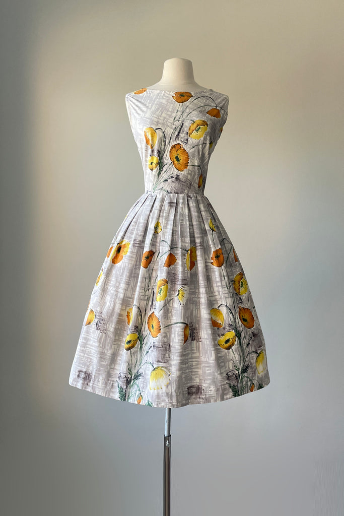 1950s Gray Yellow Floral Cotton Dress | LARGE