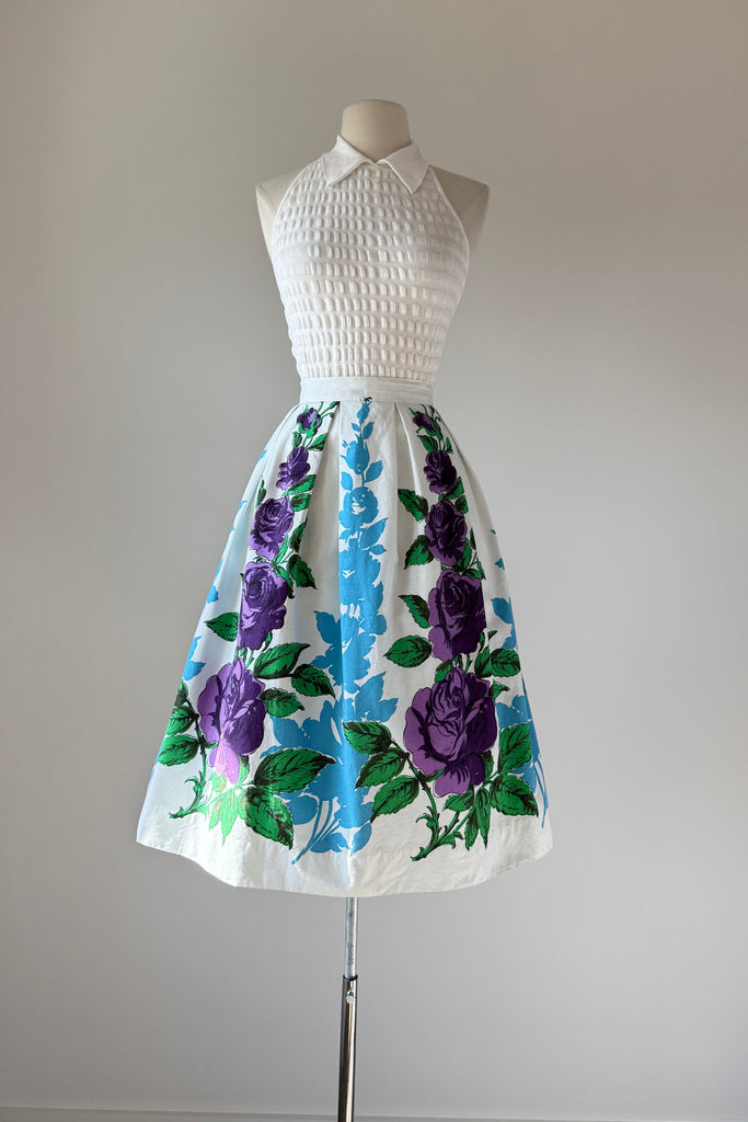 Vintage 1950s White Purple Floral Skirt by Luckson | LARGE