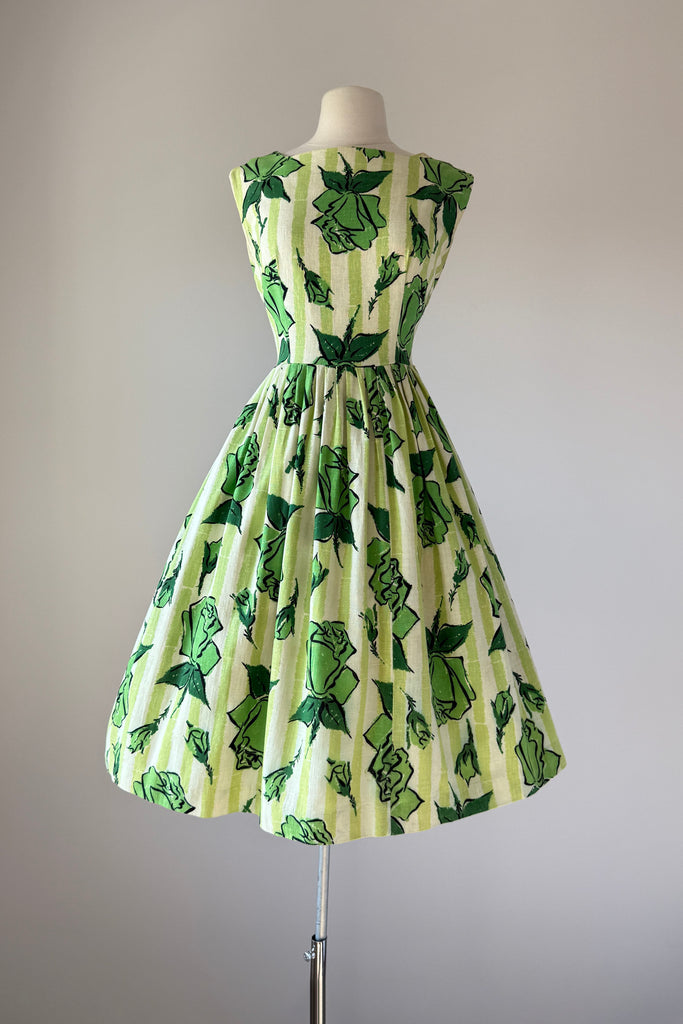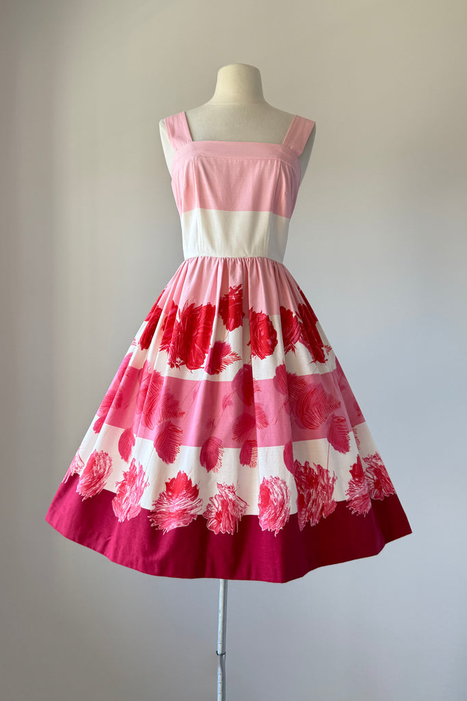 Vintage 1950s Pink Wide Stripe Rose Print Dress | S/M