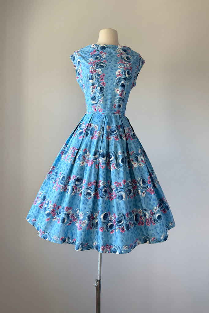 Vintage 1950s Blue Rose Print Dress by Minx Modes | S/M