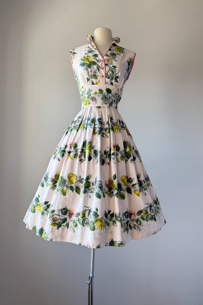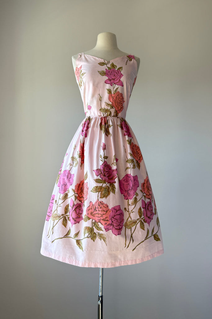 Vintage 1950s Pink Large Scale Rose Print Dress | MEDIUM