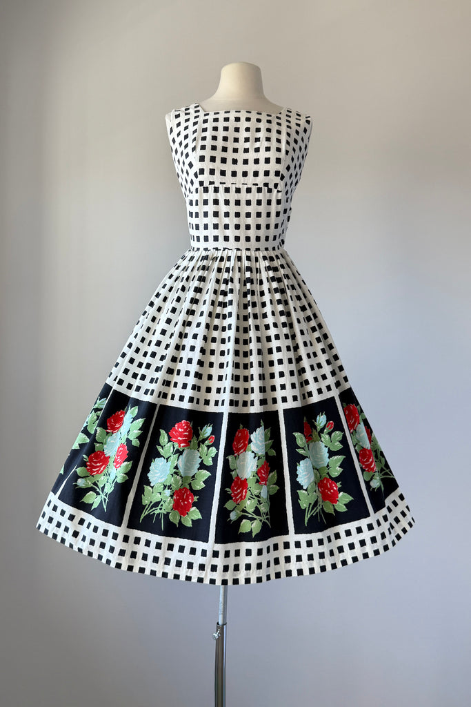 Vintage 1950s Black White Rose Border Print Cotton Dress | S/M