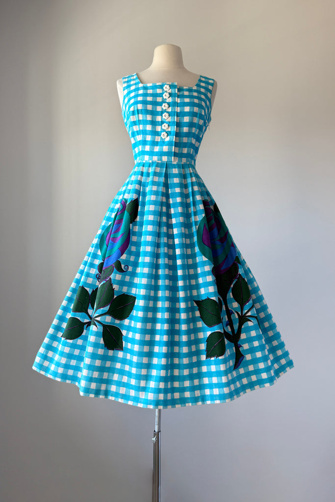 Vintage 1960s Turquoise Gingham Purple Rose Dress | MEDIUM