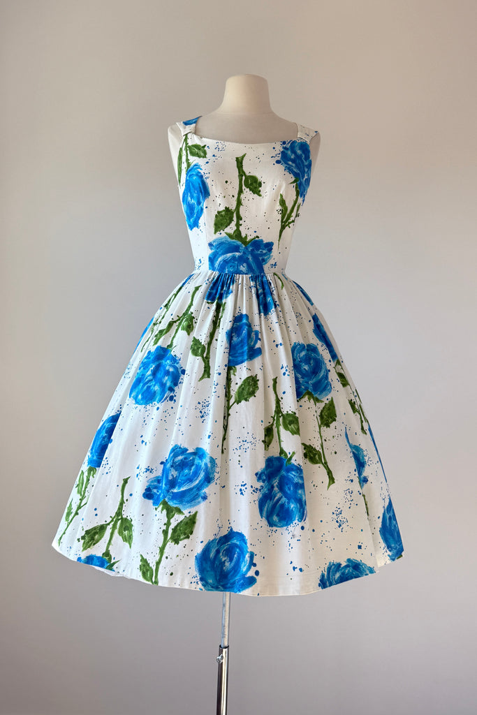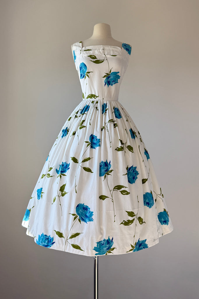 Vintage 1950s White Blue Rose Dress by Jerry Gilden for Spectator | MEDIUM