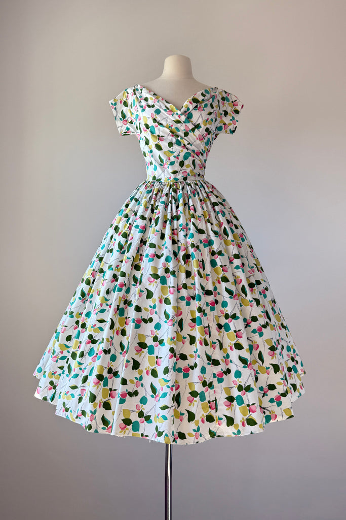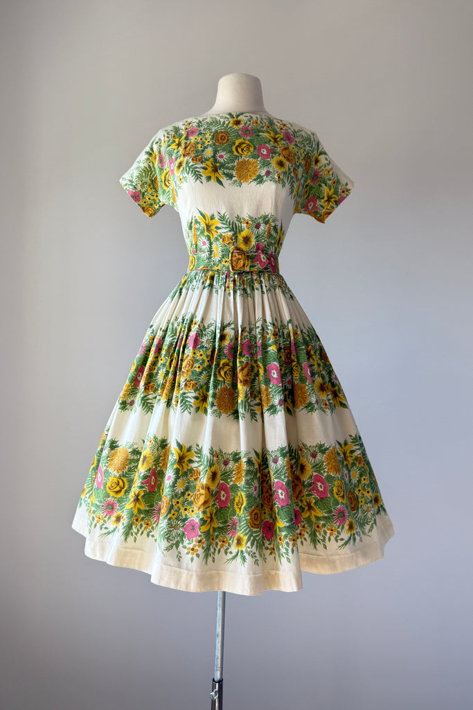 Vintage 1950s Beige Garden Floral Print Dress by Kay Windsor | XS/S