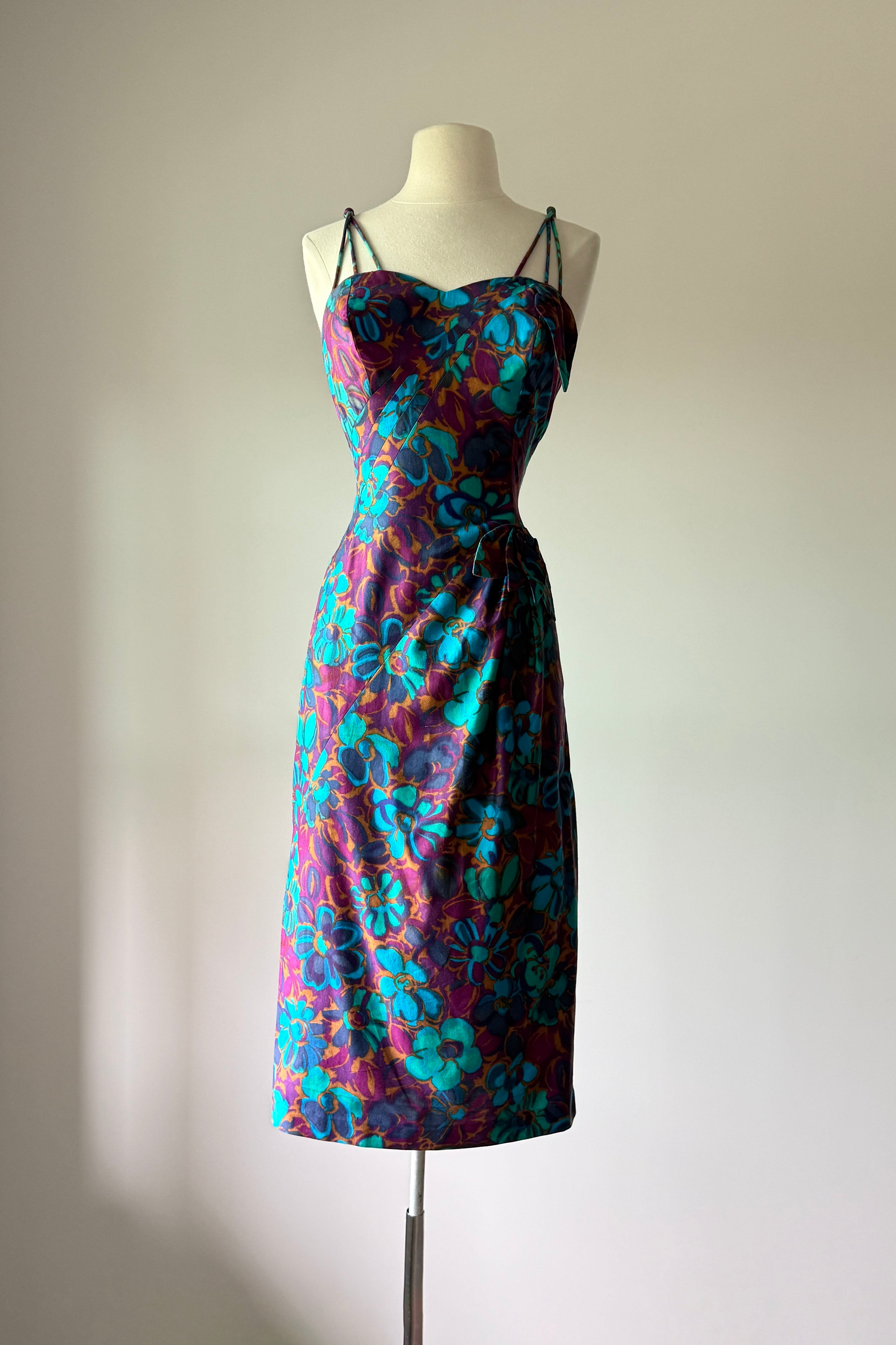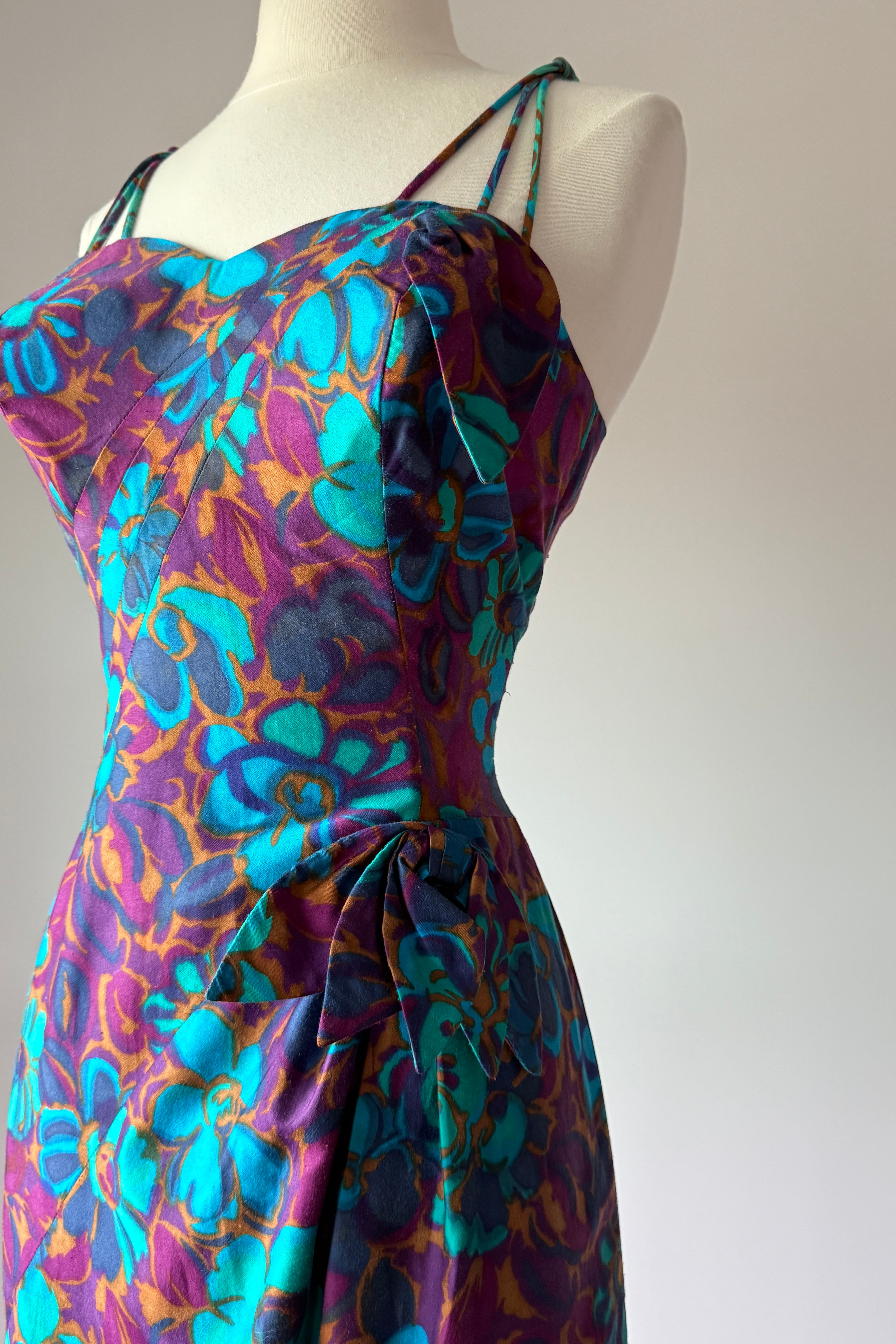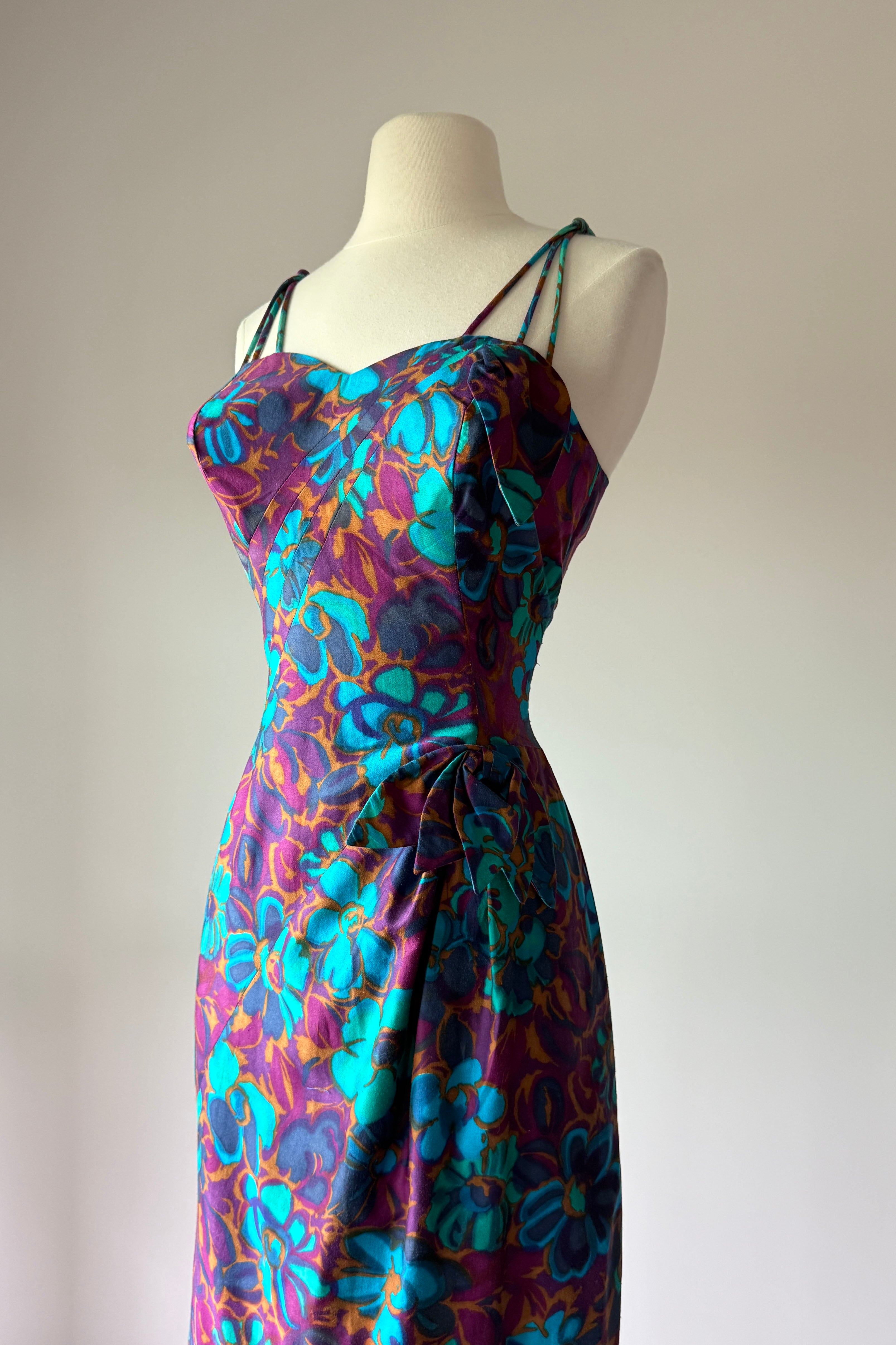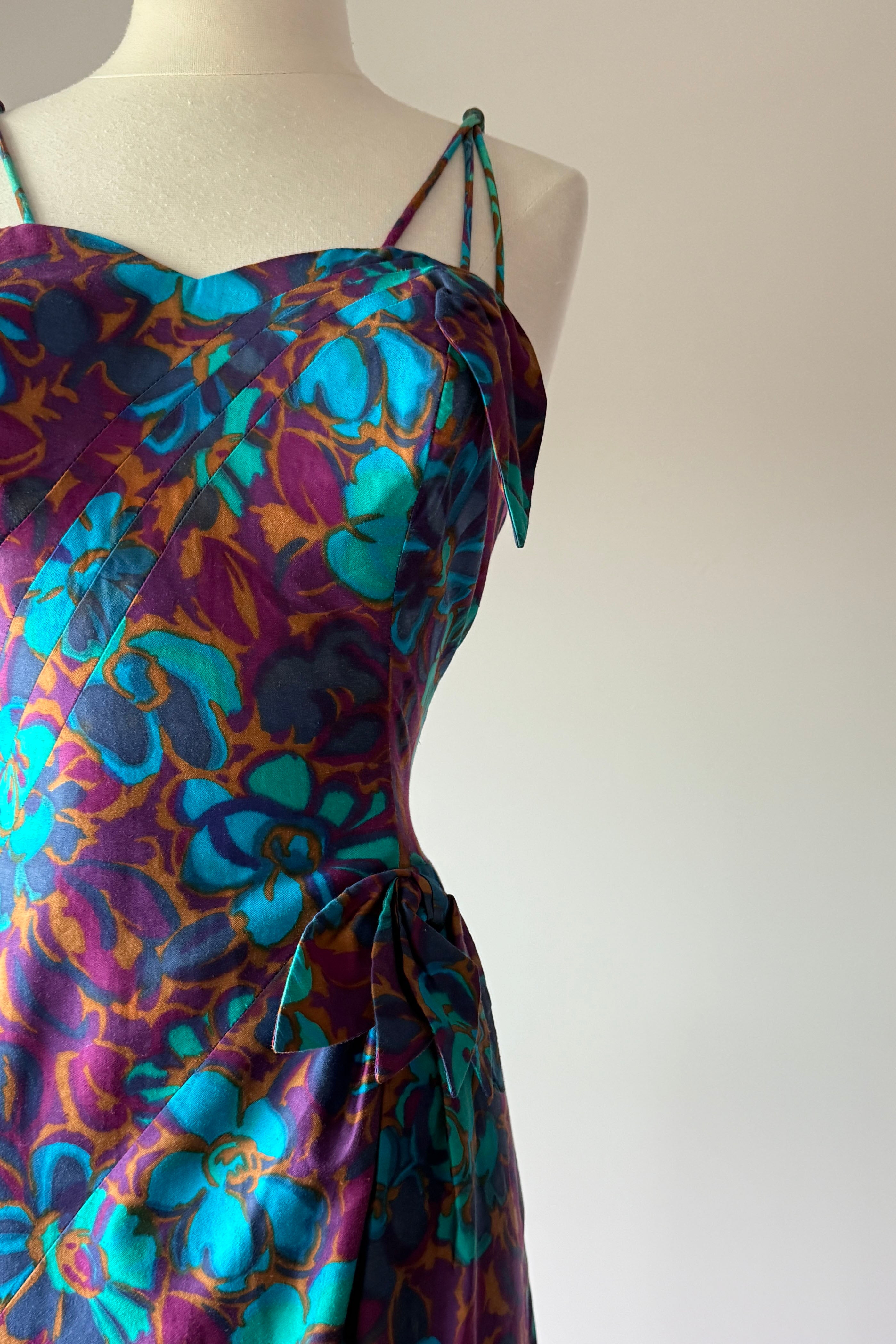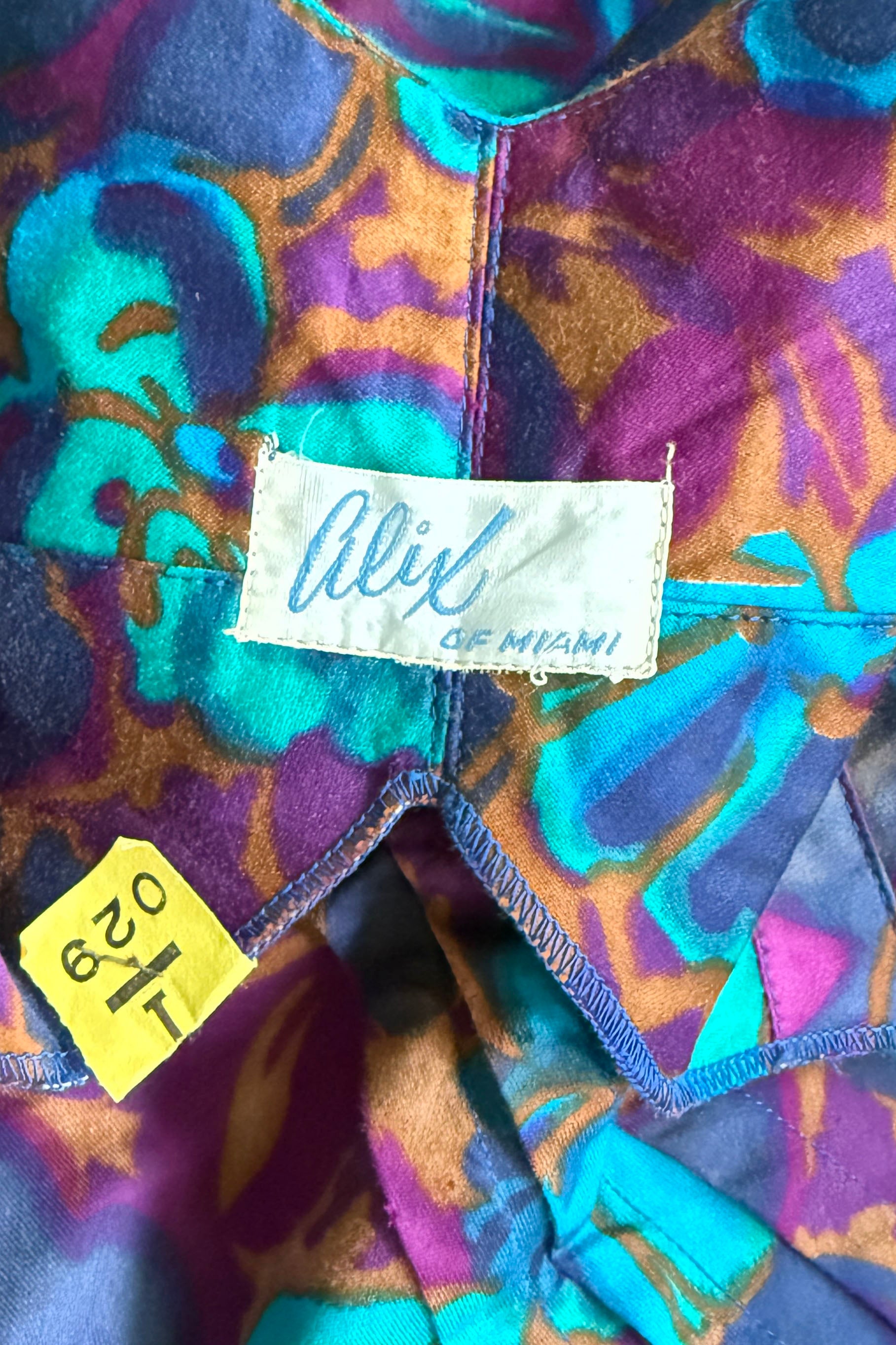 VINTAGE DRESS Vintage 1940s dress. Features deep blue and plum watercolor floral print, molded bust, metal back zipper. Trademark Alix seams at waist for flattering fit. Brushed cotton. By Alix of Miami. Excellent condition. Fits like SMALL.Length 45Bodice 16Bust 34Waist 28Hip 38-39As with all vintage, please expect wear consistent with age. All sales are final. No order cancellations.0995 | 2615
