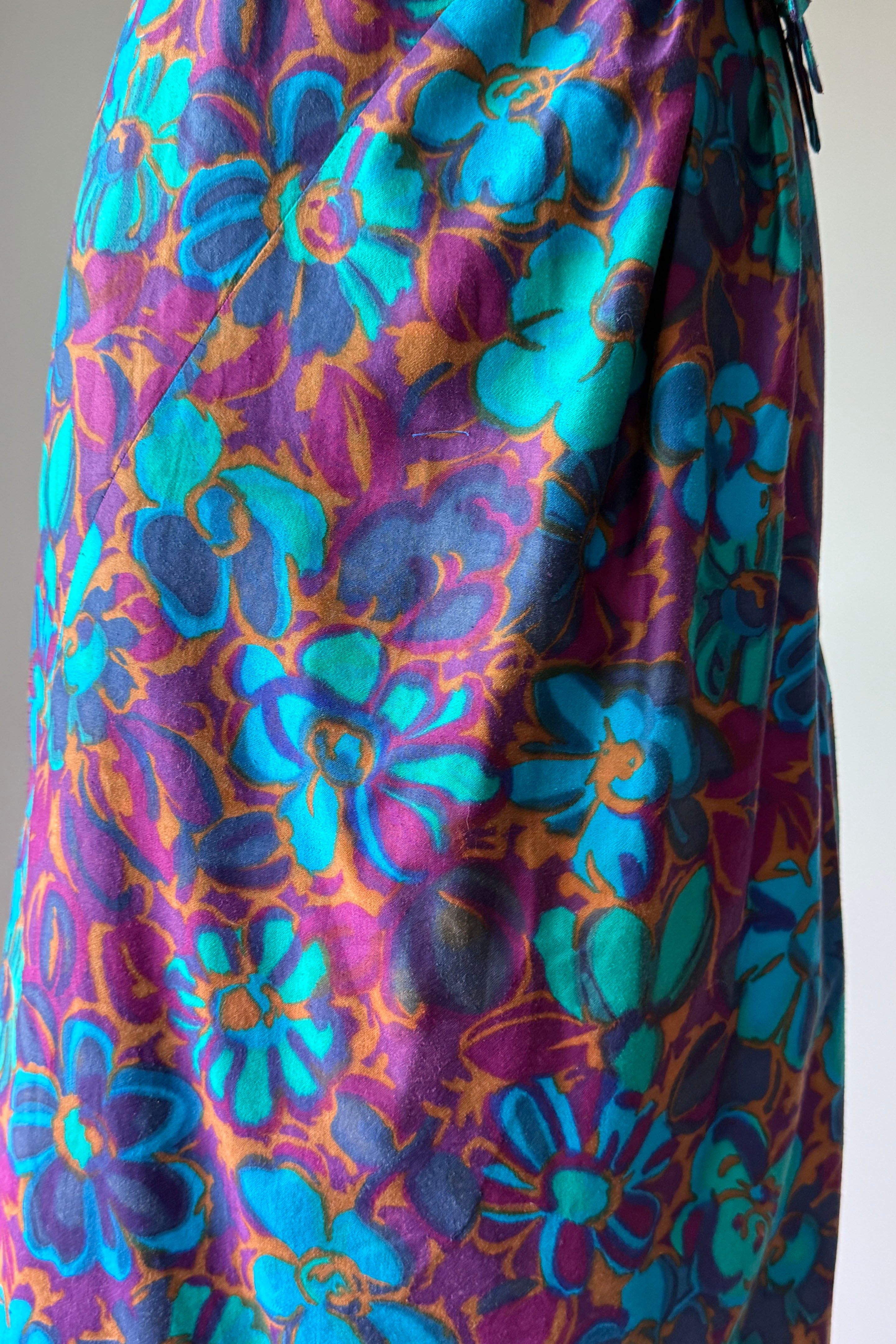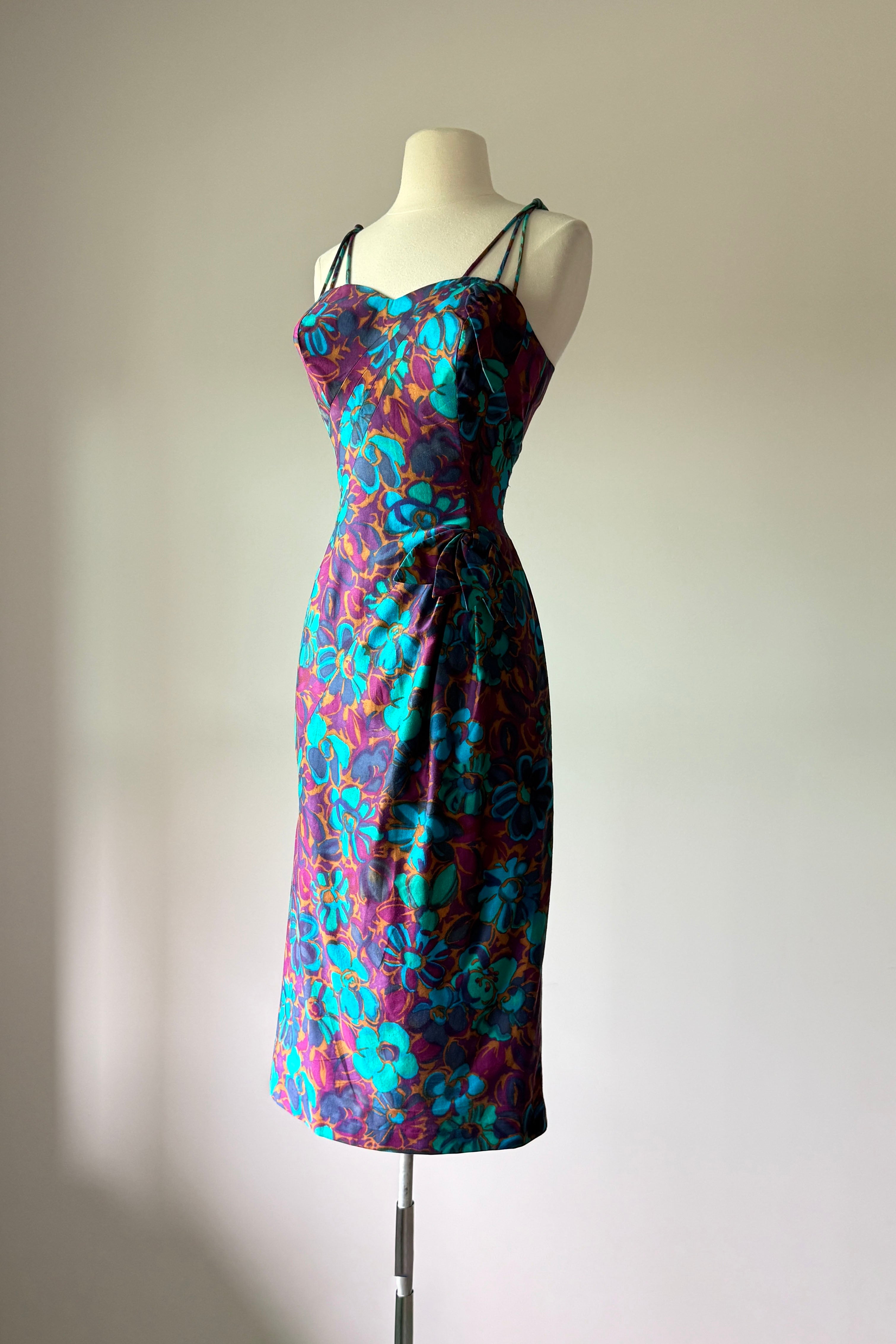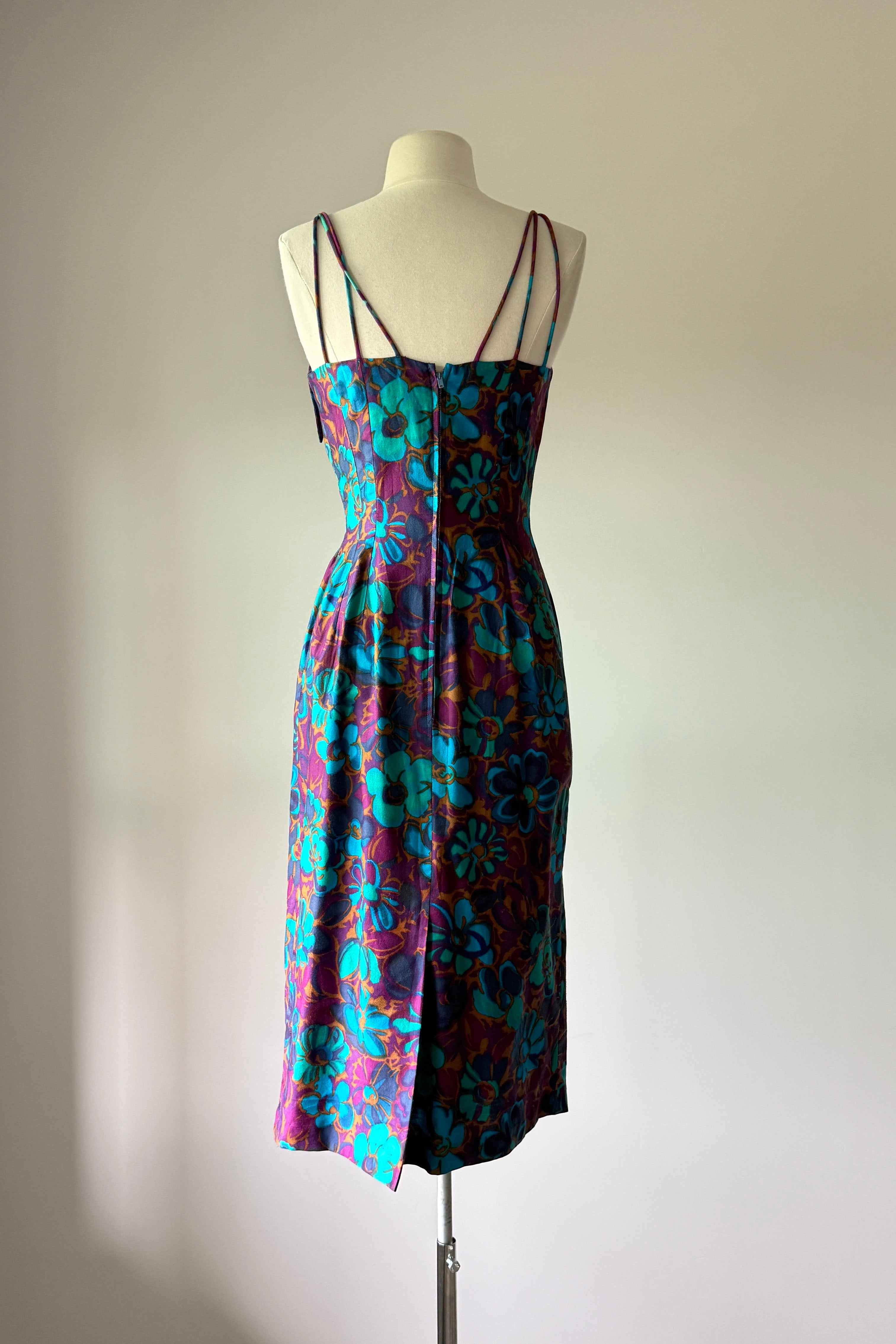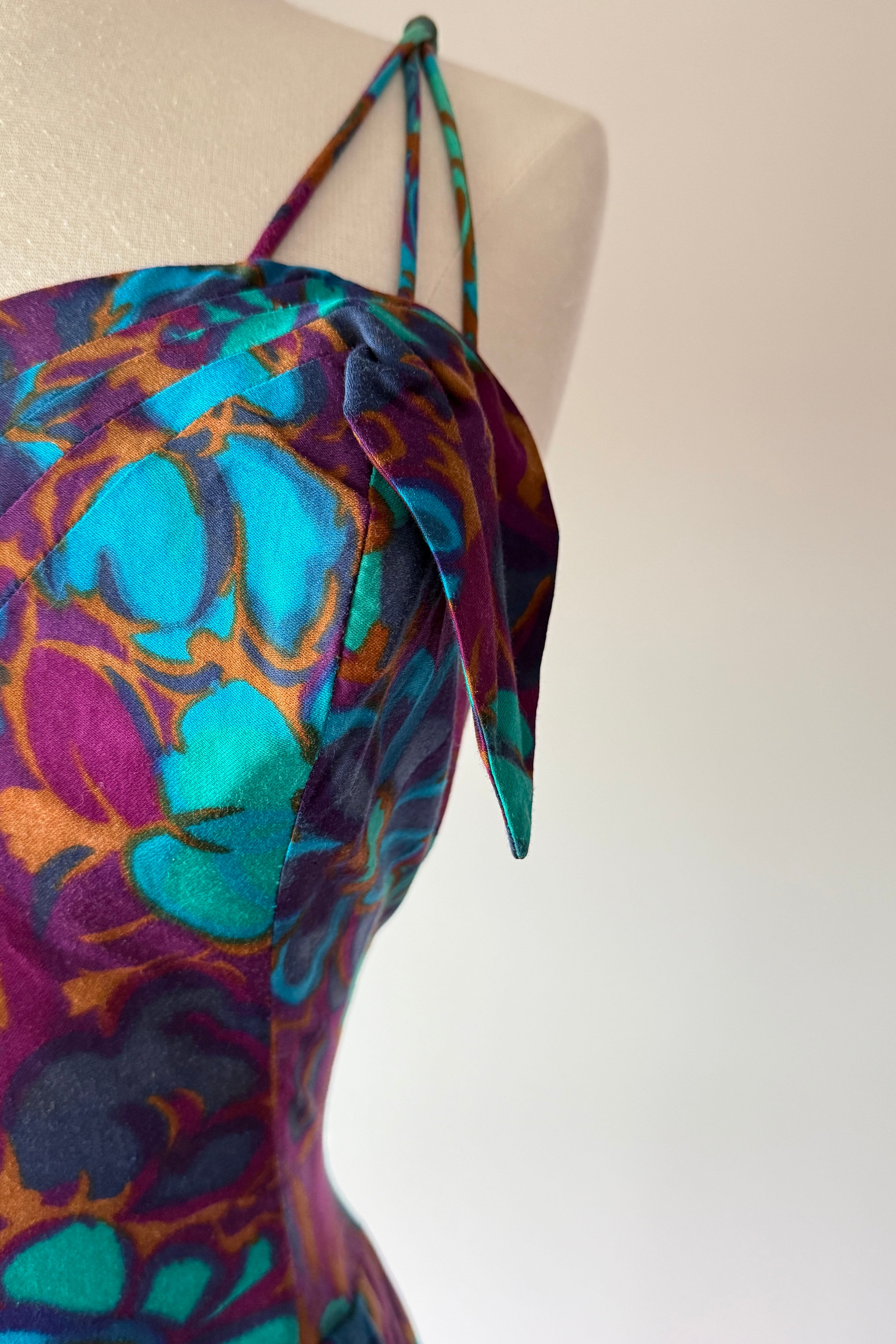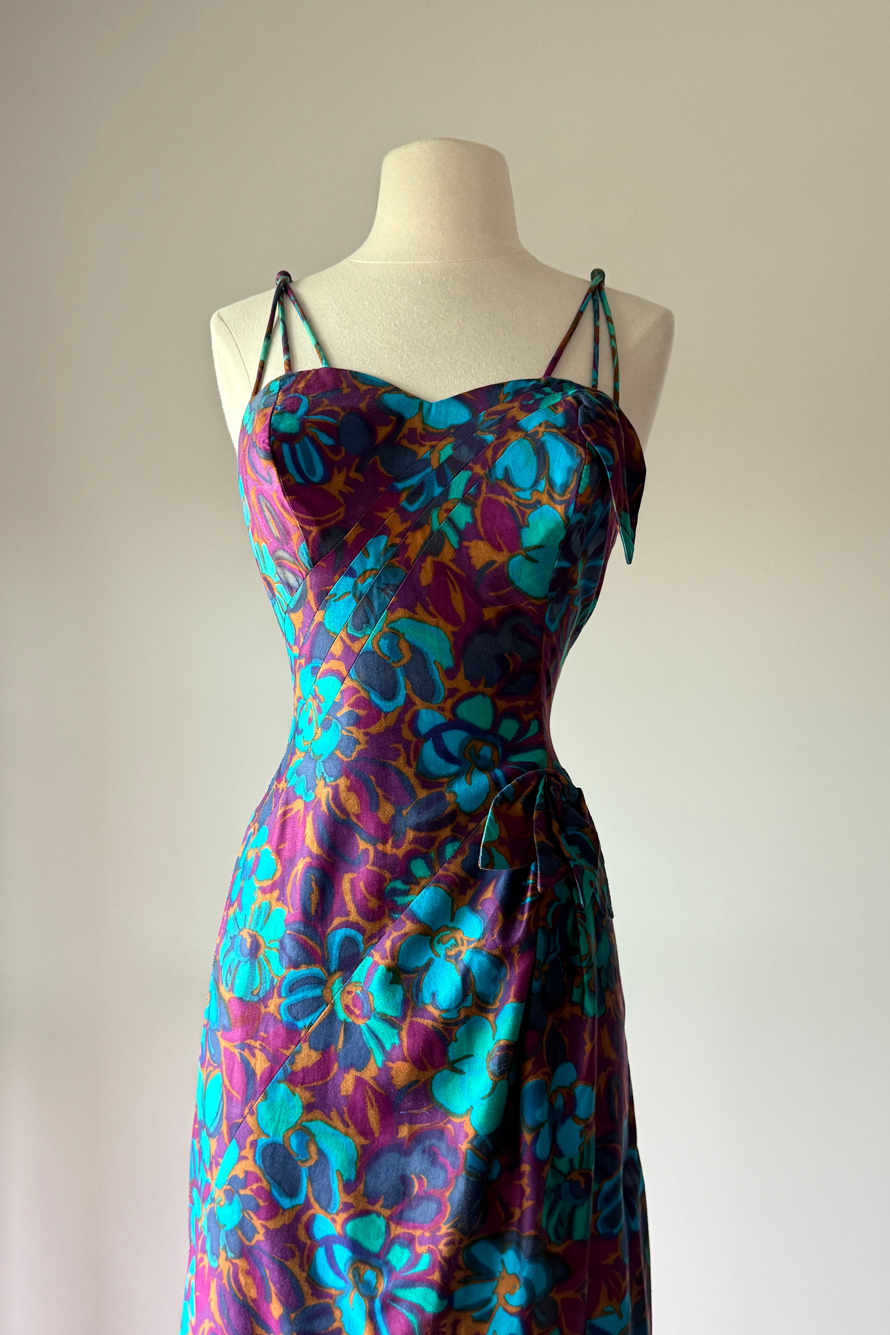 VINTAGE DRESS Vintage 1940s dress. Features deep blue and plum watercolor floral print, molded bust, metal back zipper. Trademark Alix seams at waist for flattering fit. Brushed cotton. By Alix of Miami. Excellent condition. Fits like SMALL.Length 45Bodice 16Bust 34Waist 28Hip 38-39As with all vintage, please expect wear consistent with age. All sales are final. No order cancellations.0995 | 2615