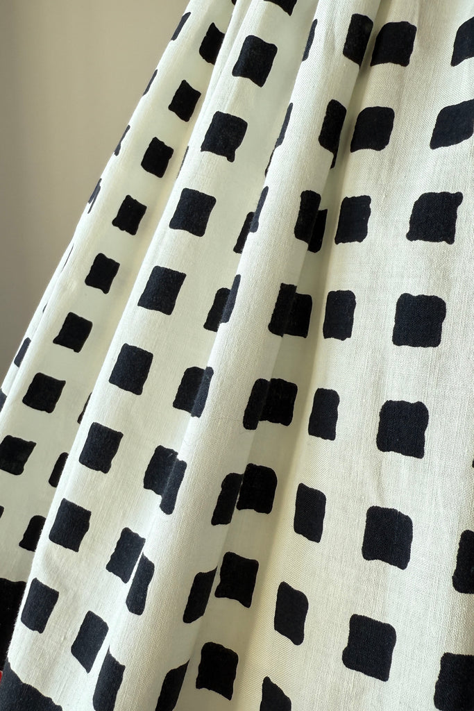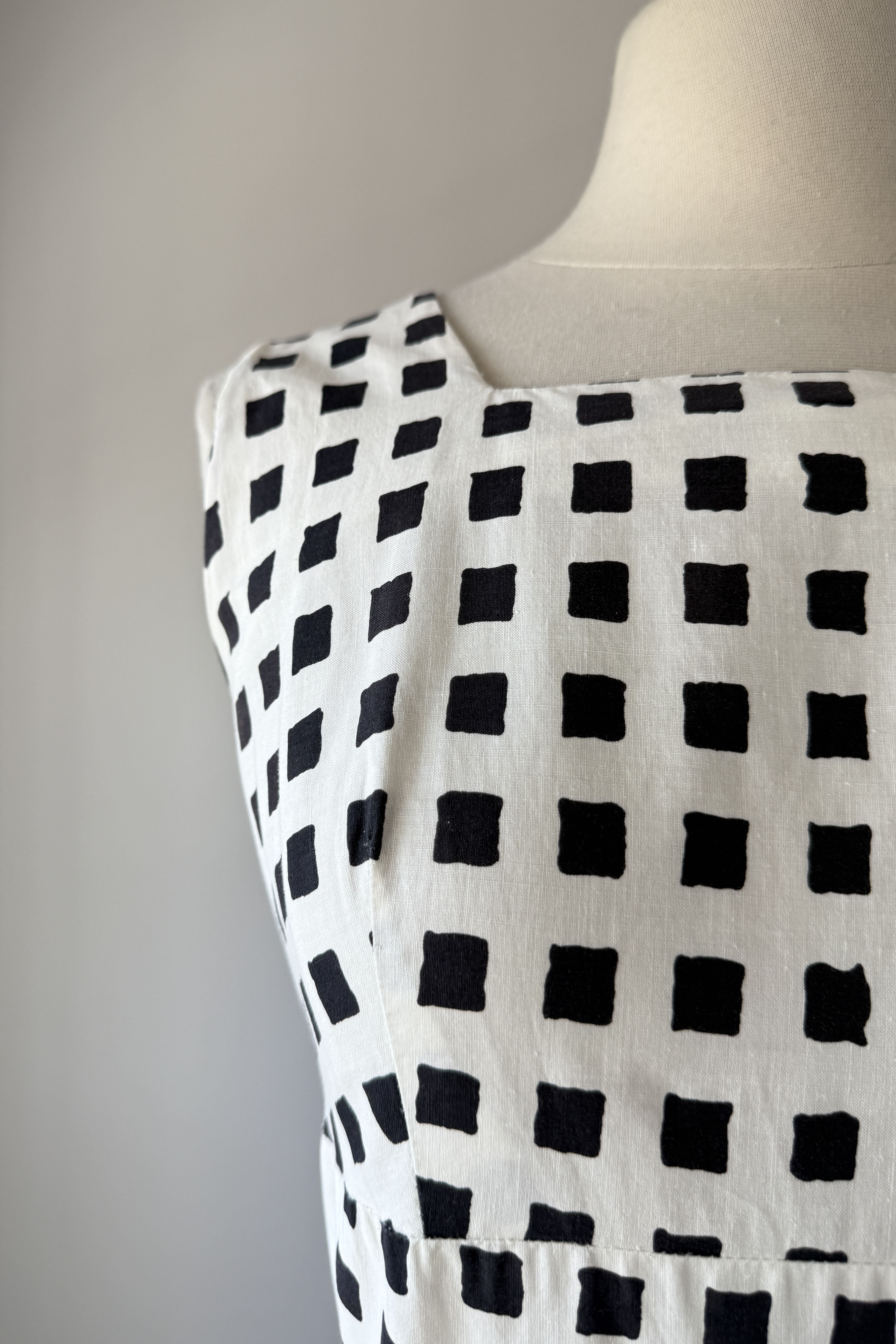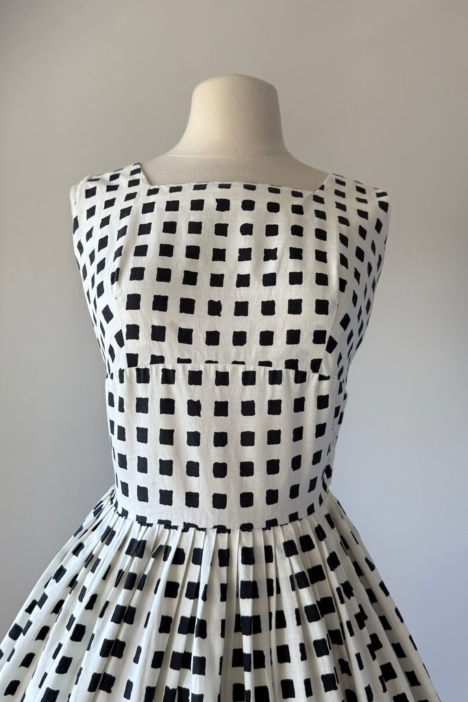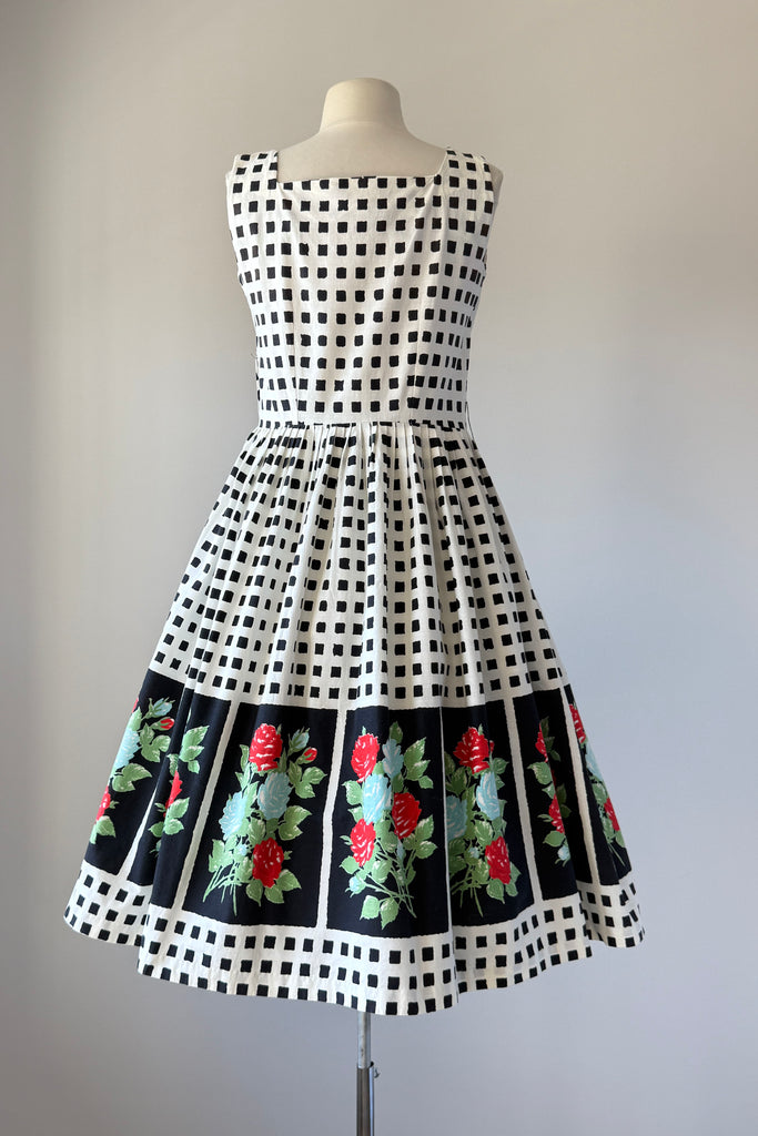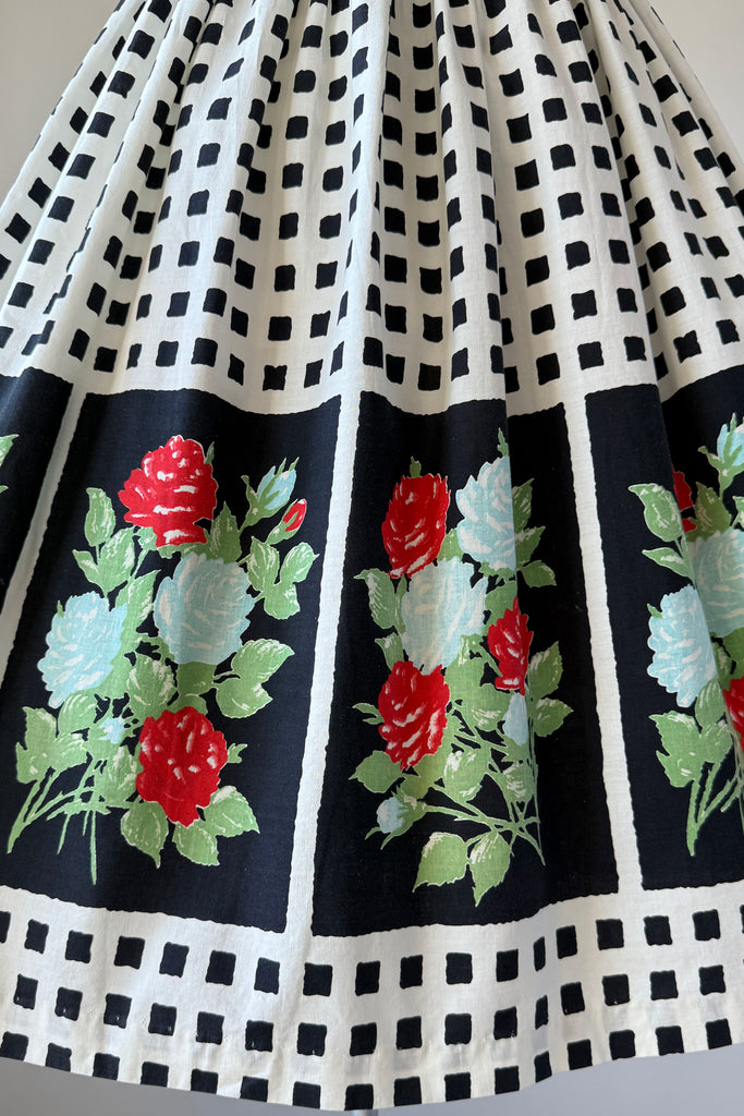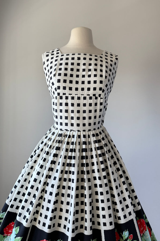 1950s cotton dress featuring a bold black and white grid print with a vibrant red and mint rose border along the full skirt. Classic fit-and-flare silhouette with a wide neckline and metal side zipper. Freshly laundered and ready to wear. Excellent condition. Best fits a modern S/Mlength: 42.5"bodice: 15.5"bust: 37"waist: 28–29"bodice allowance: 2" Ref 0654 | 2541