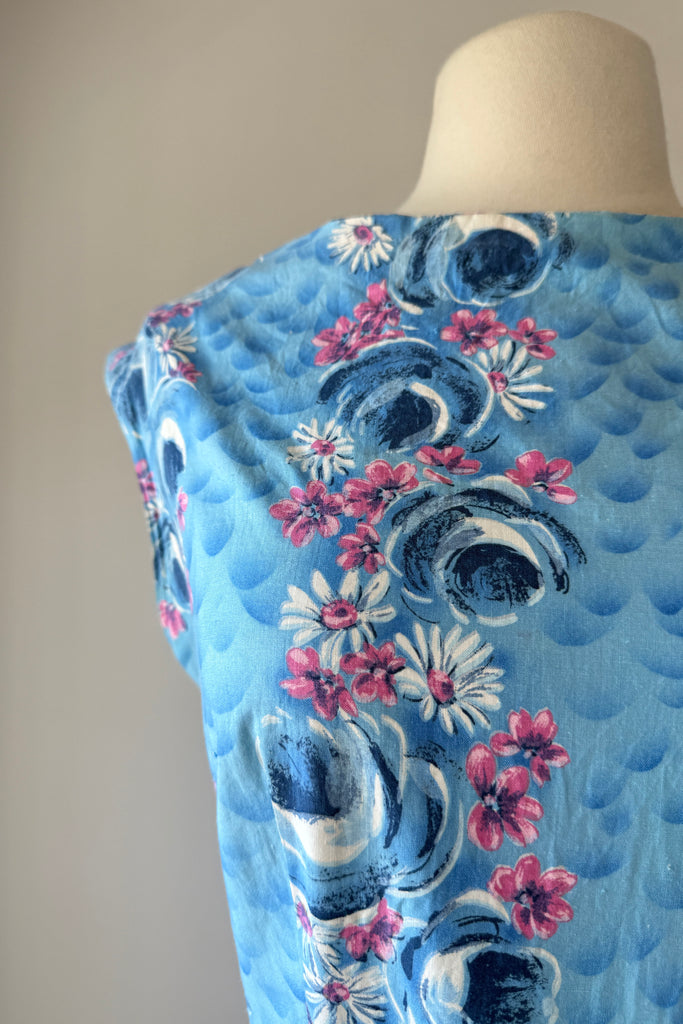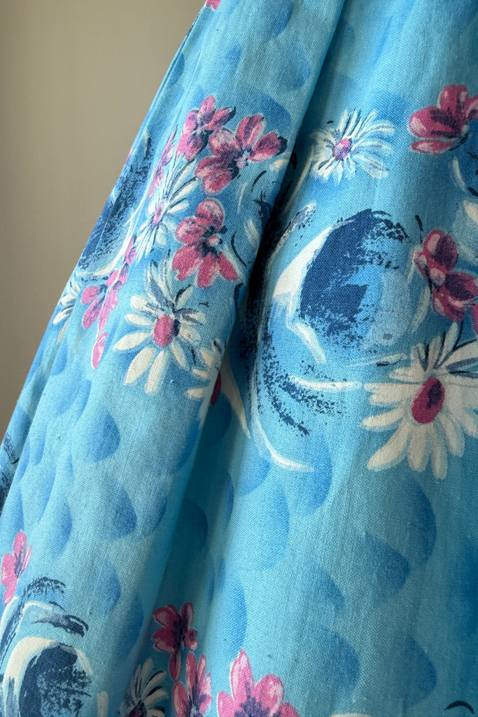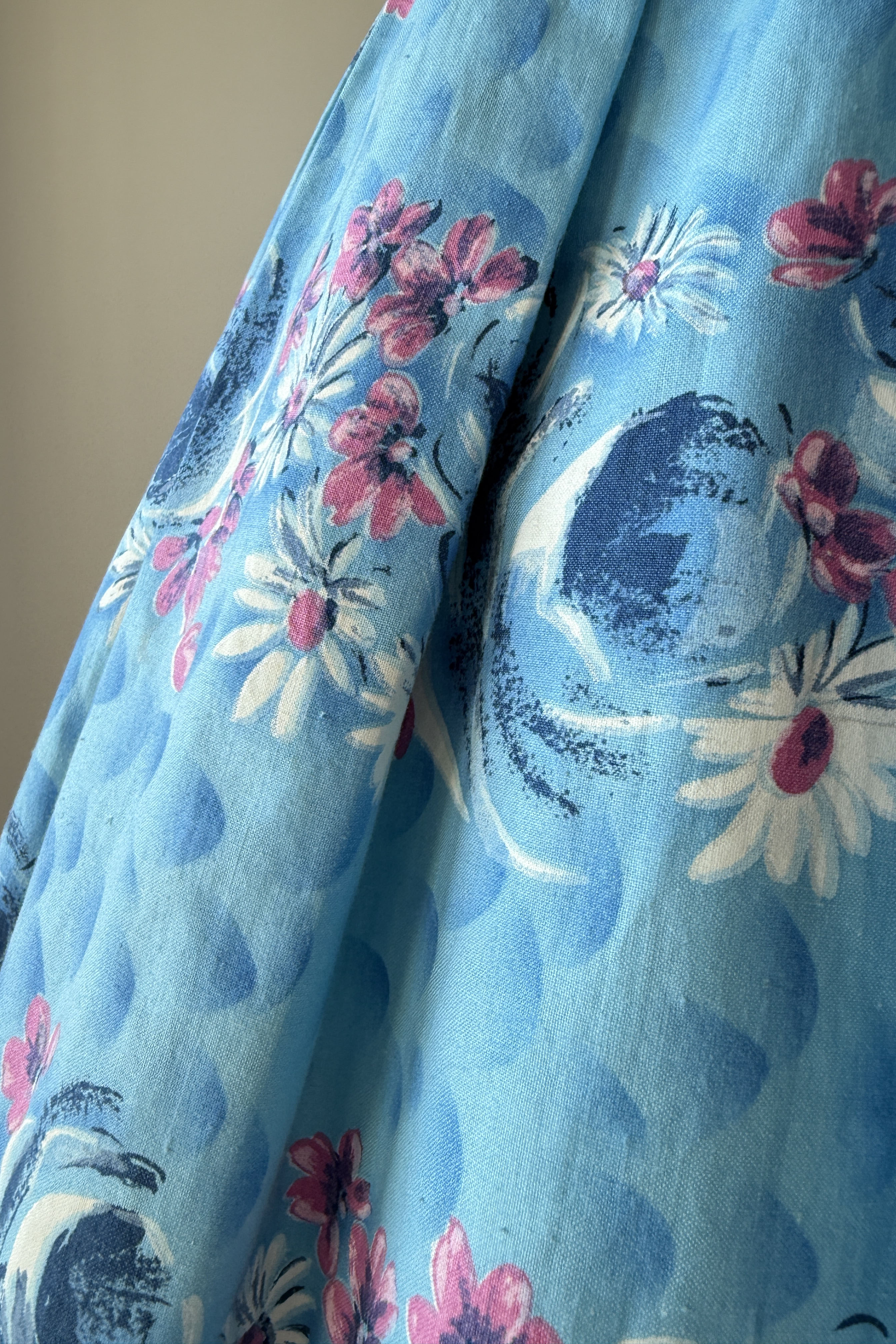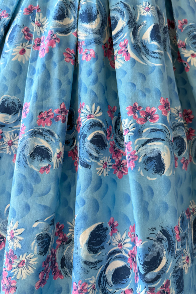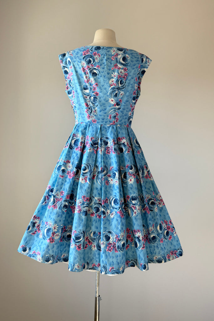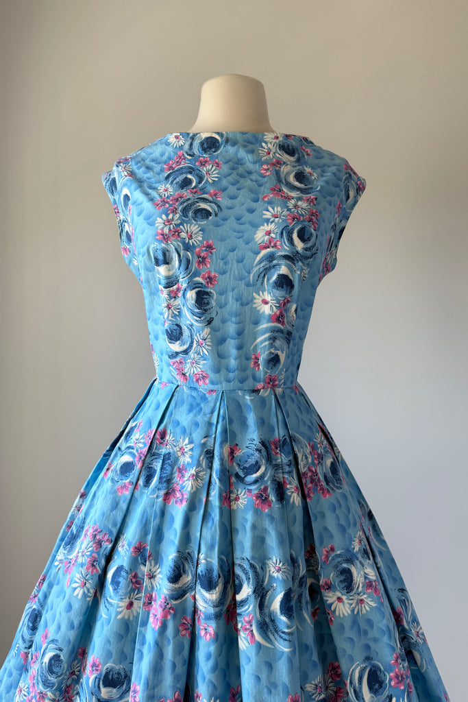 1950s blue-on-blue cotton dress with watercolor florals in navy, white, and pink. The subtle textured pattern adds depth to the fabric, while the pleated skirt creates a soft, full silhouette. Features a fitted bodice with cap sleeves and a metal side zipper. Finished with a 1" hem allowance. Excellent condition. Best fits MEDIUMlength: 40"shoulder: 15"bust: 38"waist: 29"hem allowance 1" Ref 0664 | 2541