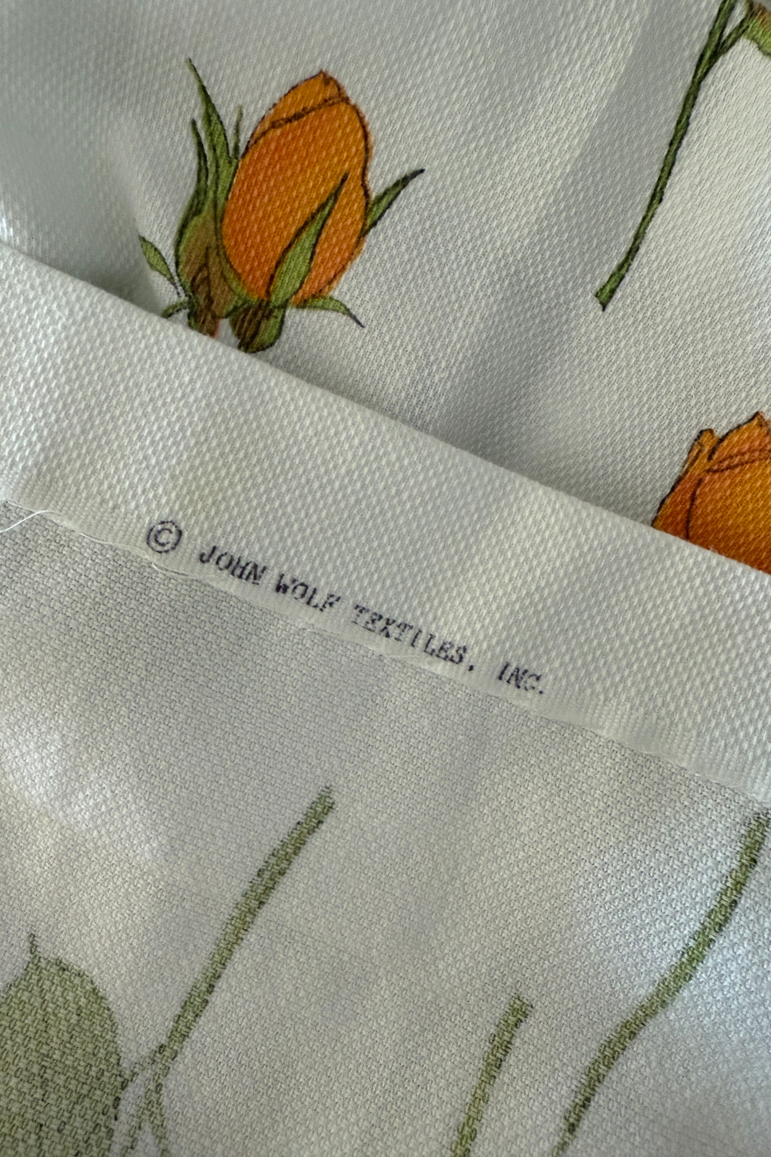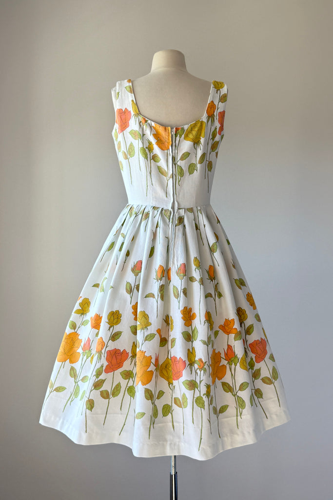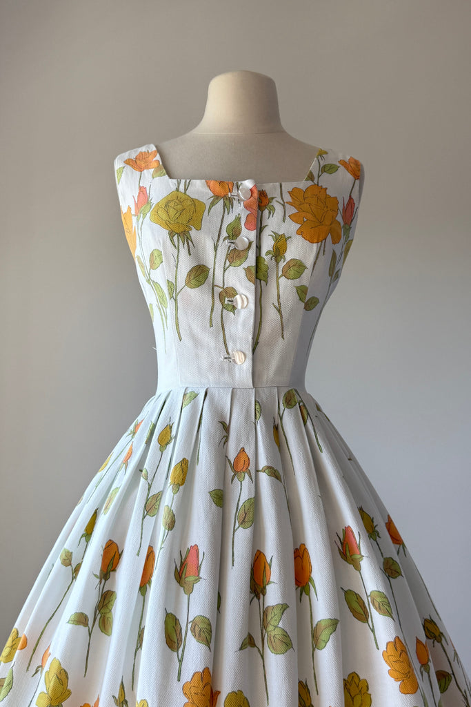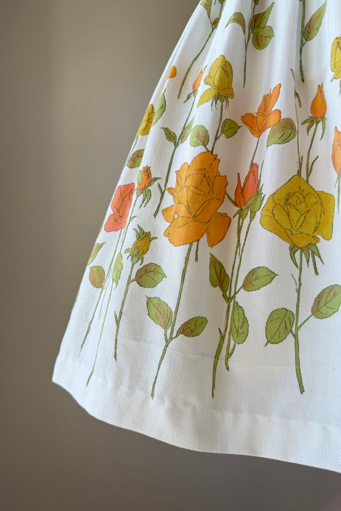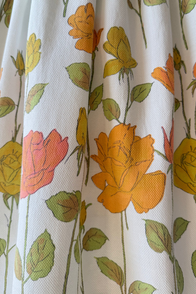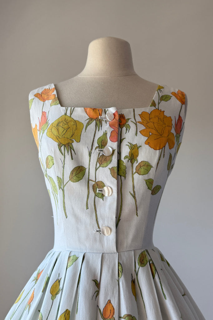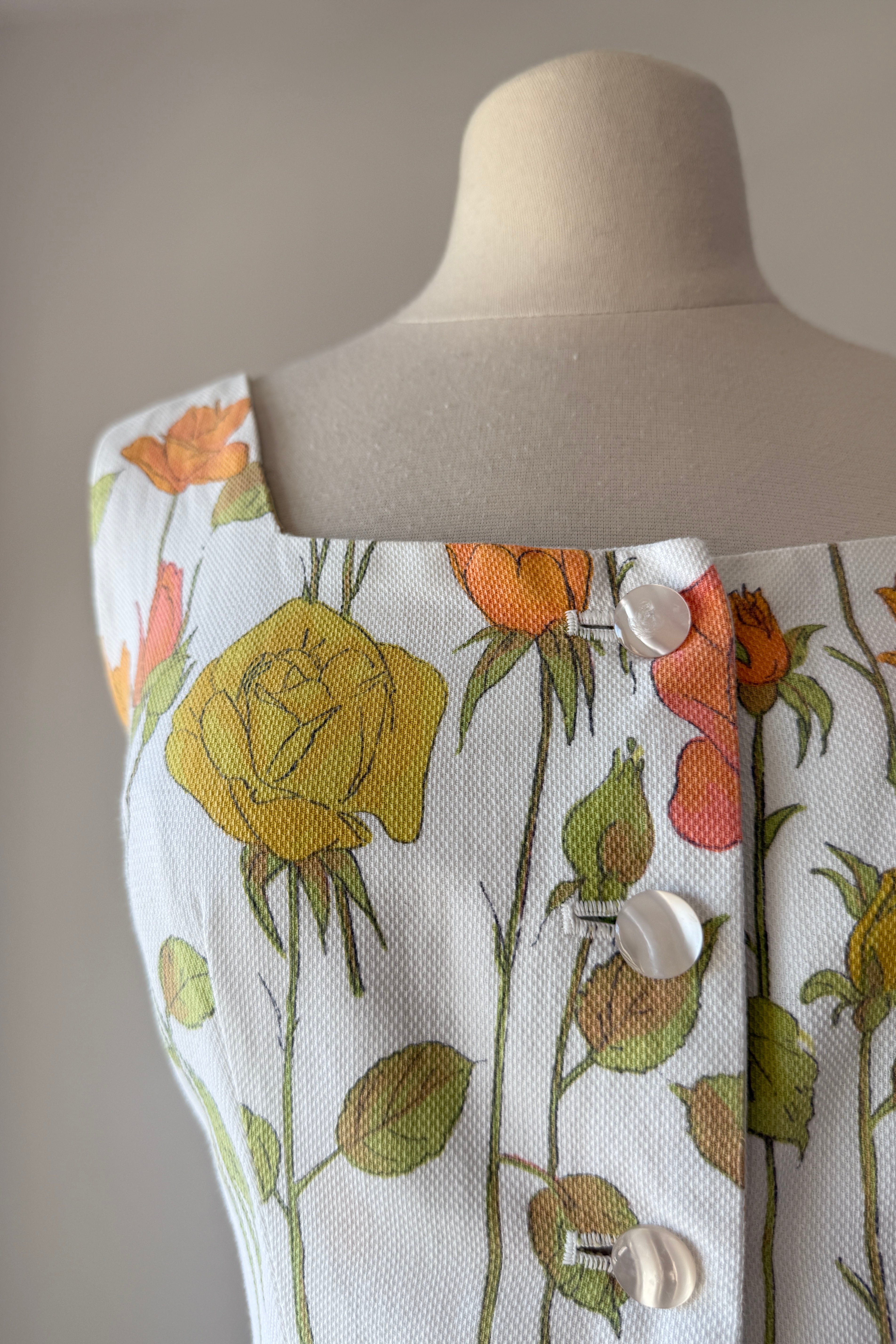 1960s cotton pique dress in orange and gold rose print by John Wolf Textiles. Features a structured sleeveless bodice with square neckline, functioning covered buttons down the front, and a pleated skirt. Metal back zipper closure. Hem shows a faint crease where it’s been previously let down. Freshly laundered and ready to wear. Excellent condition. Best fits a modern MEDIUMlength: 43"bodice: 16"bust: 38"waist: 28" Ref 0662 | 2541