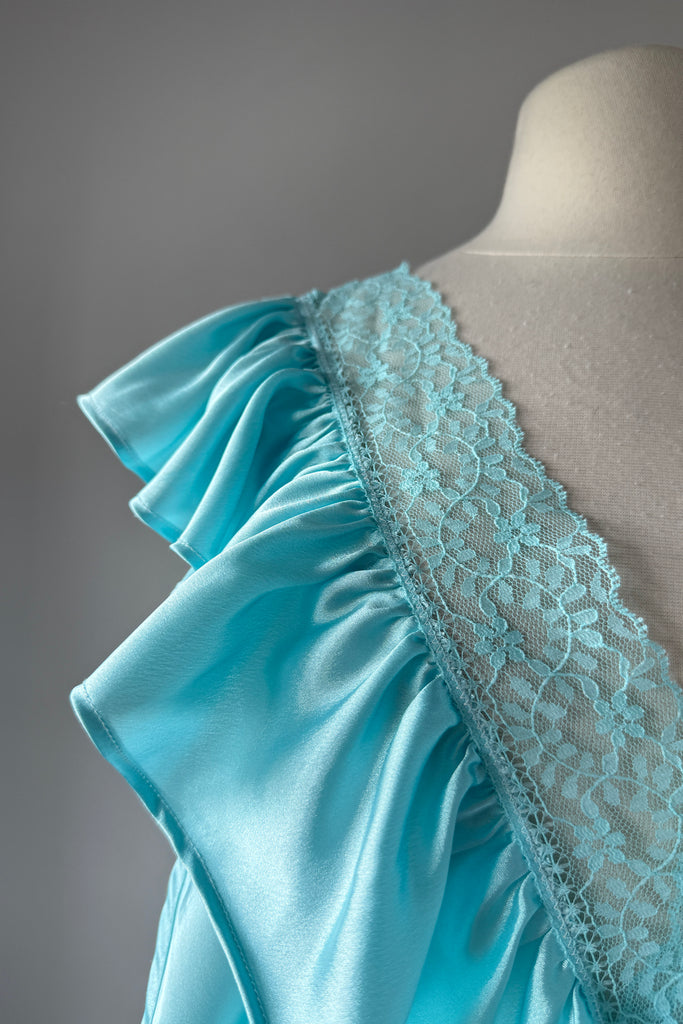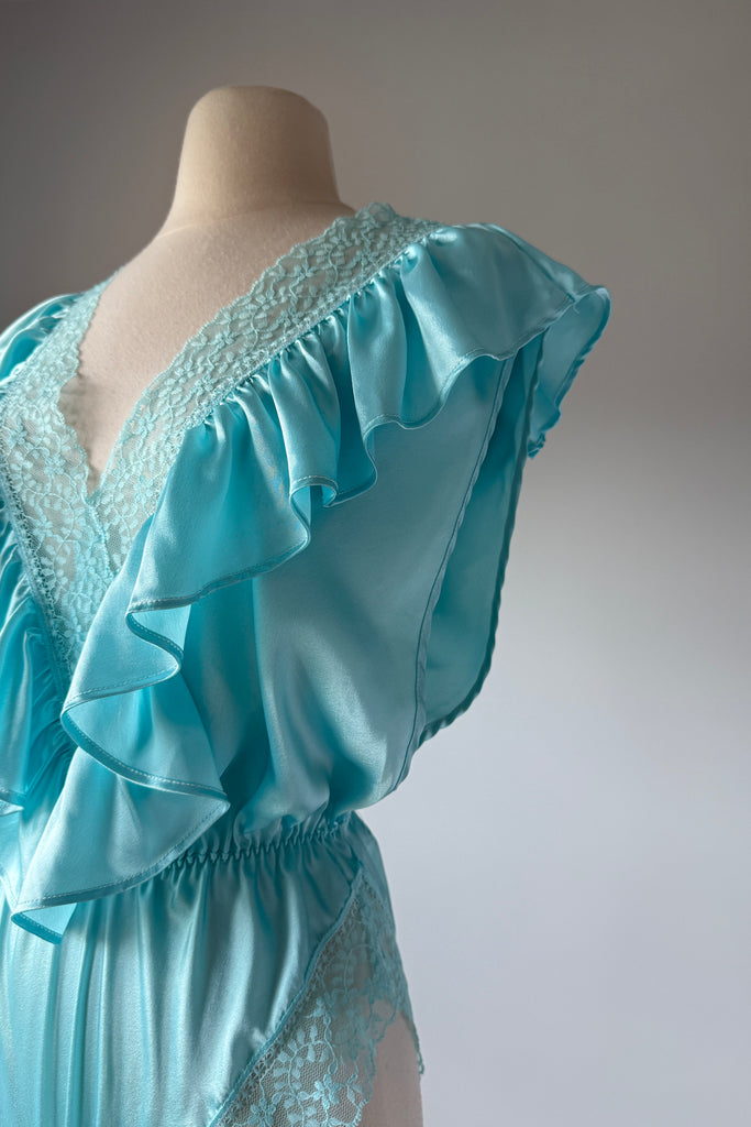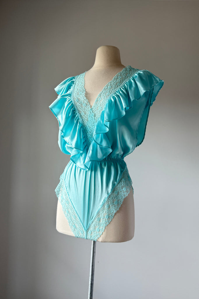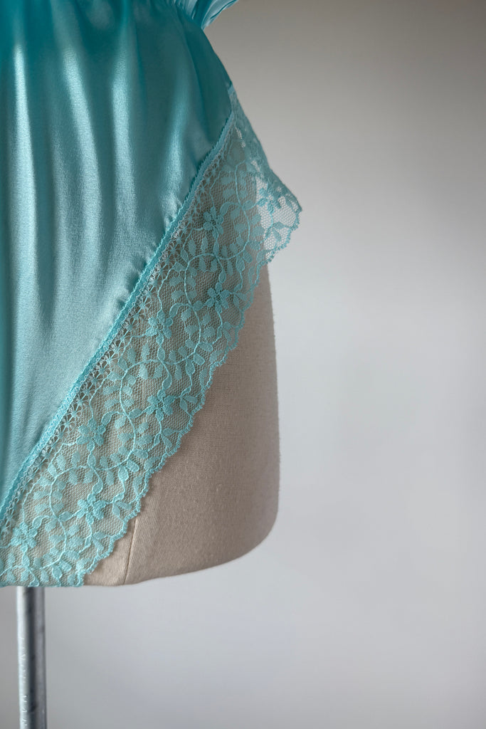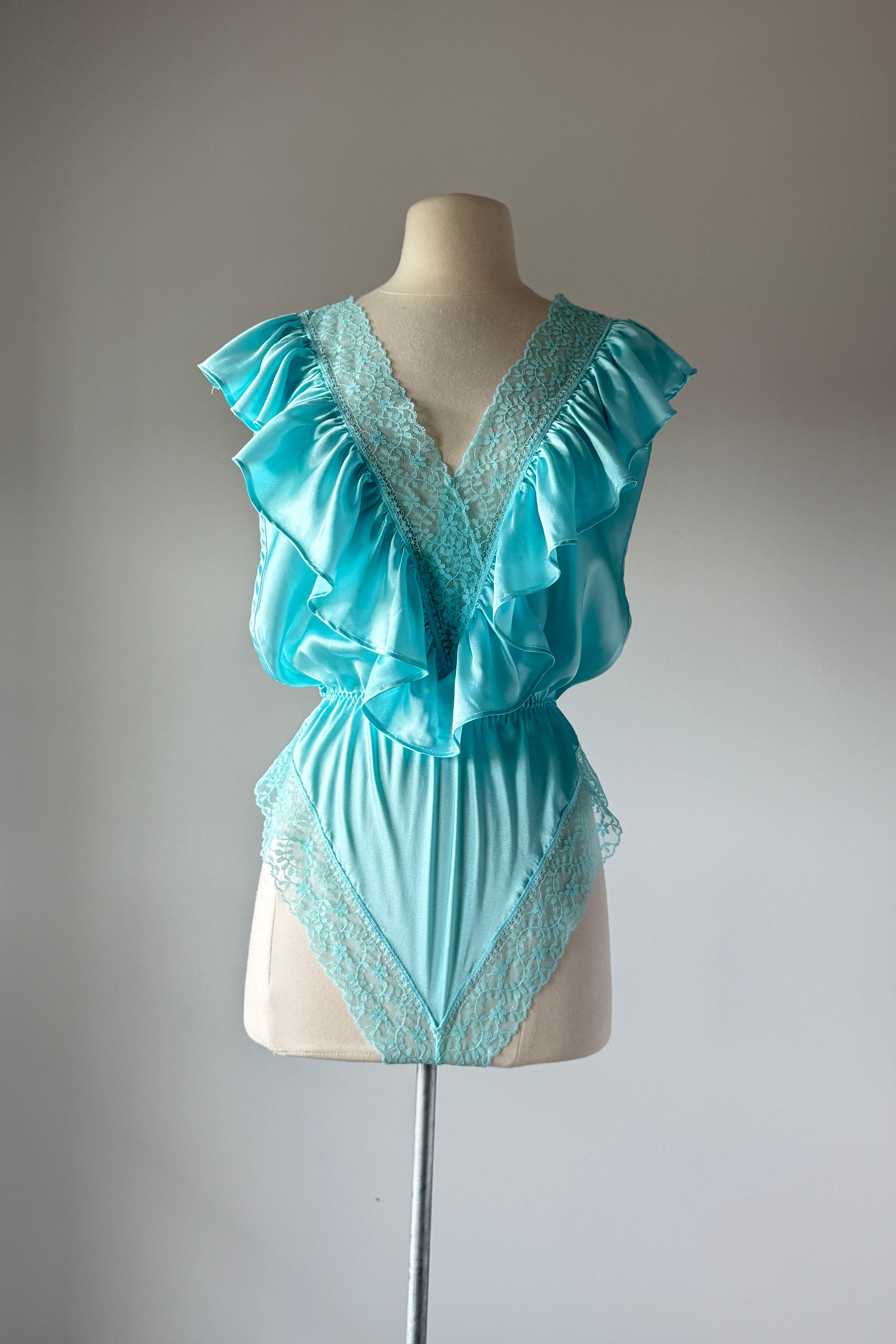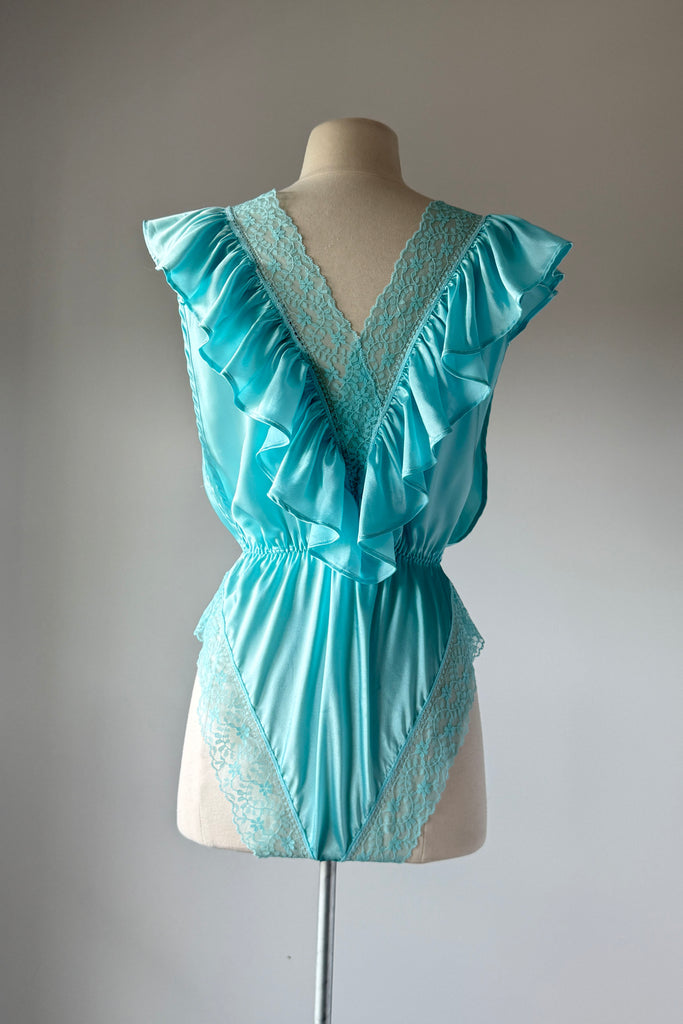 1980s blue nylon teddy by Lily of France. Lace trimmed, ribbon tie at waist.Excellent condition. Freshly laundered and ready to wear.Size MEDIUM2537 | 0577