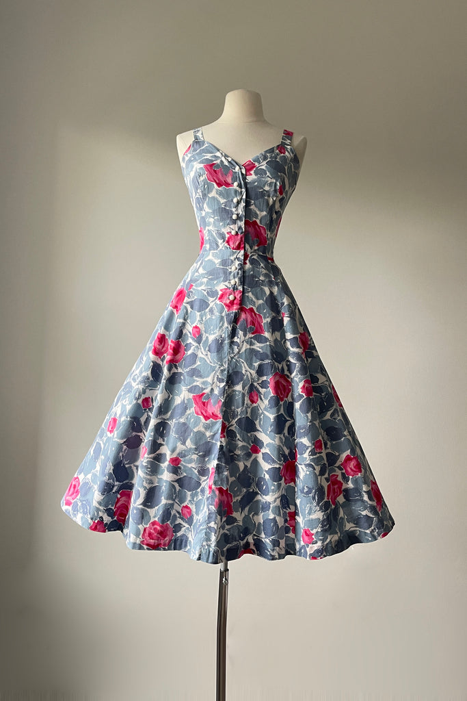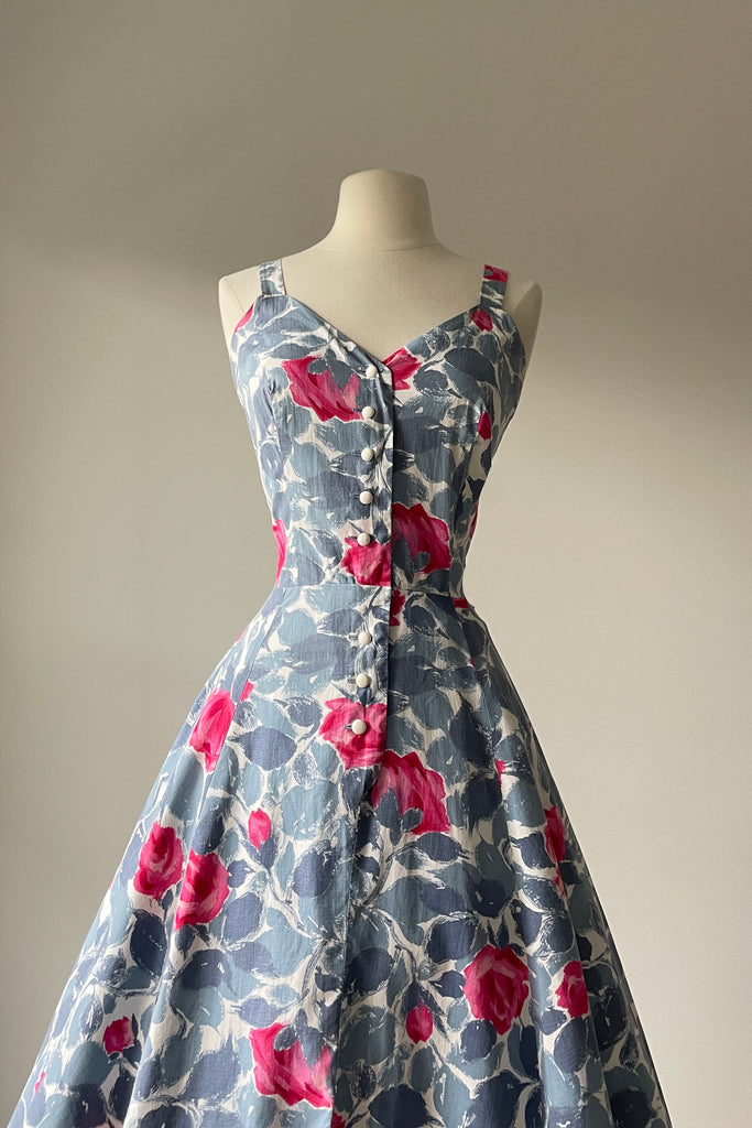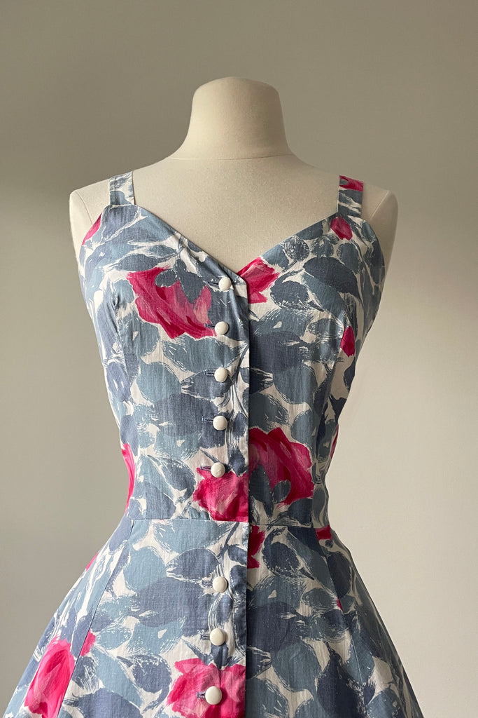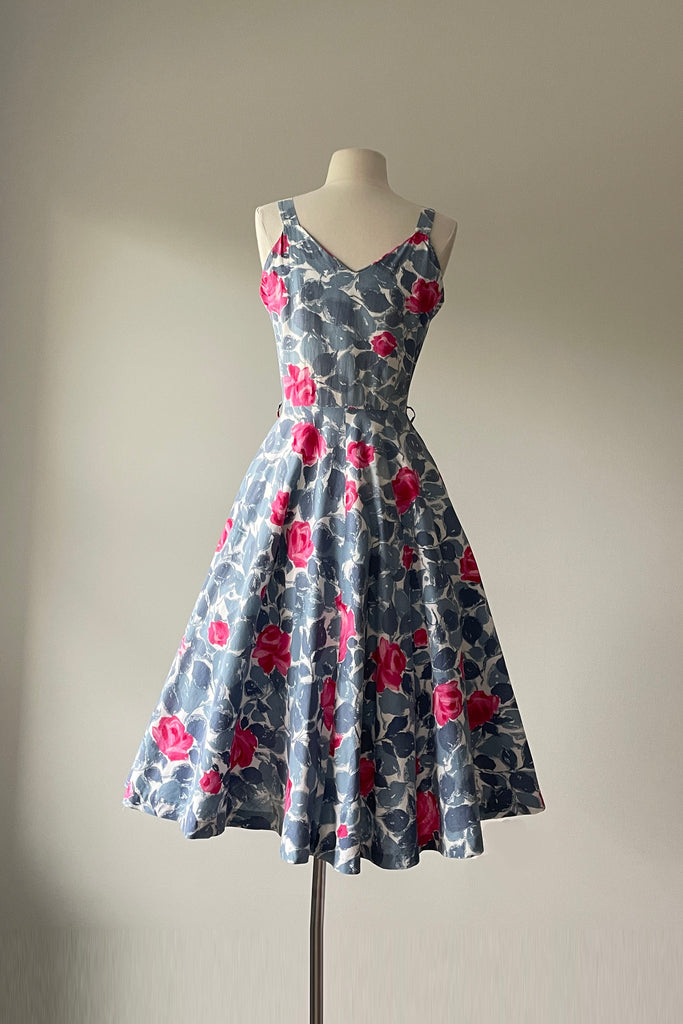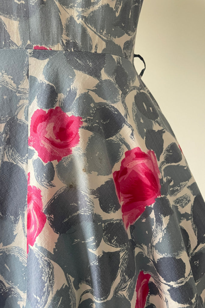 1950s Gray Pink Rose Print Sun Dress | XS/S