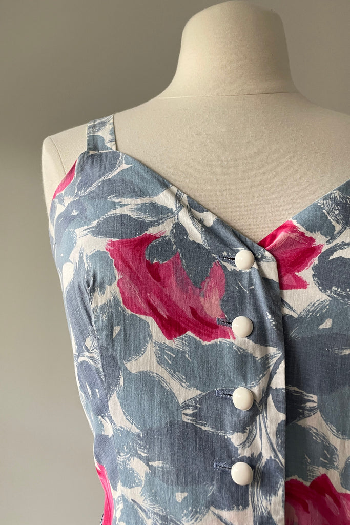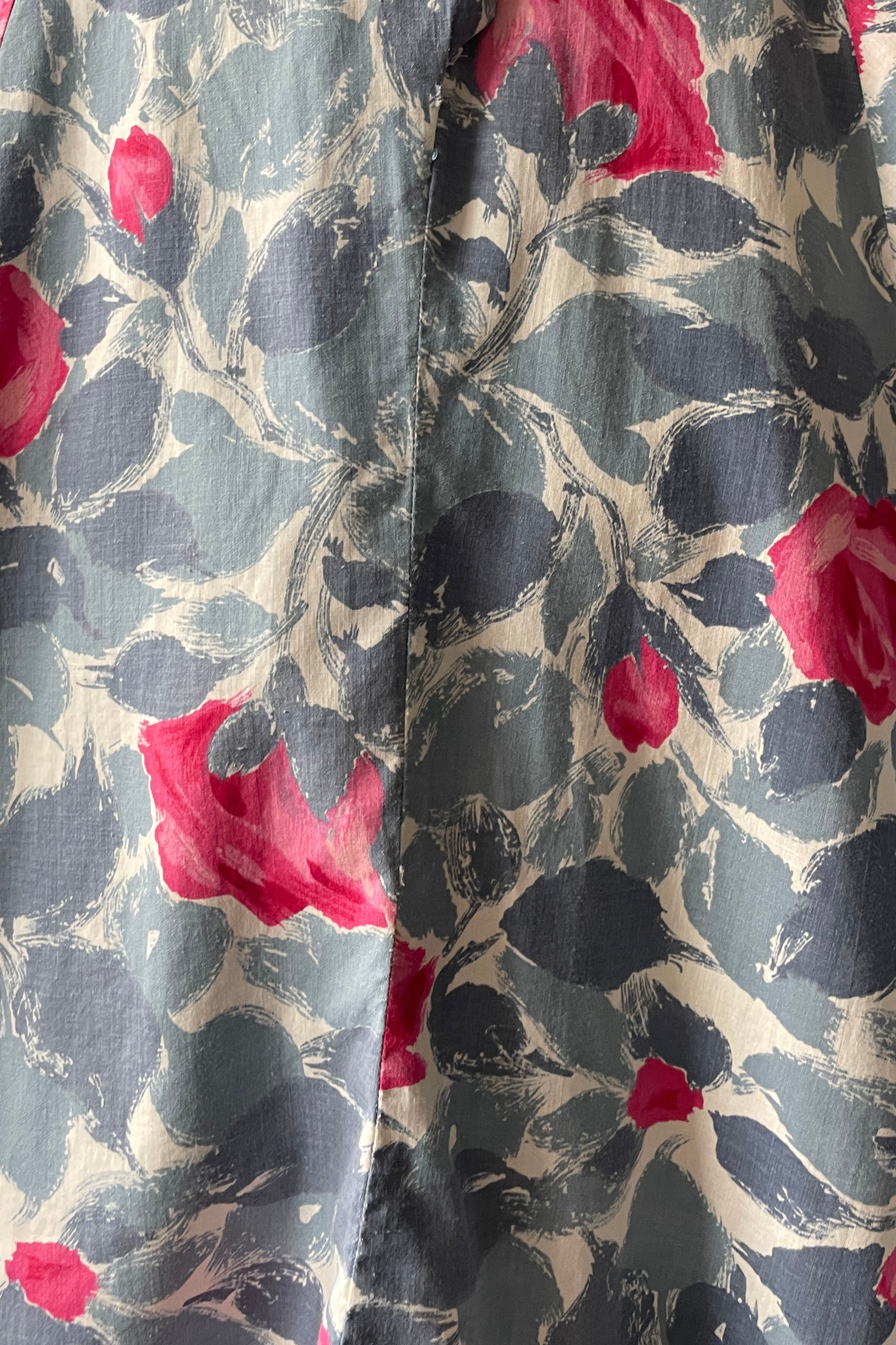 d e t a i l s : darling pink rose on gray background, white bubble buttons up front, right skirt pocket