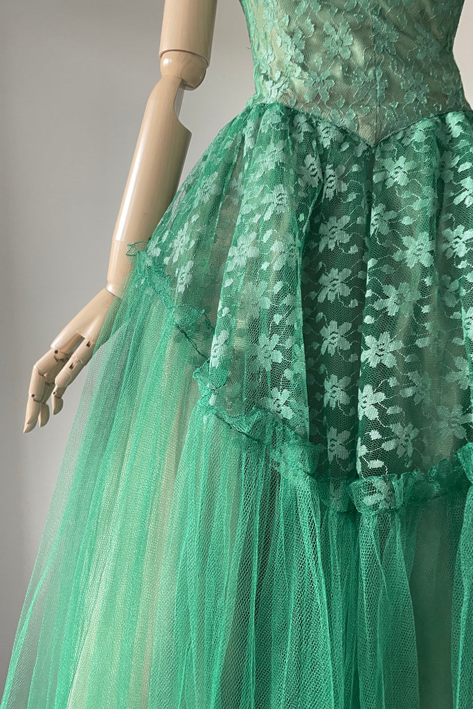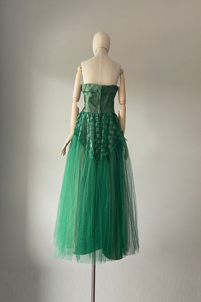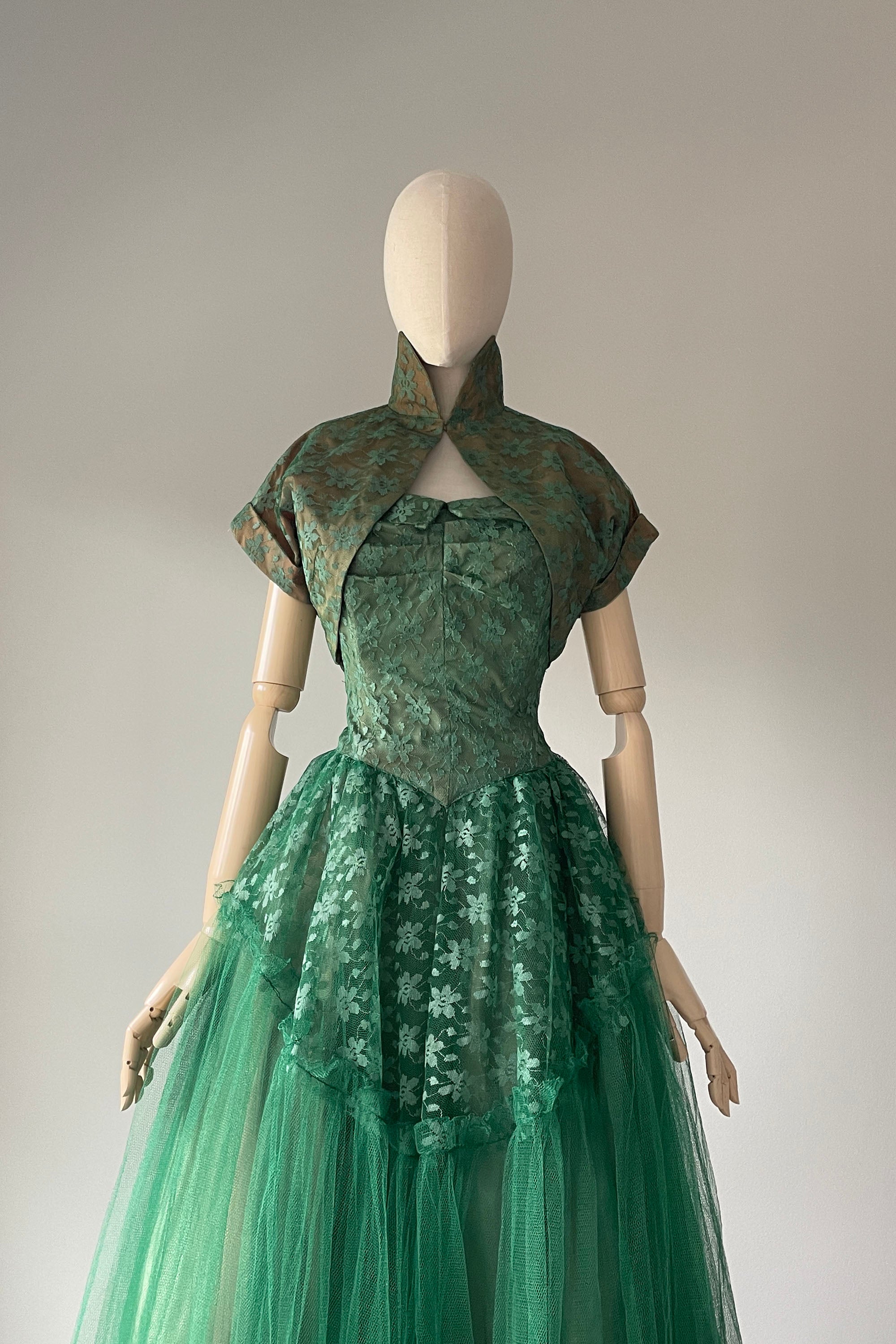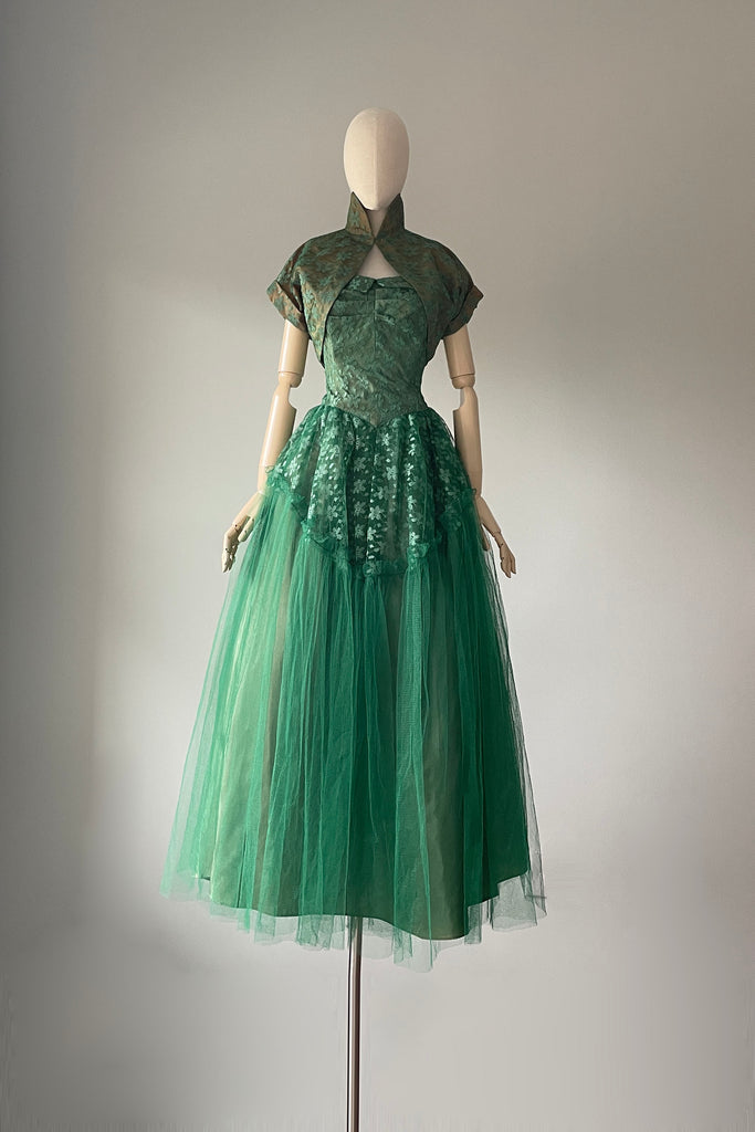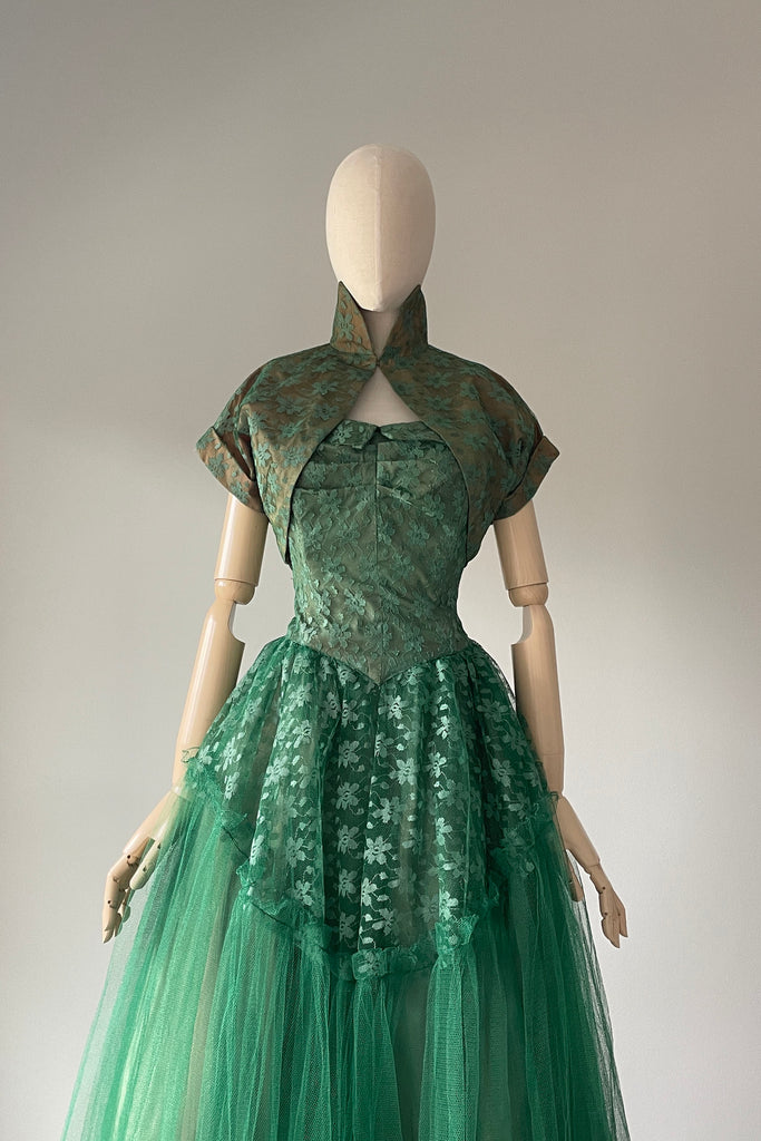 1950s Green Tulle Strapless Dress + Bolero | SMALL