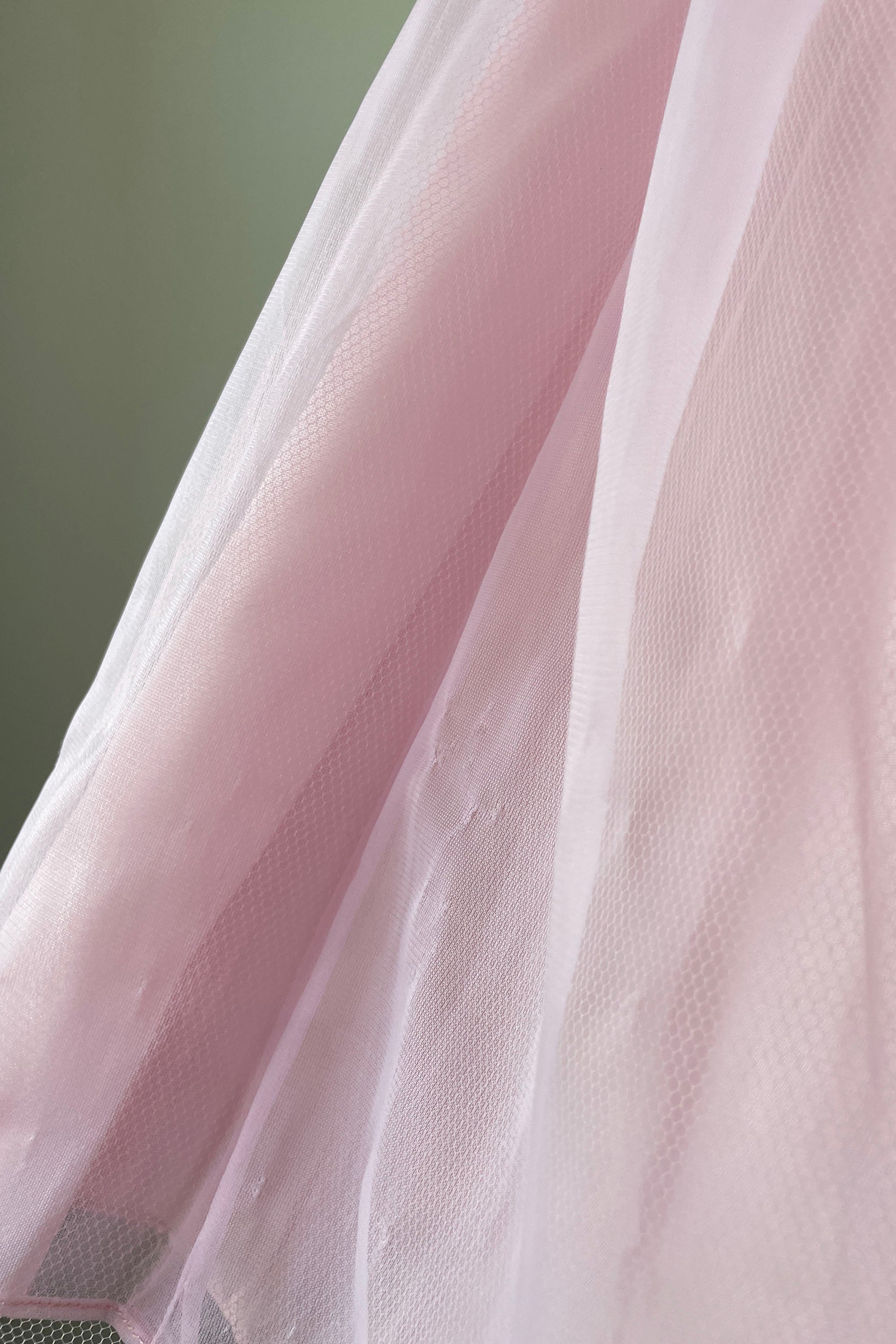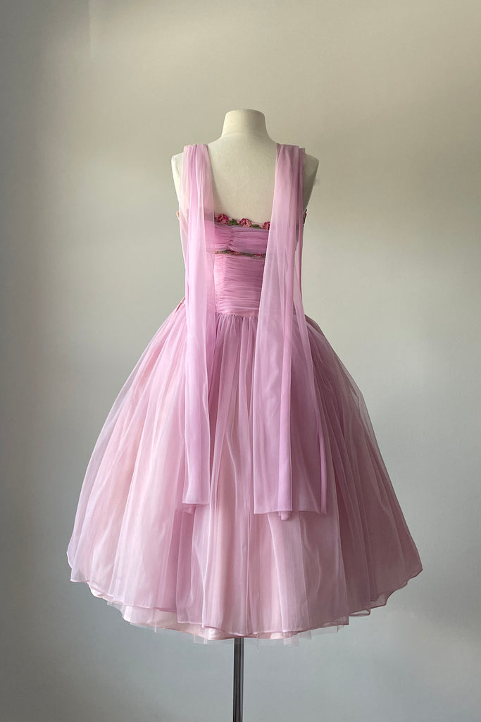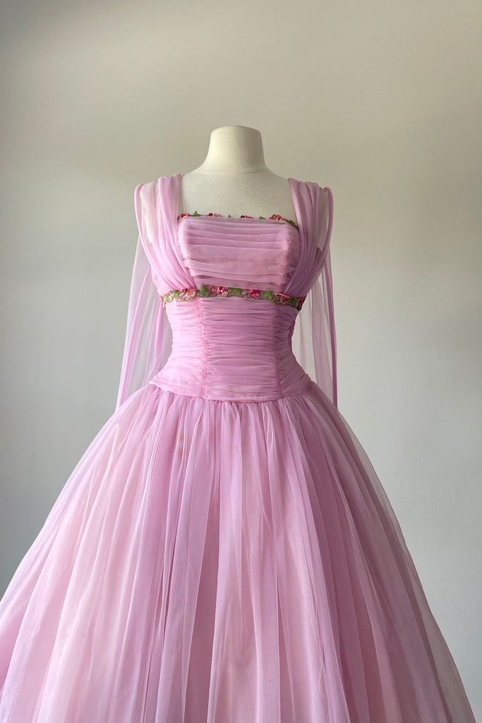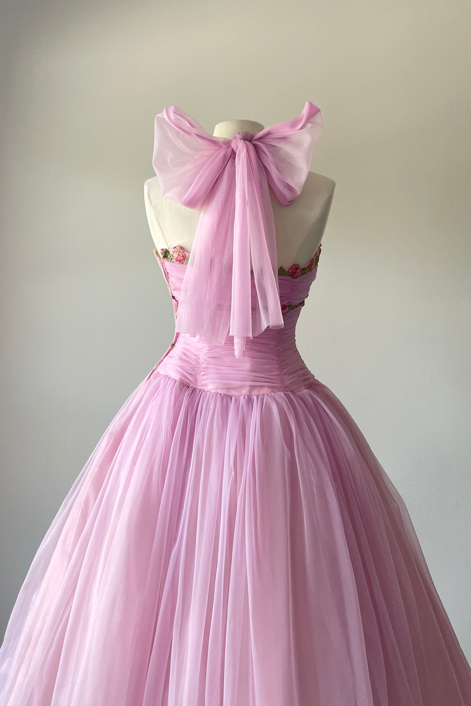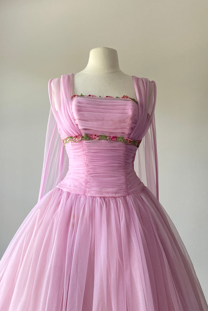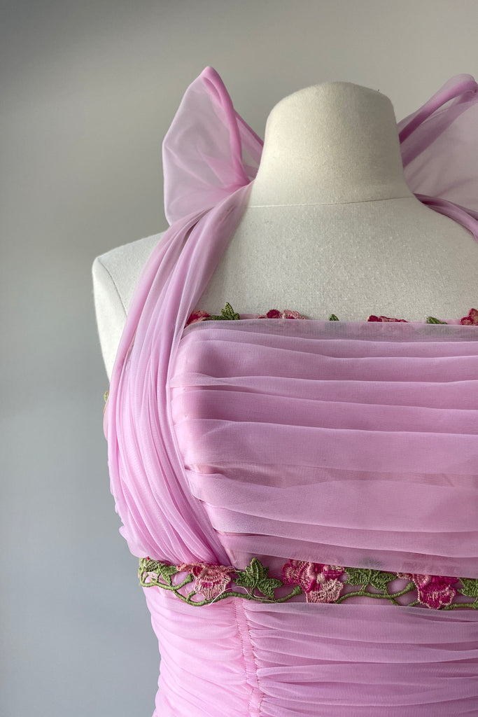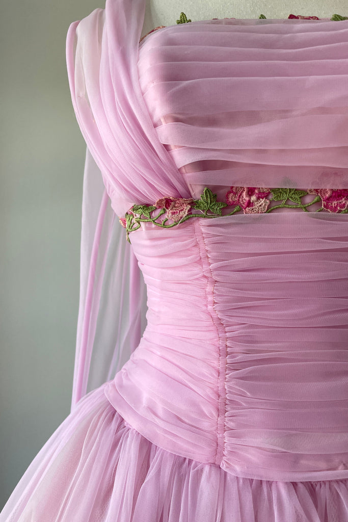 d e t a i l s : gorgeous pale lilac tulle, strapless ruched bodice with applique details and double shoulder sash, full skirt, lined in acetate + tulle