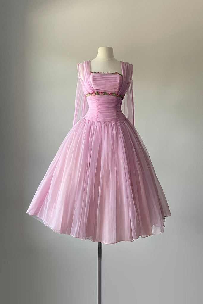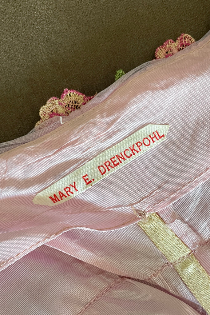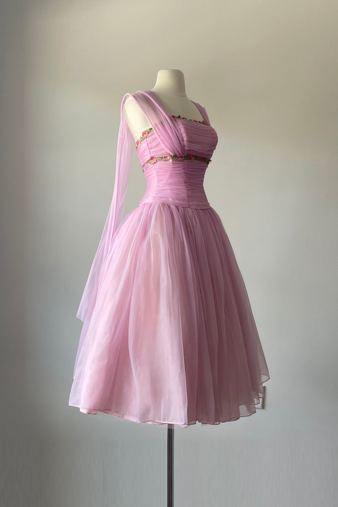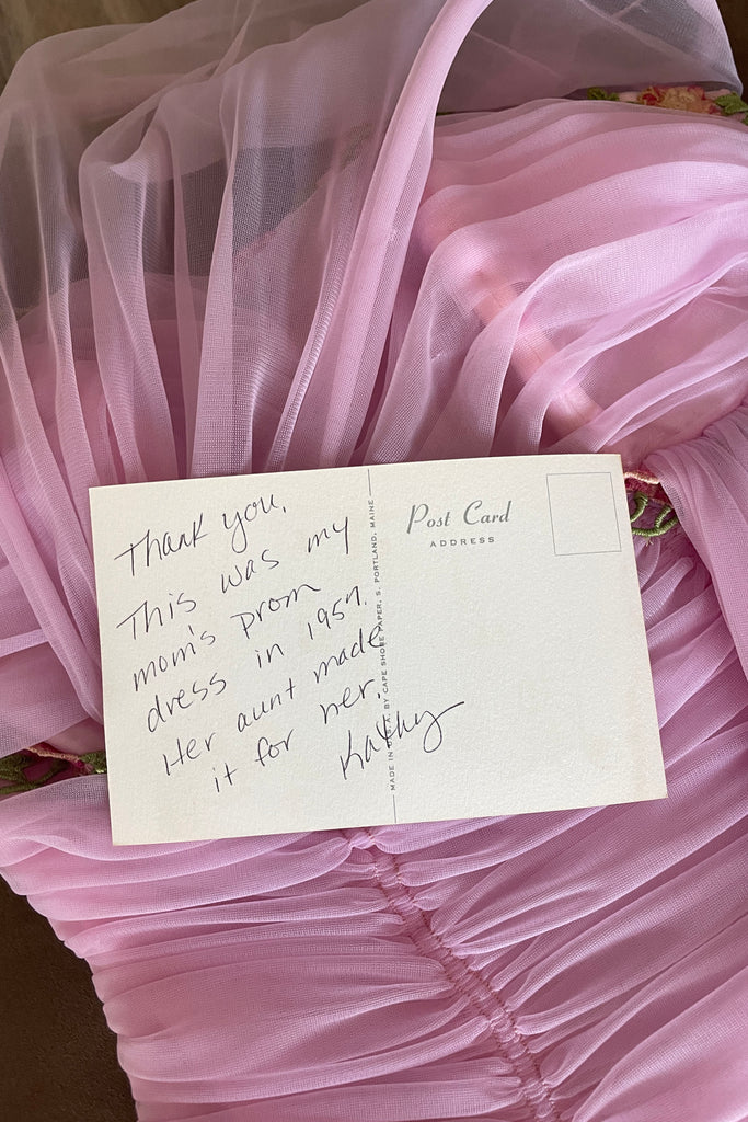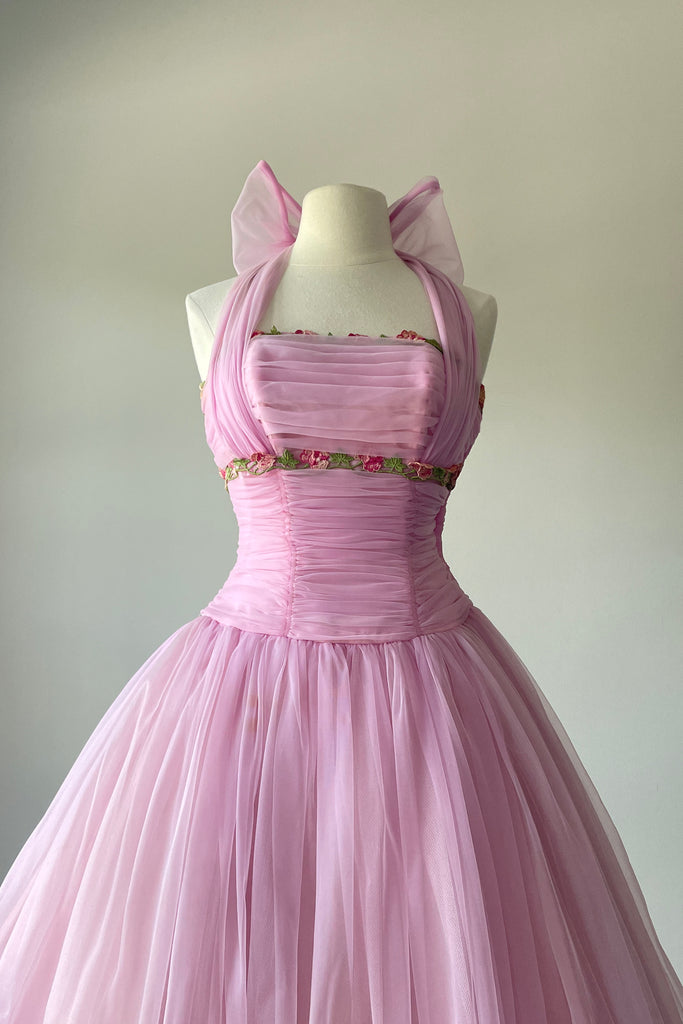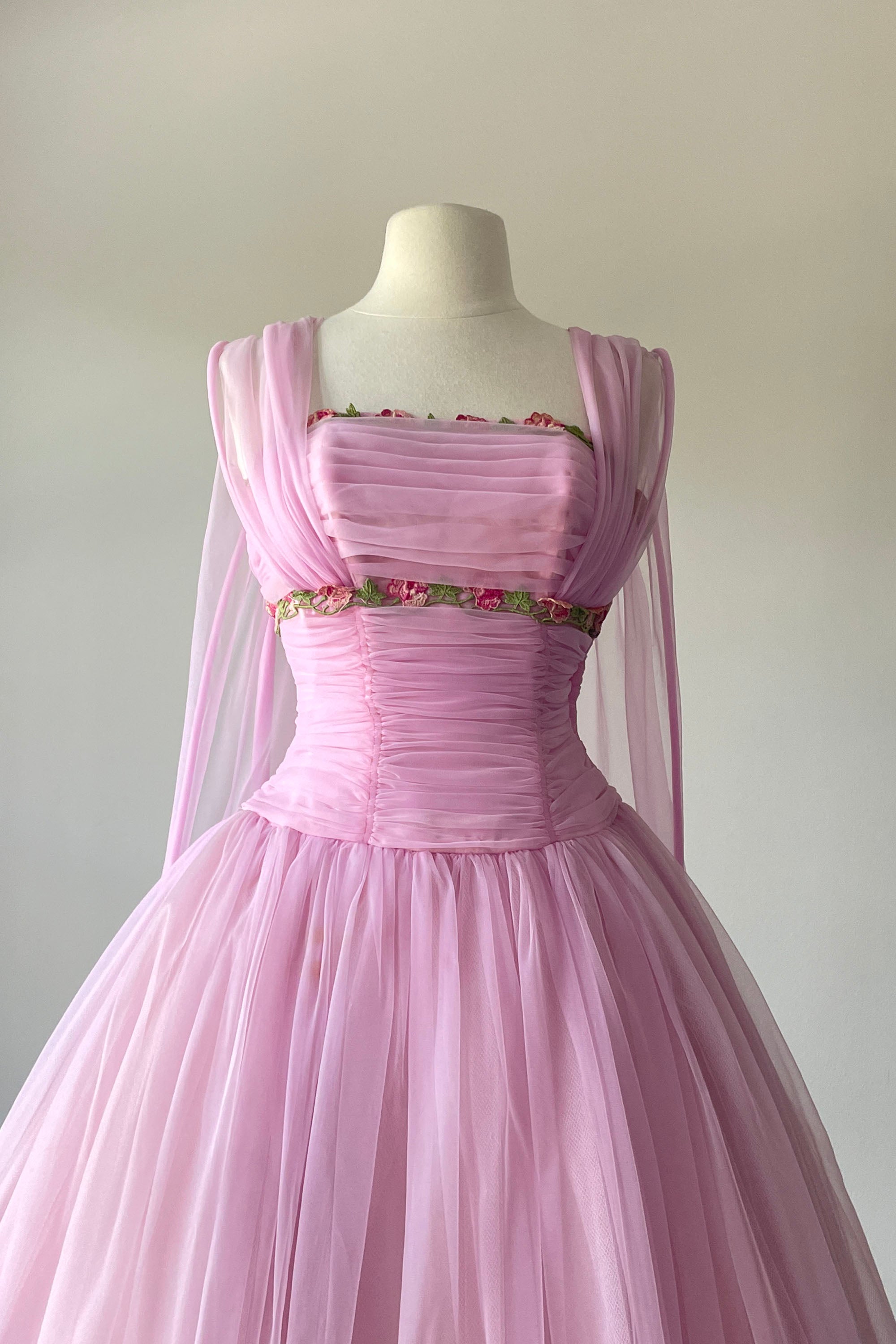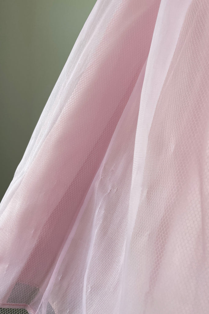 d e t a i l s : gorgeous pale lilac tulle, strapless ruched bodice with applique details and double shoulder sash, full skirt, lined in acetate + tulle
