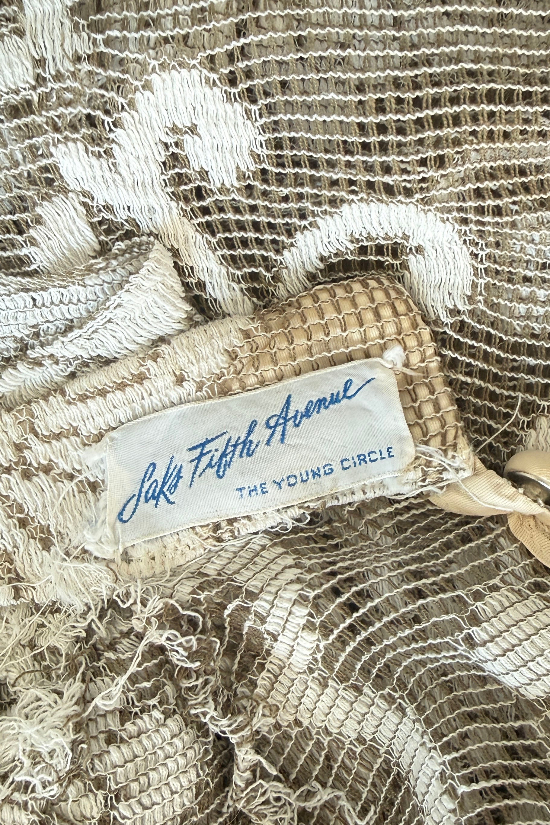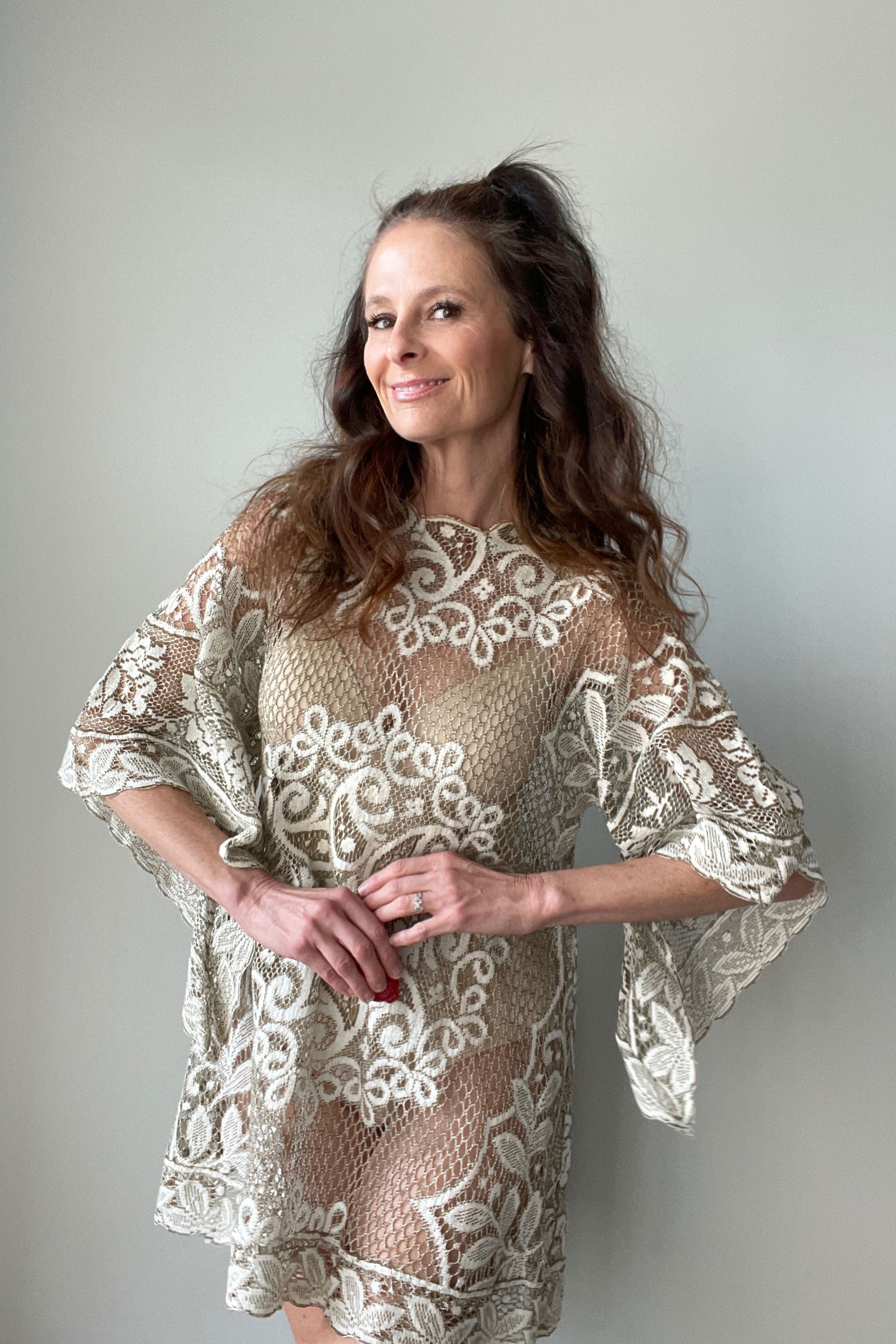 Vintage 1960s cotton lace angel wing sleeves dress. Sheer, covered buttons back neck. From Saks Fifth Avenue. (model shown in similar dress to demonstrate silhouette).