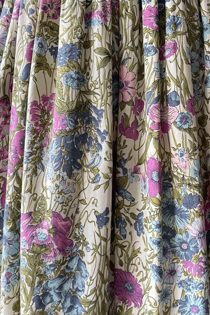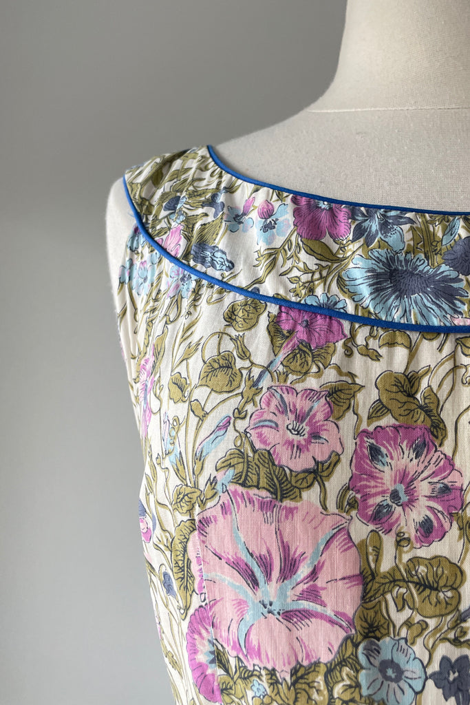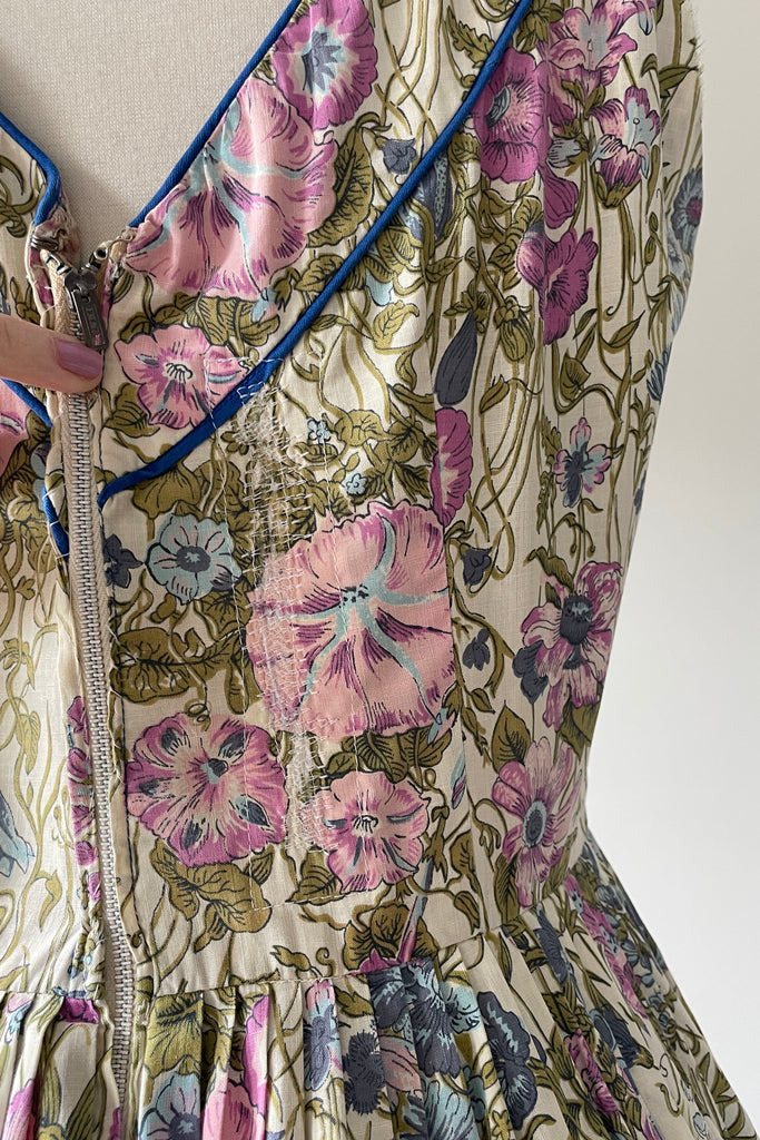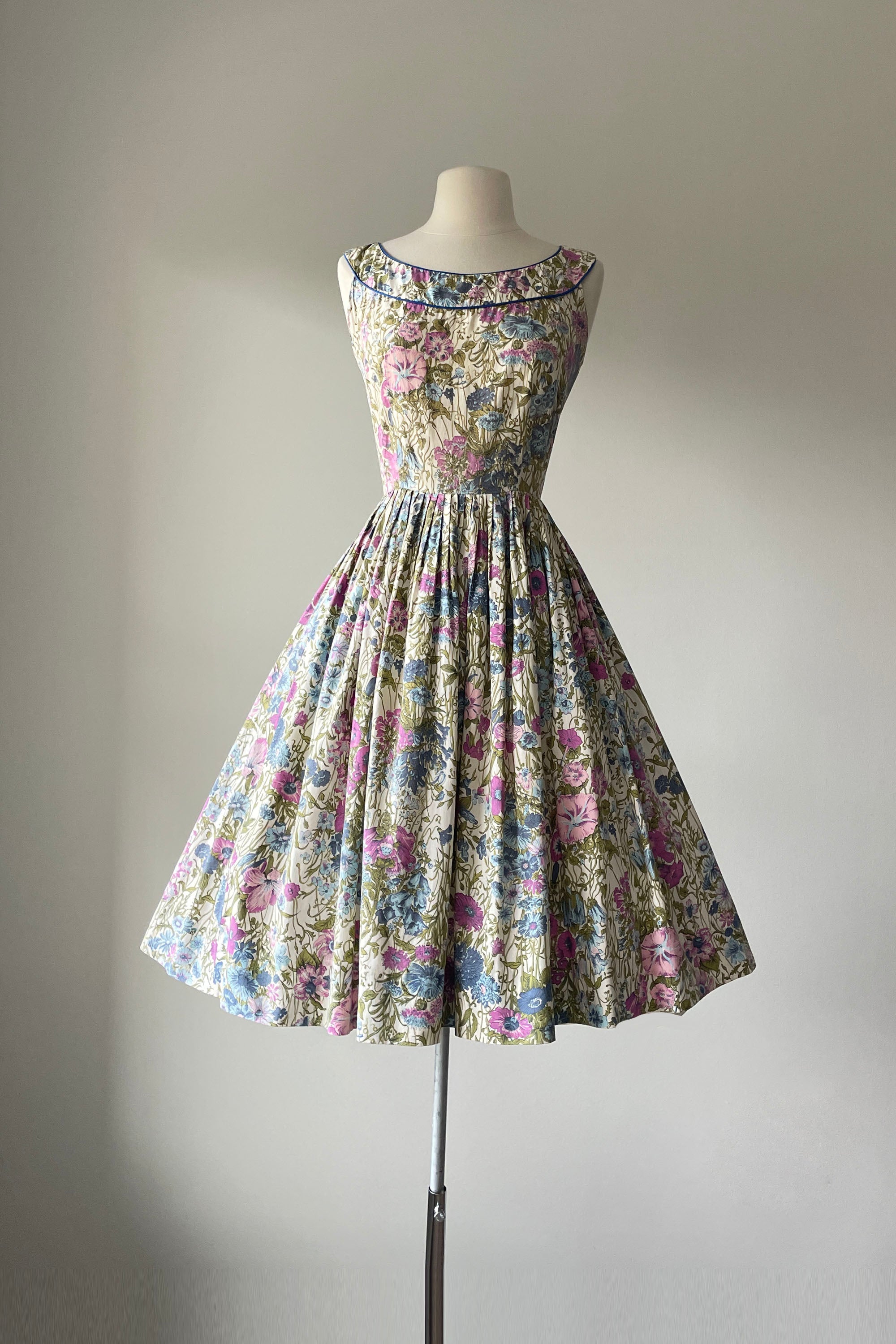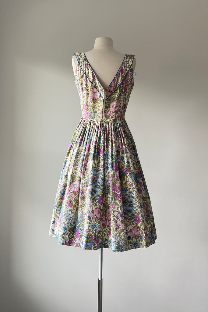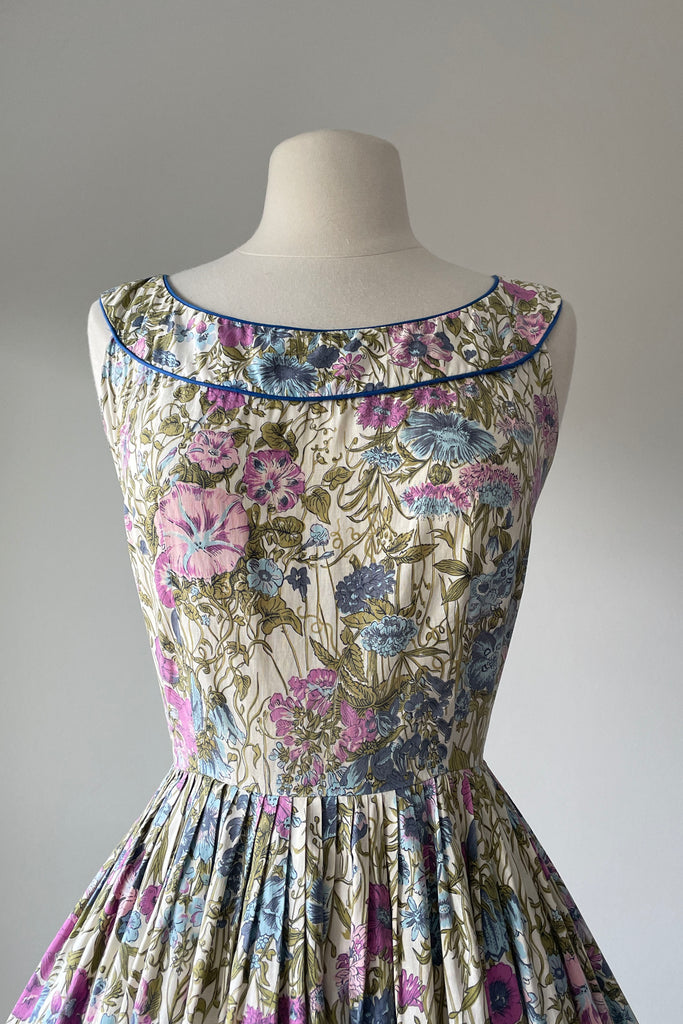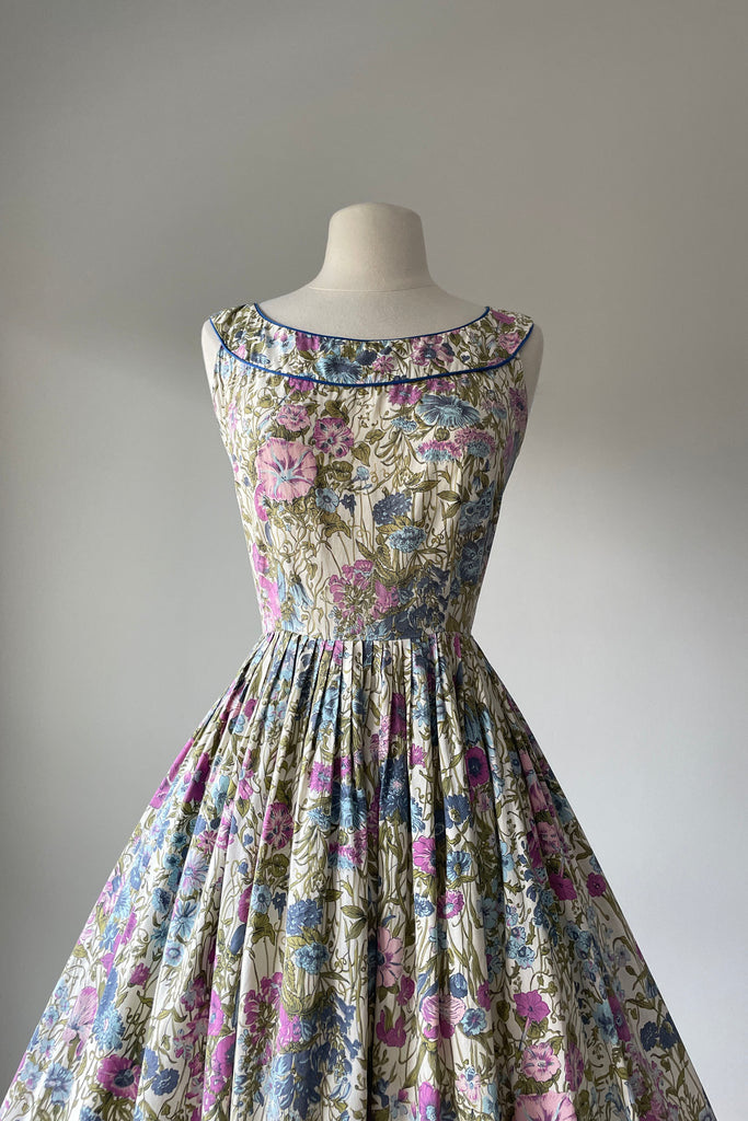 Darling 1950s wildflower print cotton dress. Muted tones of blue + purple against ivory background.