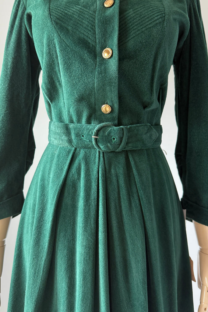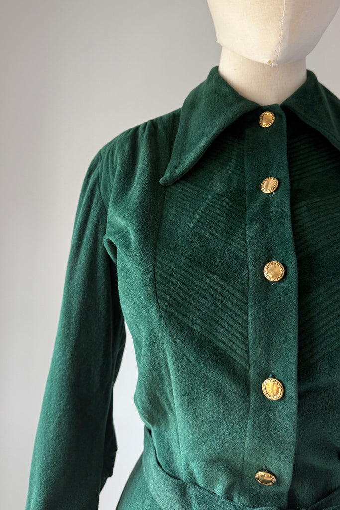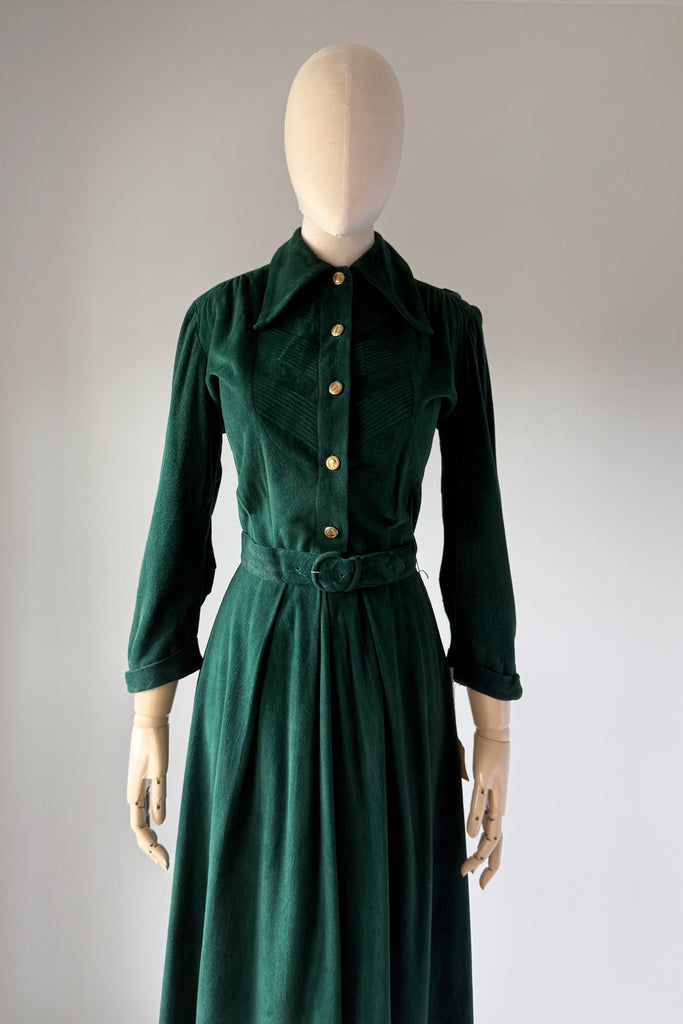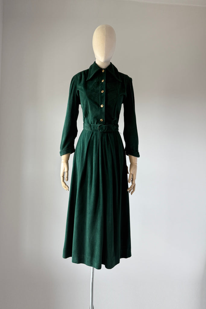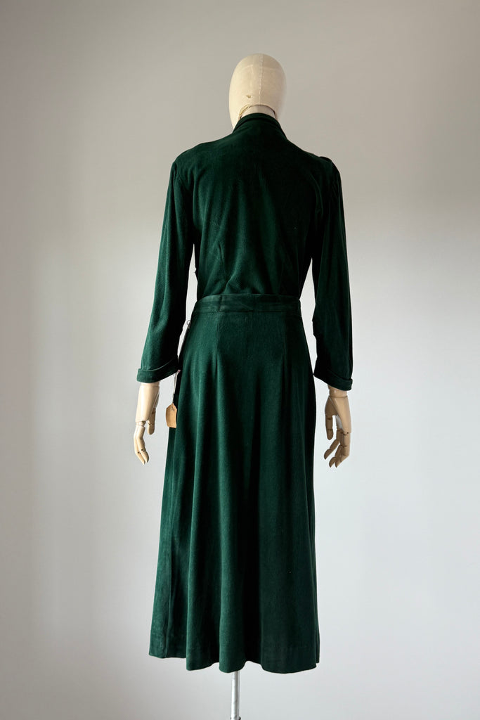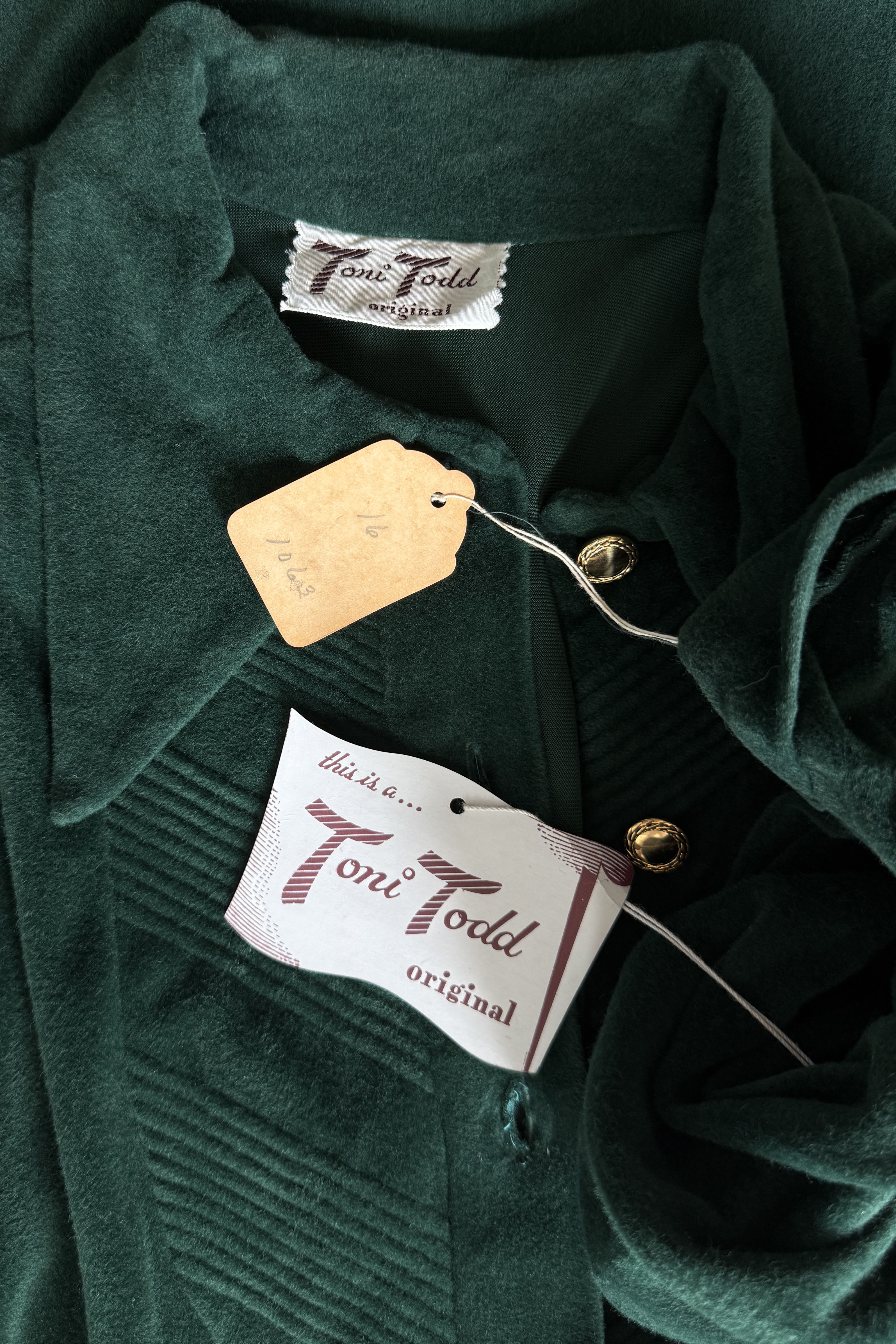 Vintage 1940s green velour/moleskin dress by Toni Todd. Metal side zipper + button bodice. Dead stock with original designer + store tags. Excellent condition. Fits like medium. Measurements (in inches):length: 47bodice: 17shoulders: 16.5sleeves: 20bust: 38waist:28hips: up to 44 ref: 0507 | 2538
