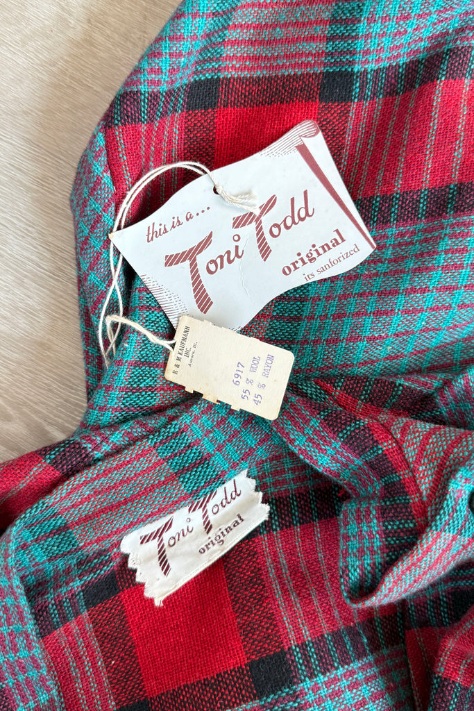Vintage 1940s red + teal blue plaid wool dress by Toni Todd. Includes original belt. Metal side zipper + button bodice. Dead stock never worn with original designer + store tags. Excellent condition.