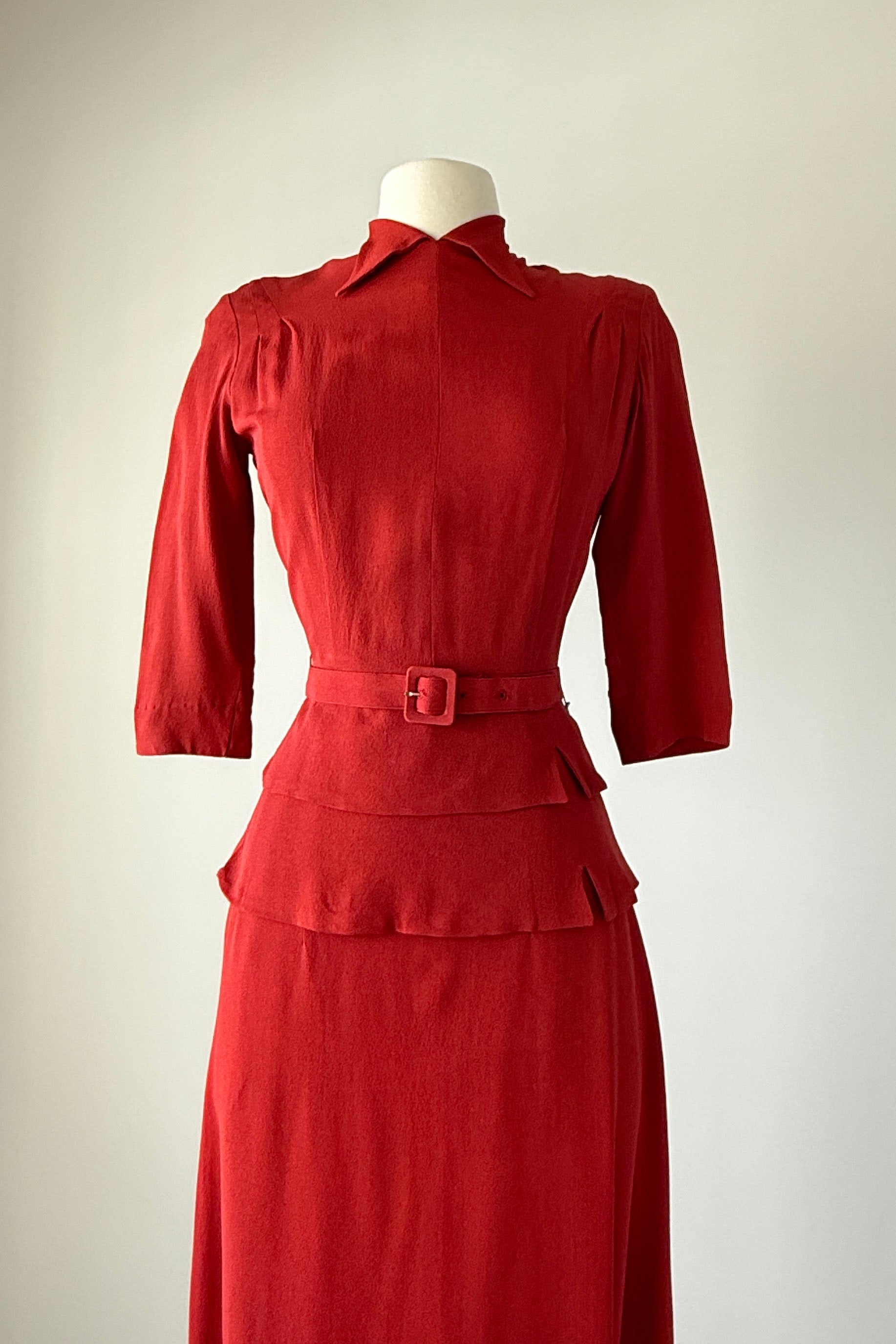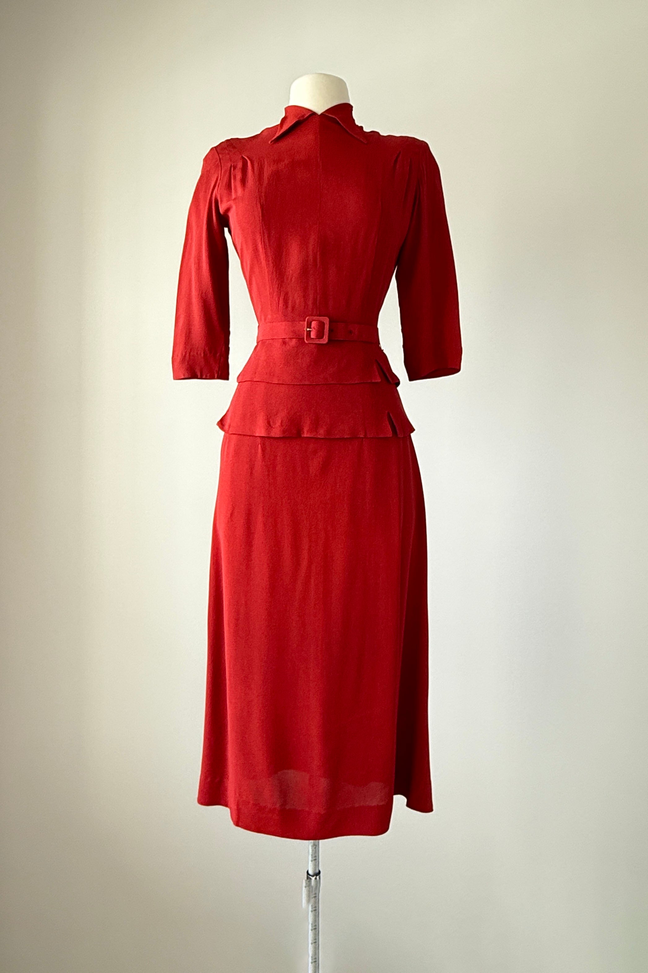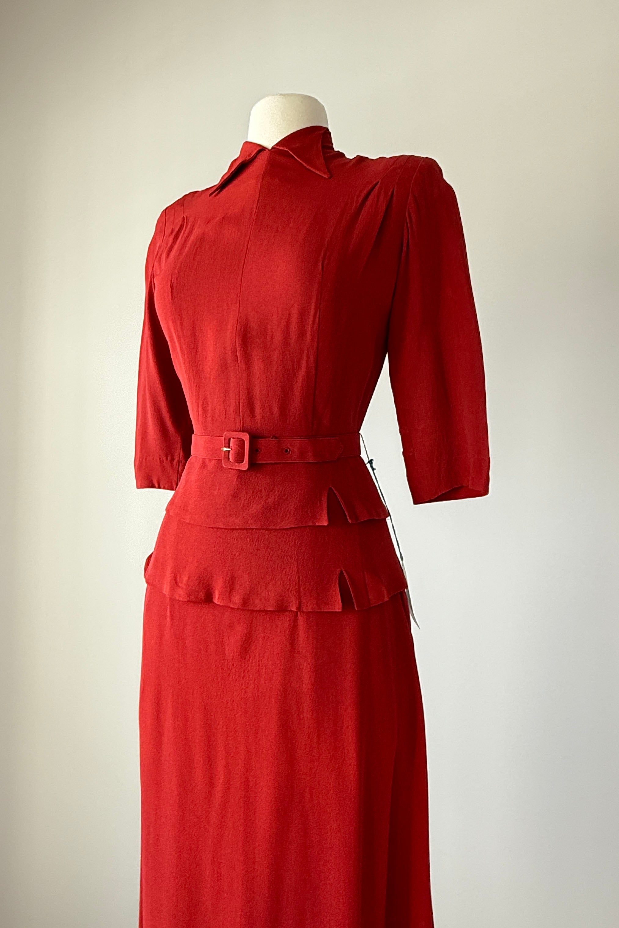 VINTAGE RAYON SUITVintage 1940s brick red rayon crepe suit. Back covered button closure, original belt. Skirt has metal side closure. Dead stock with tags. By Helen Powell.Good condition - a few very faint inconspicuous marks. Presents beautifully.Fits like xs/s.J a c k e t :Length 23.5Length to waist 16Bust 36-38Waist 26S k i r t :Length 31Waist 26Hip 40As with all vintage, please expect wear consistent with age. All sales are final. No order cancellations.0511 | 2604