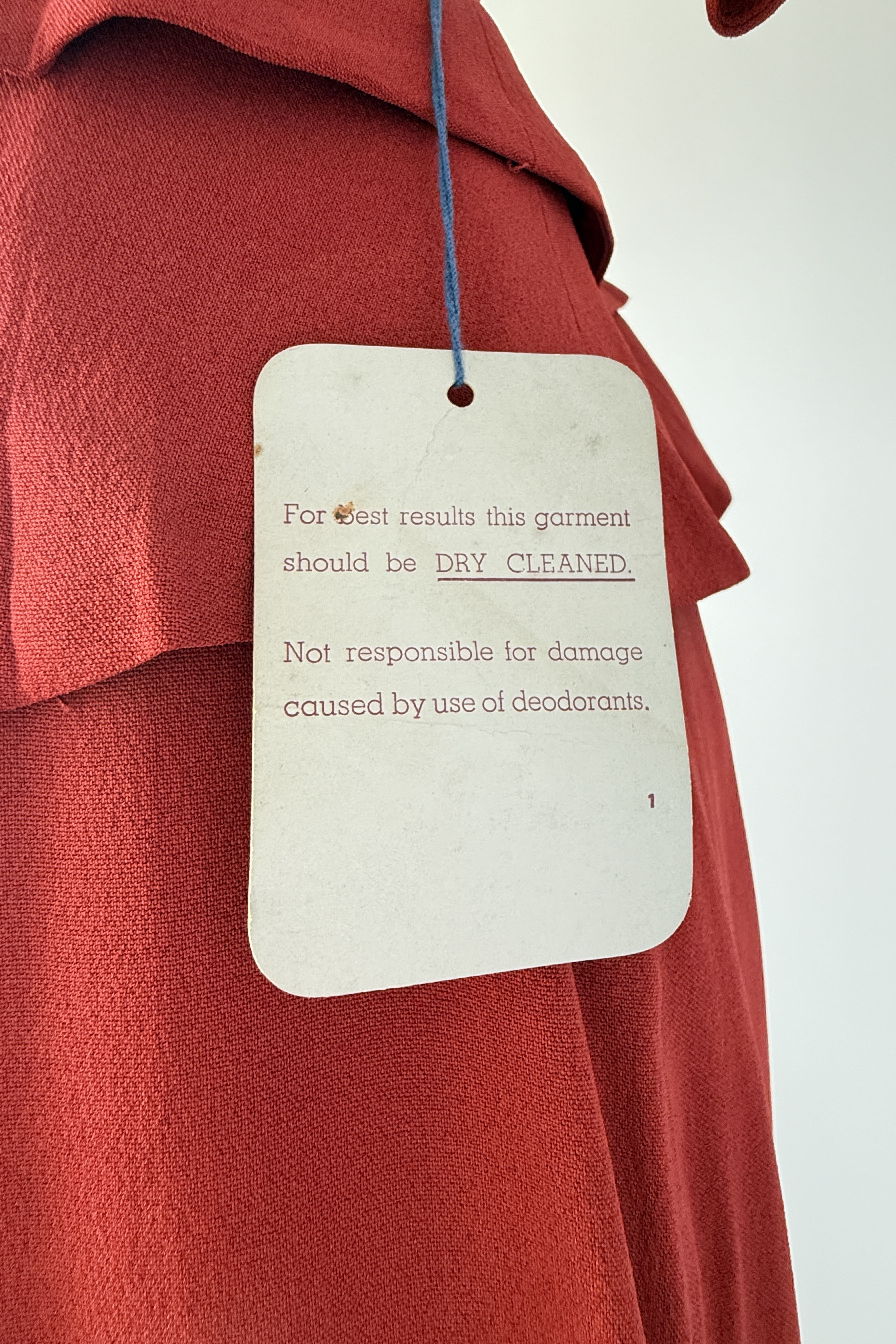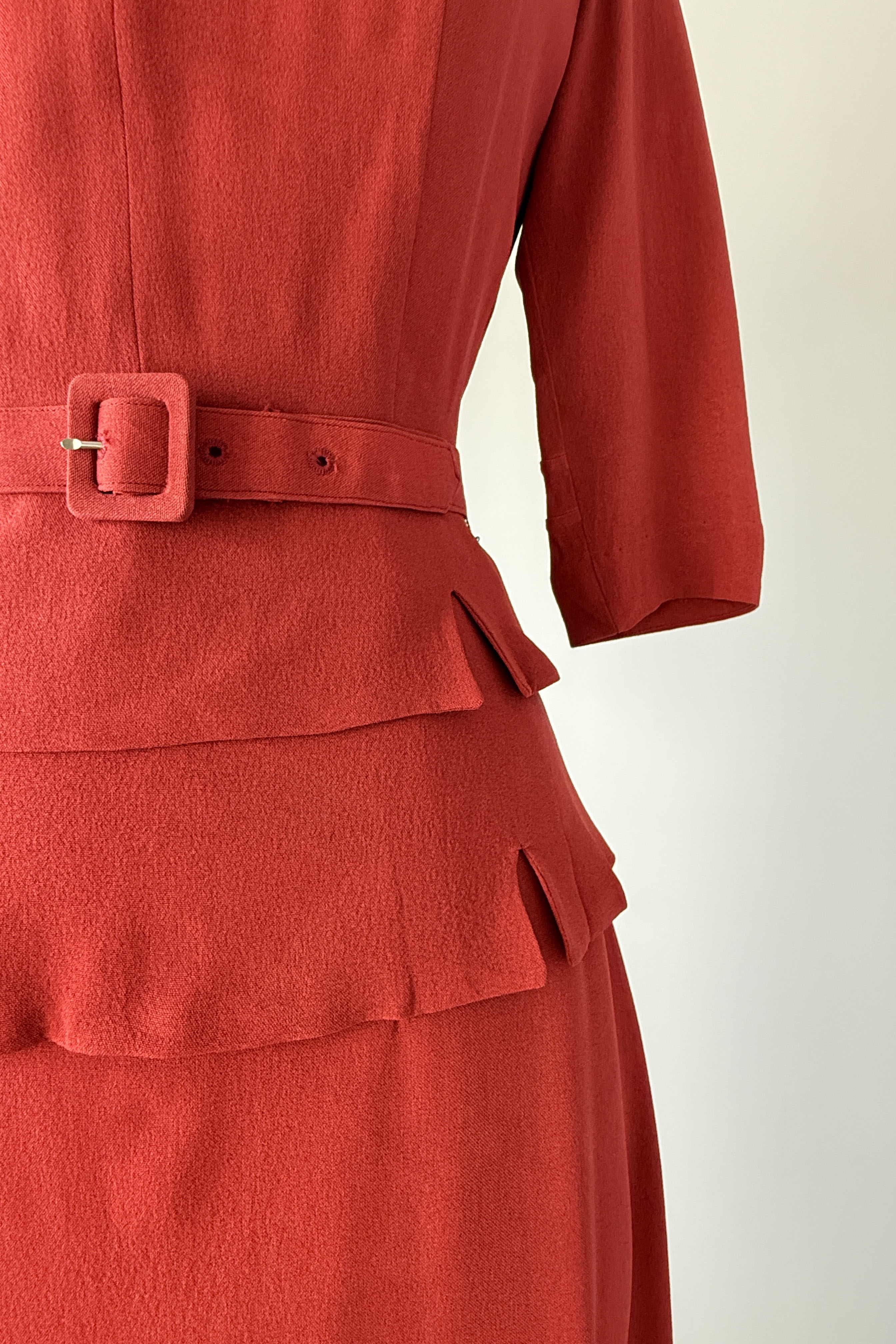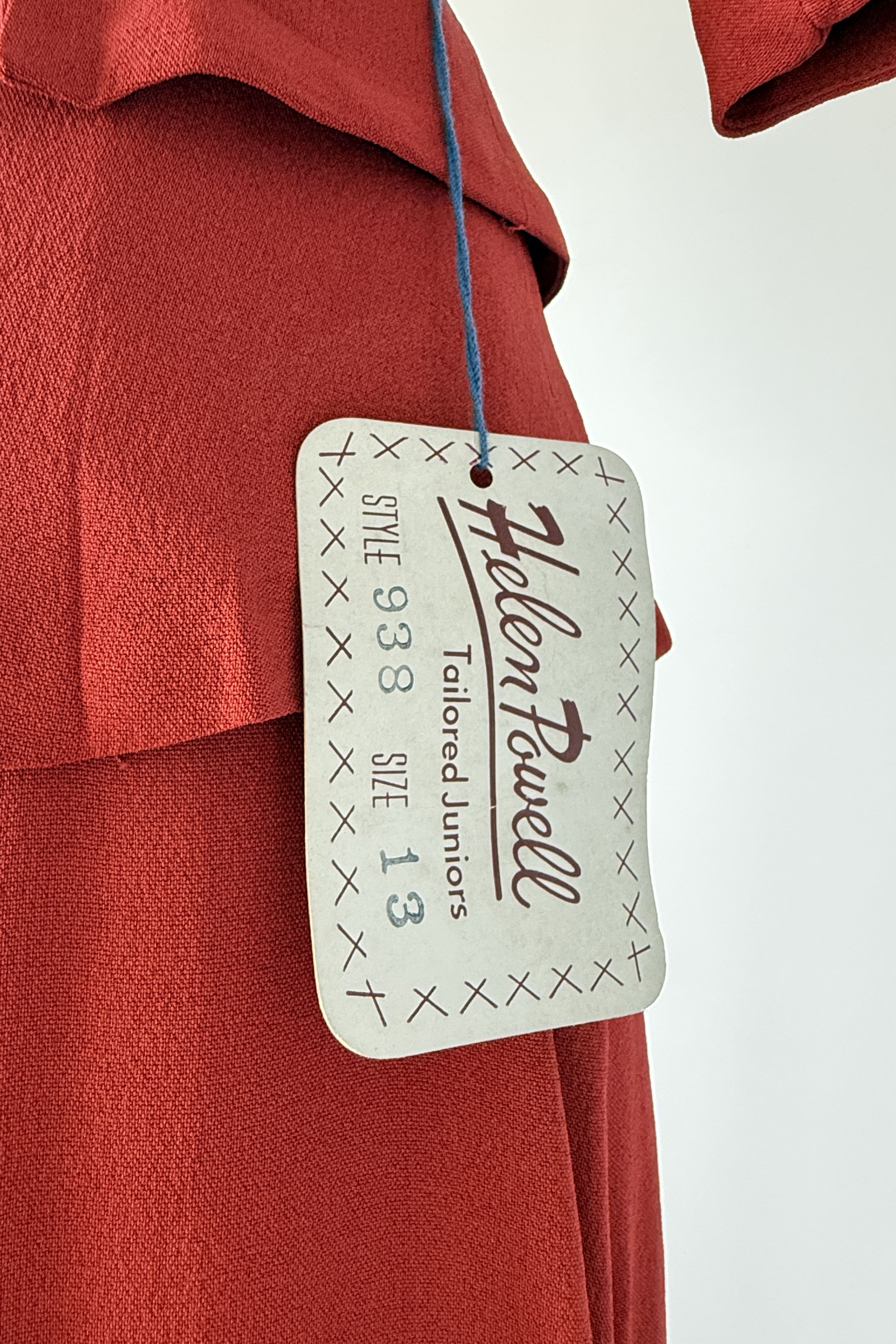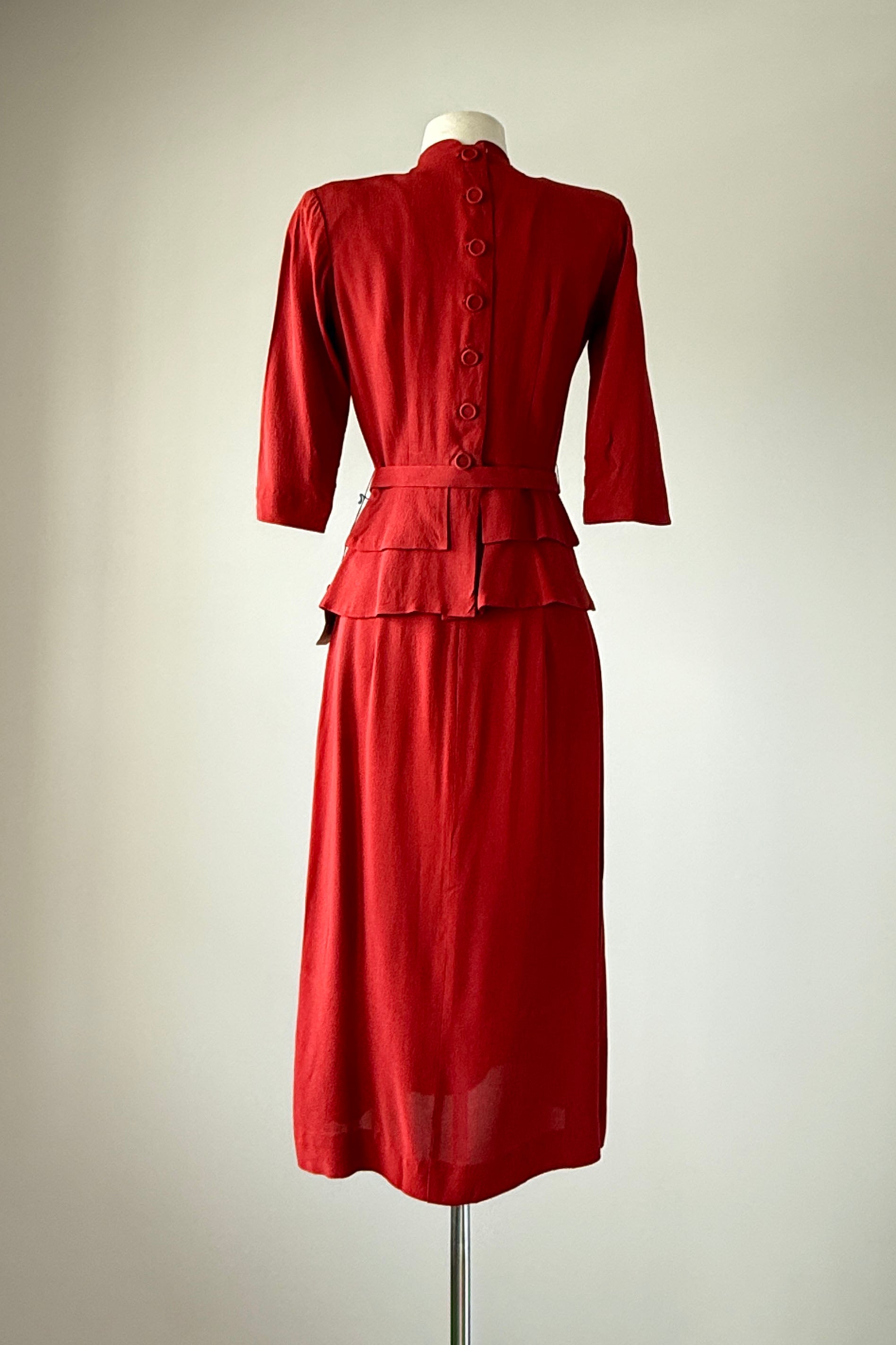 VINTAGE RAYON SUITVintage 1940s brick red rayon crepe suit. Back covered button closure, original belt. Skirt has metal side closure. Dead stock with tags. By Helen Powell.Good condition - a few very faint inconspicuous marks. Presents beautifully.Fits like xs/s.J a c k e t :Length 23.5Length to waist 16Bust 36-38Waist 26S k i r t :Length 31Waist 26Hip 40As with all vintage, please expect wear consistent with age. All sales are final. No order cancellations.0511 | 2604