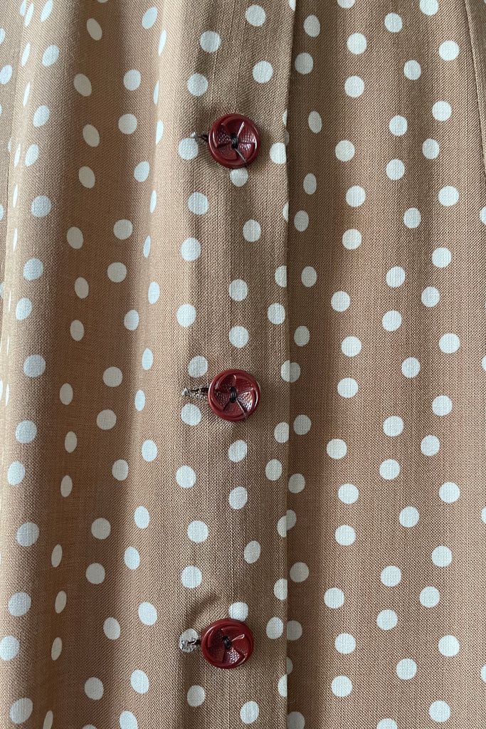 d e t a i l s : beautiful taupe linen with white polka dots, front button closure with little bow tie at top, original belt, RARE dead stock with original store tags. be the first to wear this beauty!