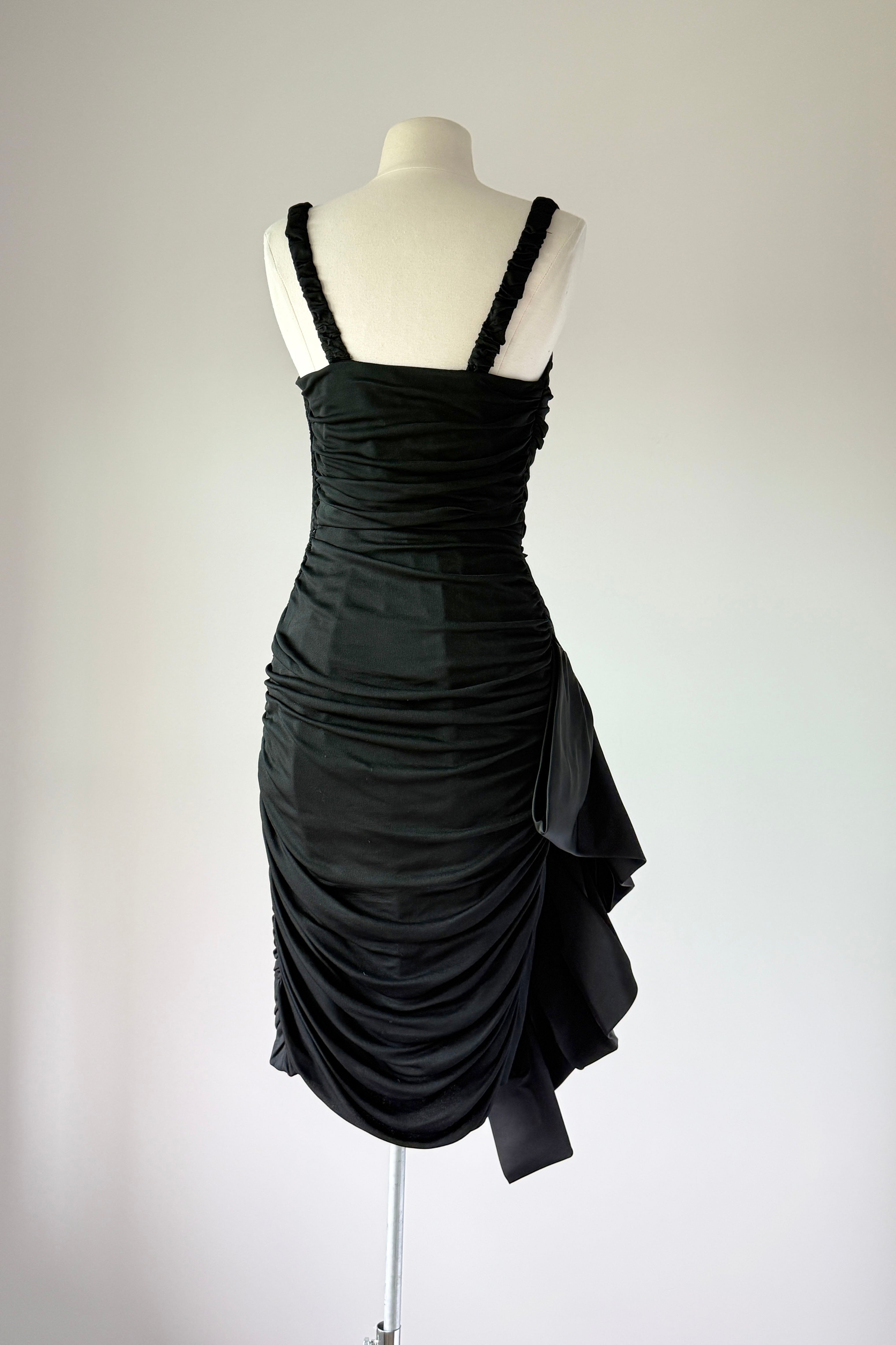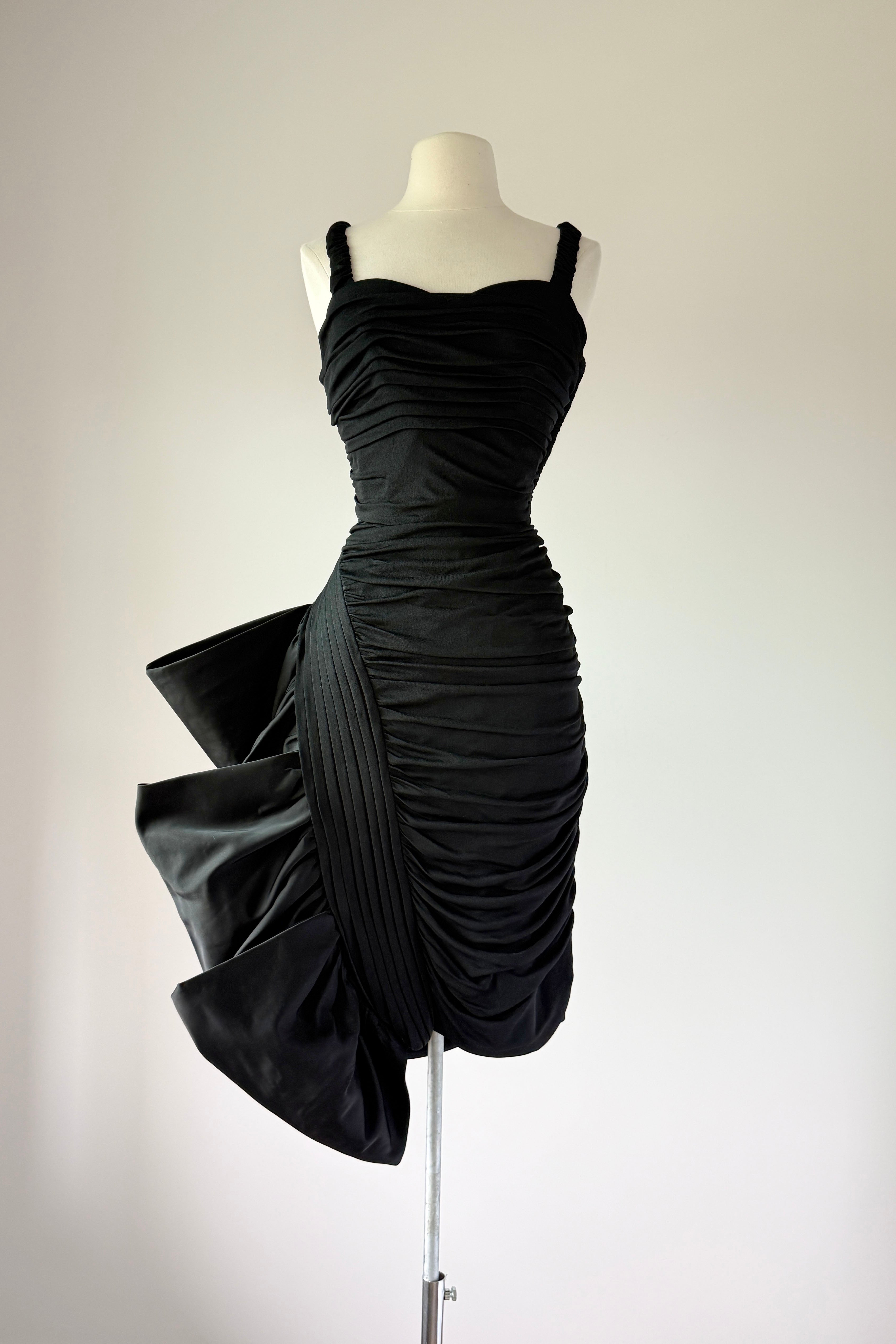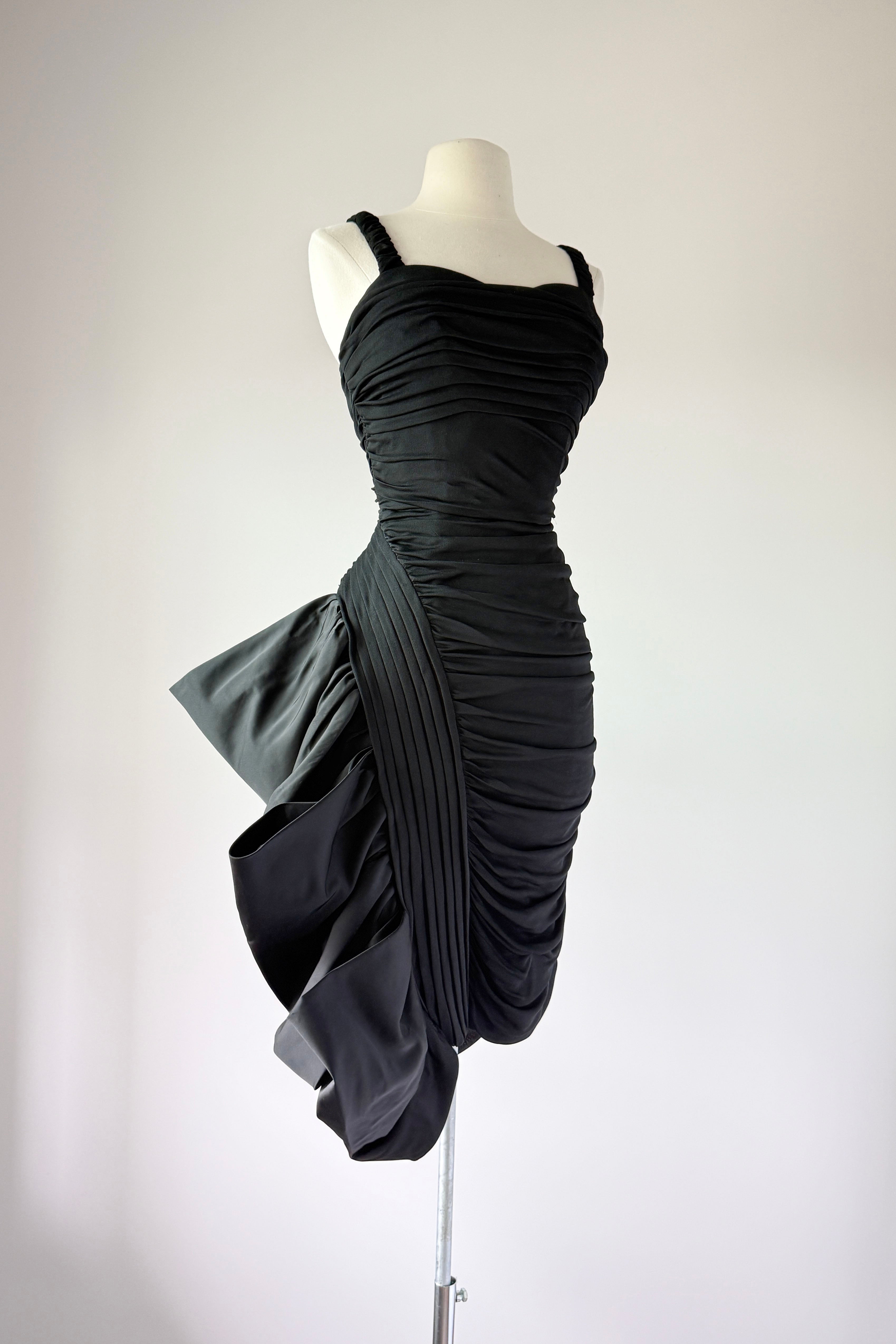 VINTAGE DRESSVintage 1950s dress. Features black jersey, ruched bodice, dramatic ruffled left skirt with tulle lining to keep shape, side zipper. Lined in acetate. By Lillli Diamond. Excellent condition. Fits like XS/S. Length 42Bodice 16Bust 33-34Waist 24-25Hip 36As with all vintage, please expect wear consistent with age. All sales are final. No order cancellations.0919 | 2611