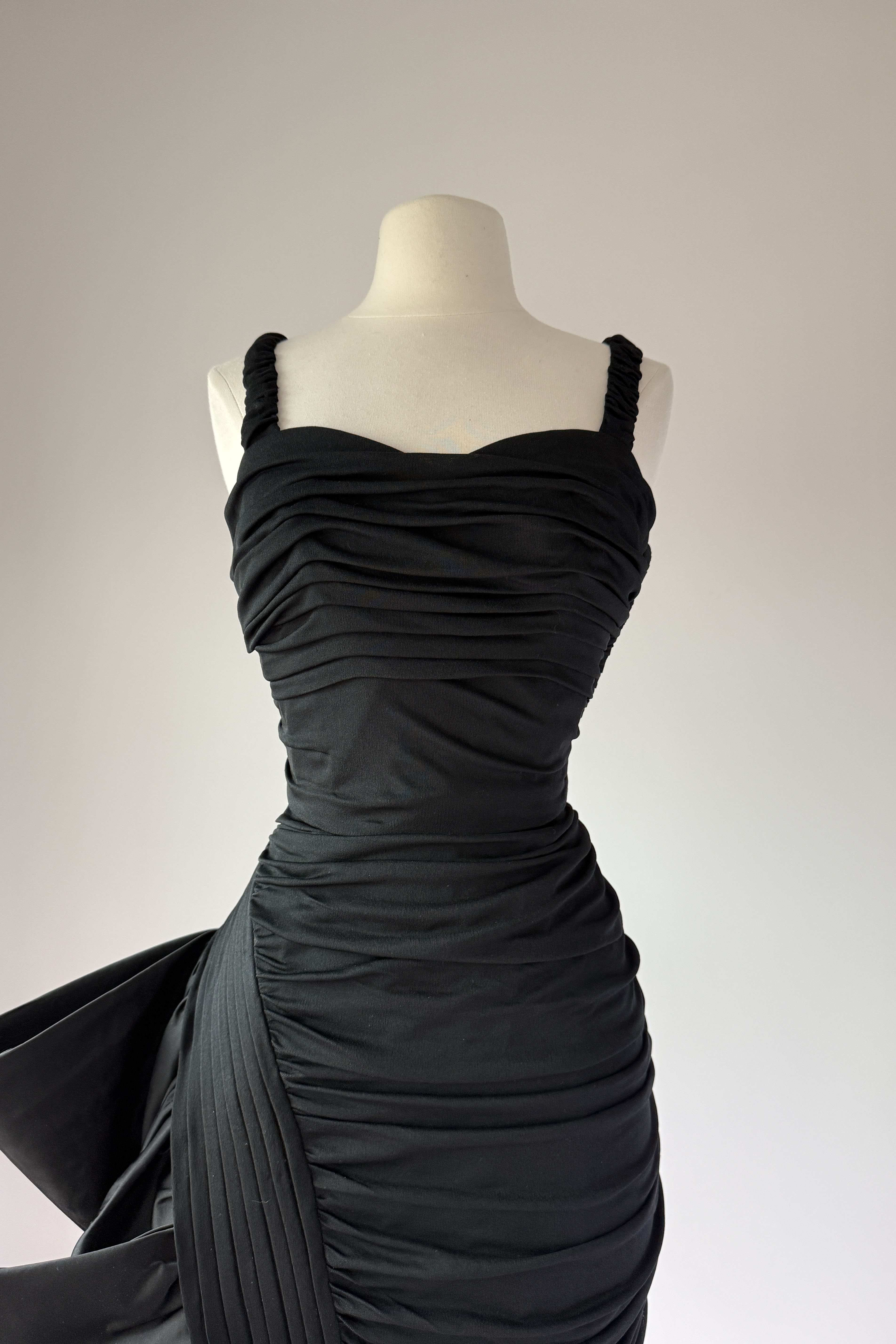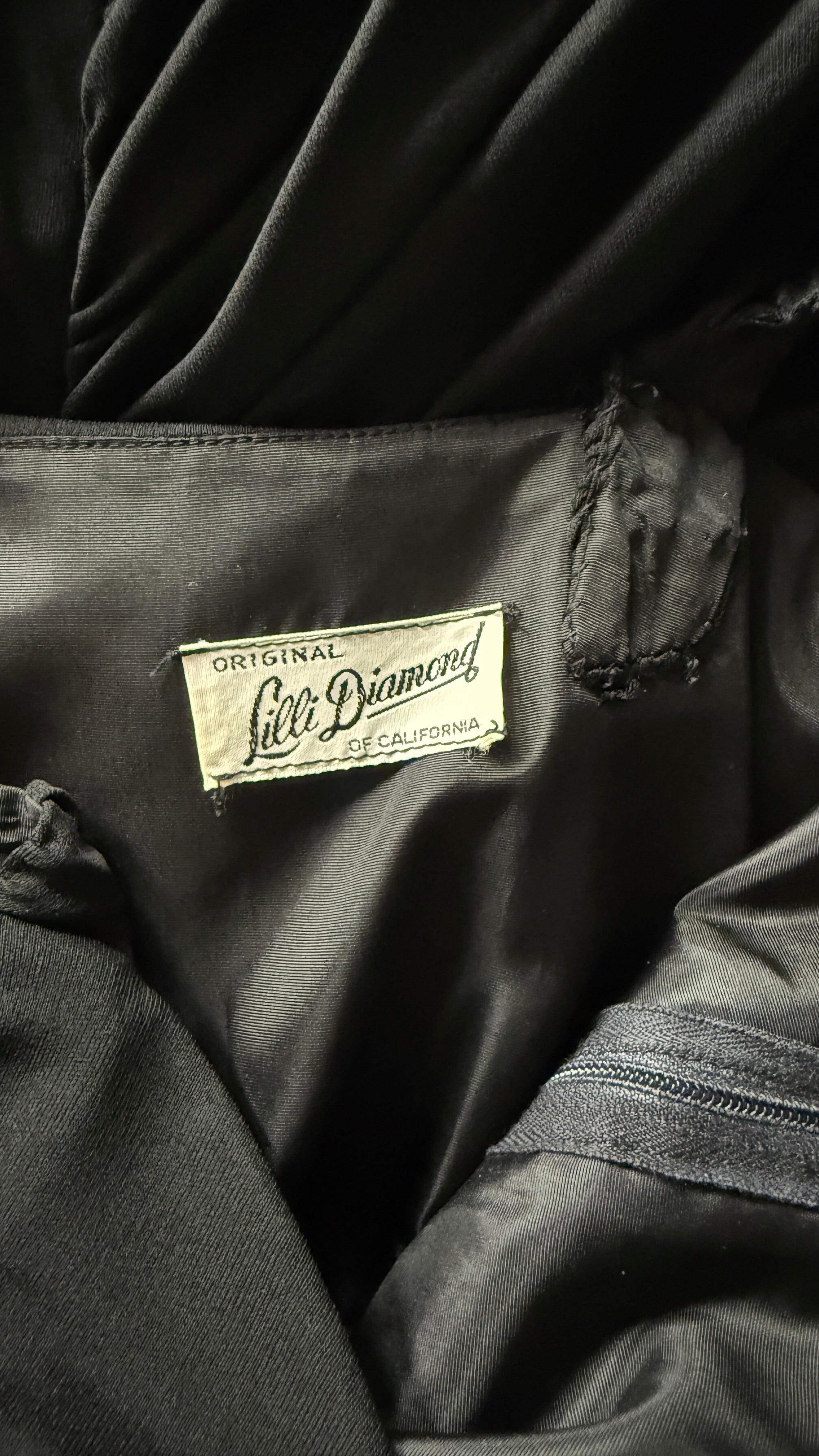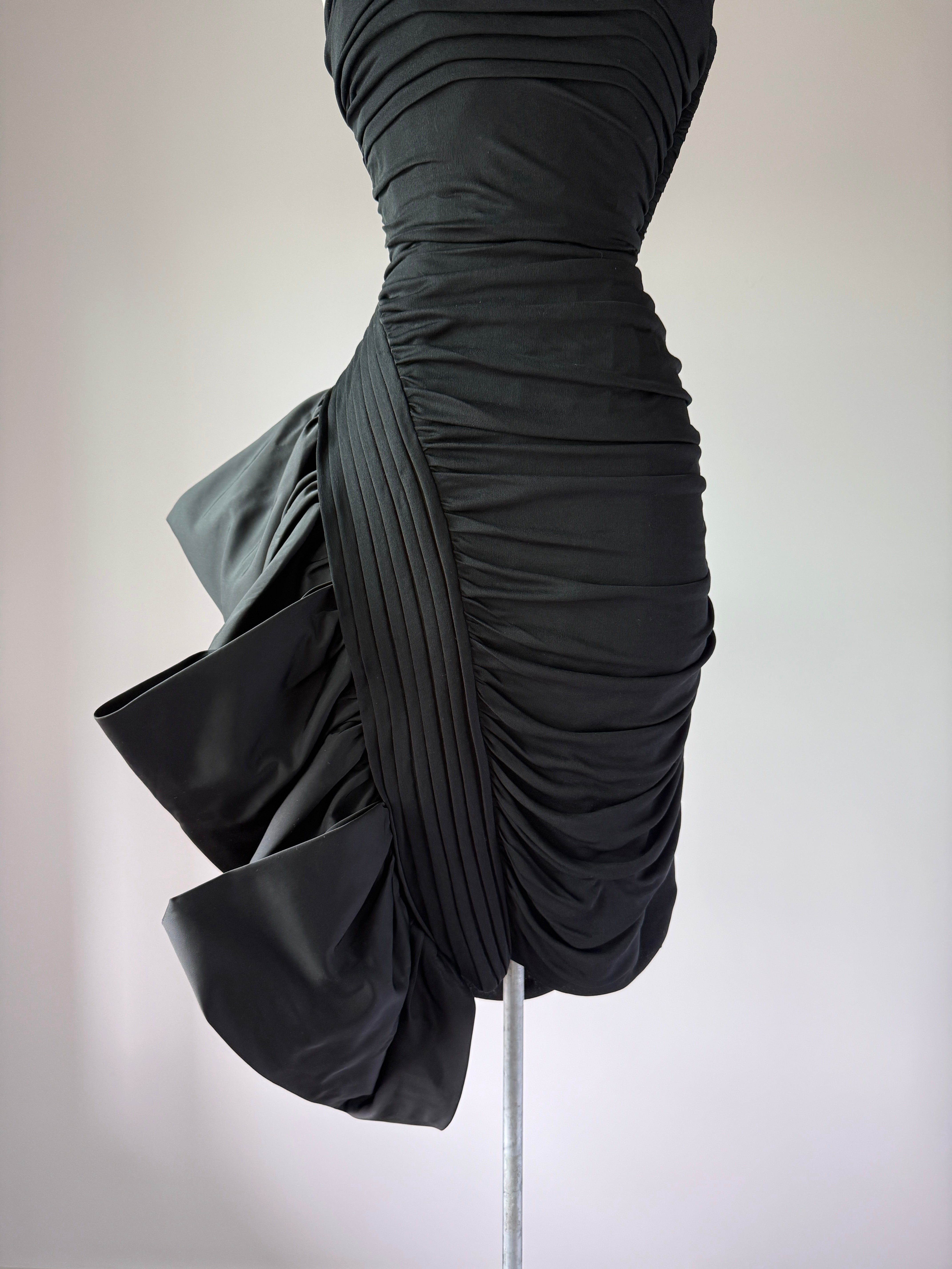 VINTAGE DRESSVintage 1950s dress. Features black jersey, ruched bodice, dramatic ruffled left skirt with tulle lining to keep shape, side zipper. Lined in acetate. By Lillli Diamond. Excellent condition. Fits like XS/S. Length 42Bodice 16Bust 33-34Waist 24-25Hip 36As with all vintage, please expect wear consistent with age. All sales are final. No order cancellations.0919 | 2611