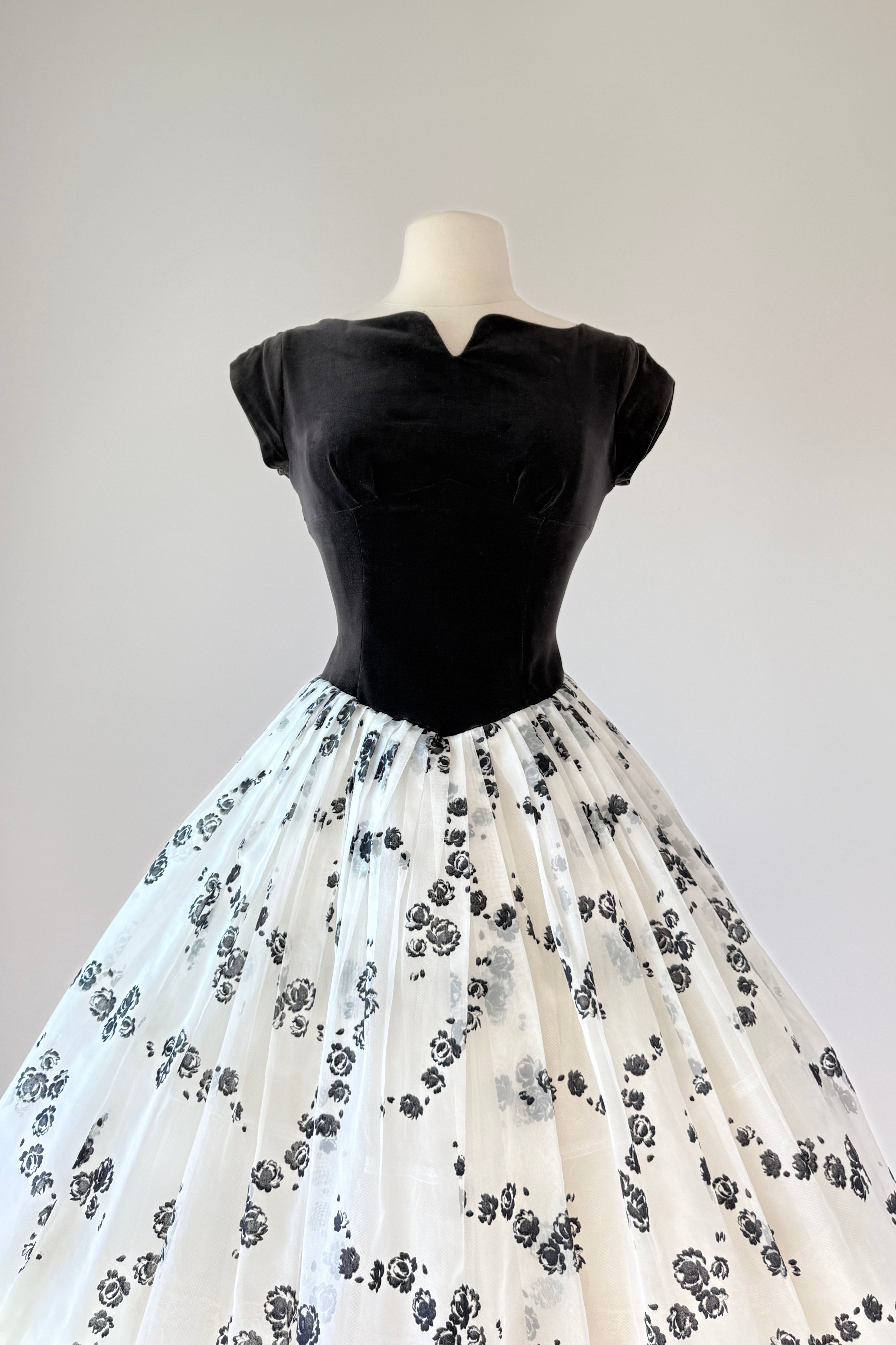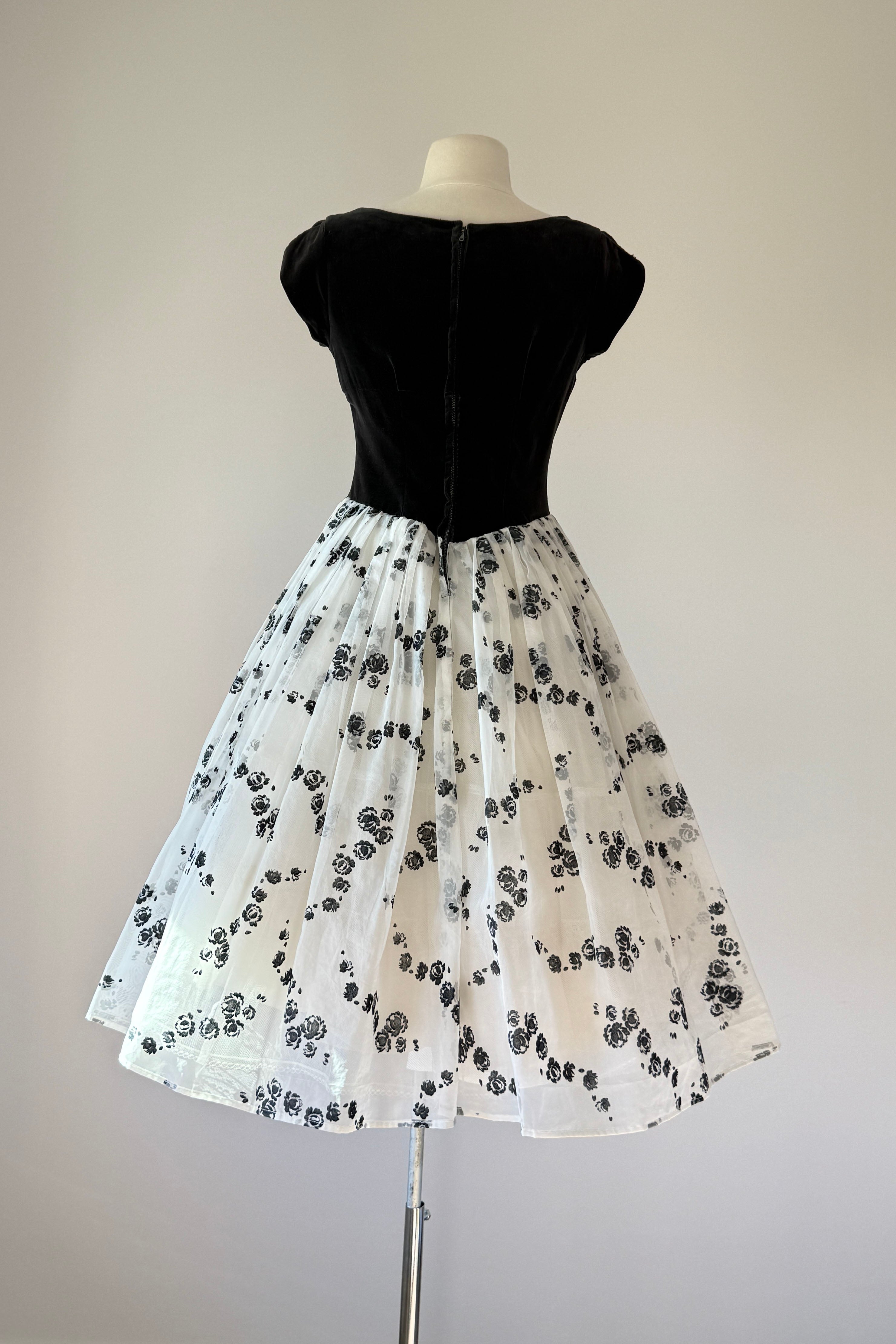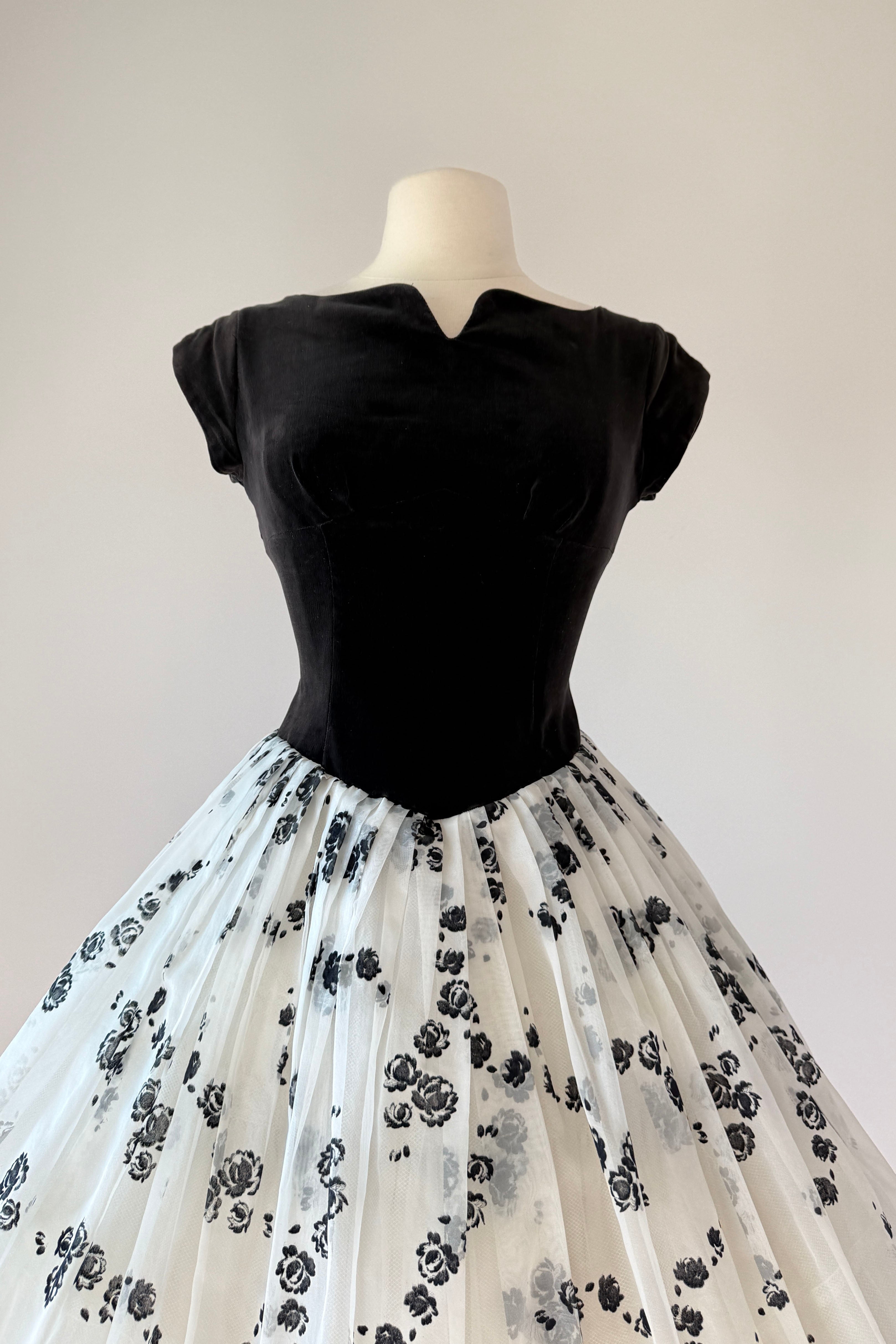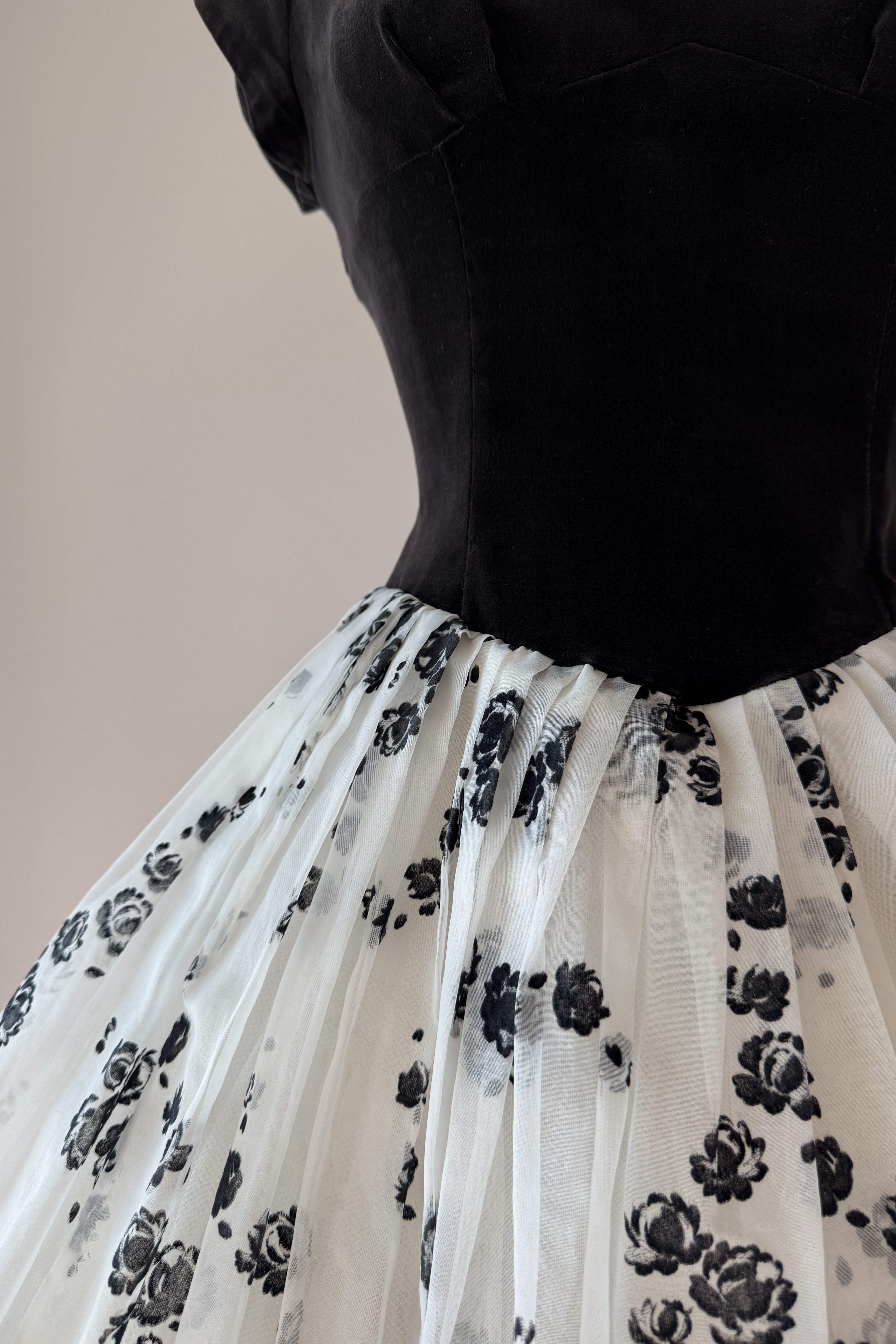 VINTAGE DRESSVintage 1950s dress. Features black velvet bodice, chiffon skirt with flocked roses, acetate lining and built in crinoline, metal back zipper. By Semiteen.Excellent condition. XS/S. Length 41Bodice 15Bust 36Waist 28As with all vintage, please expect wear consistent with age. All sales are final. No order cancellations.0874 | 2607