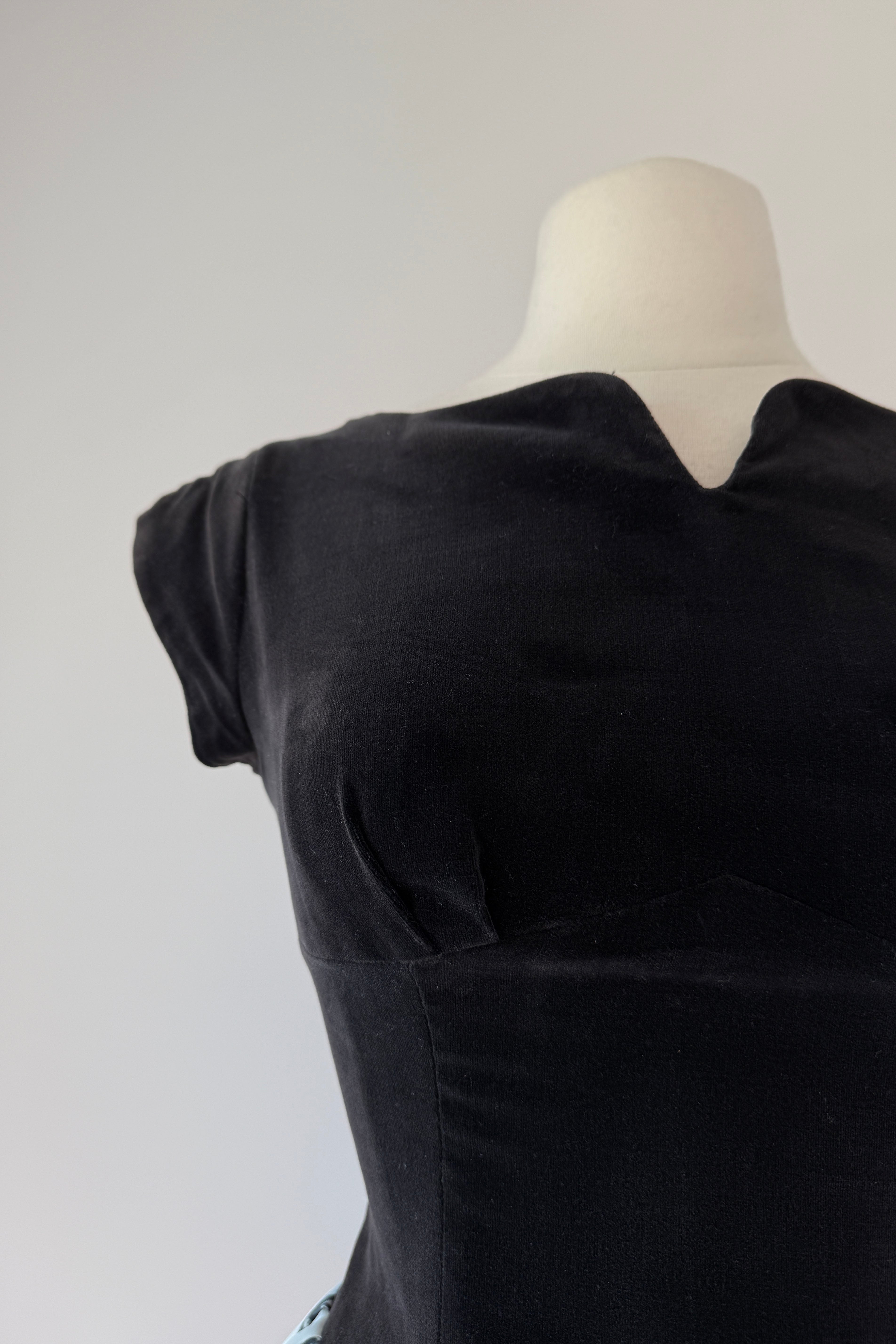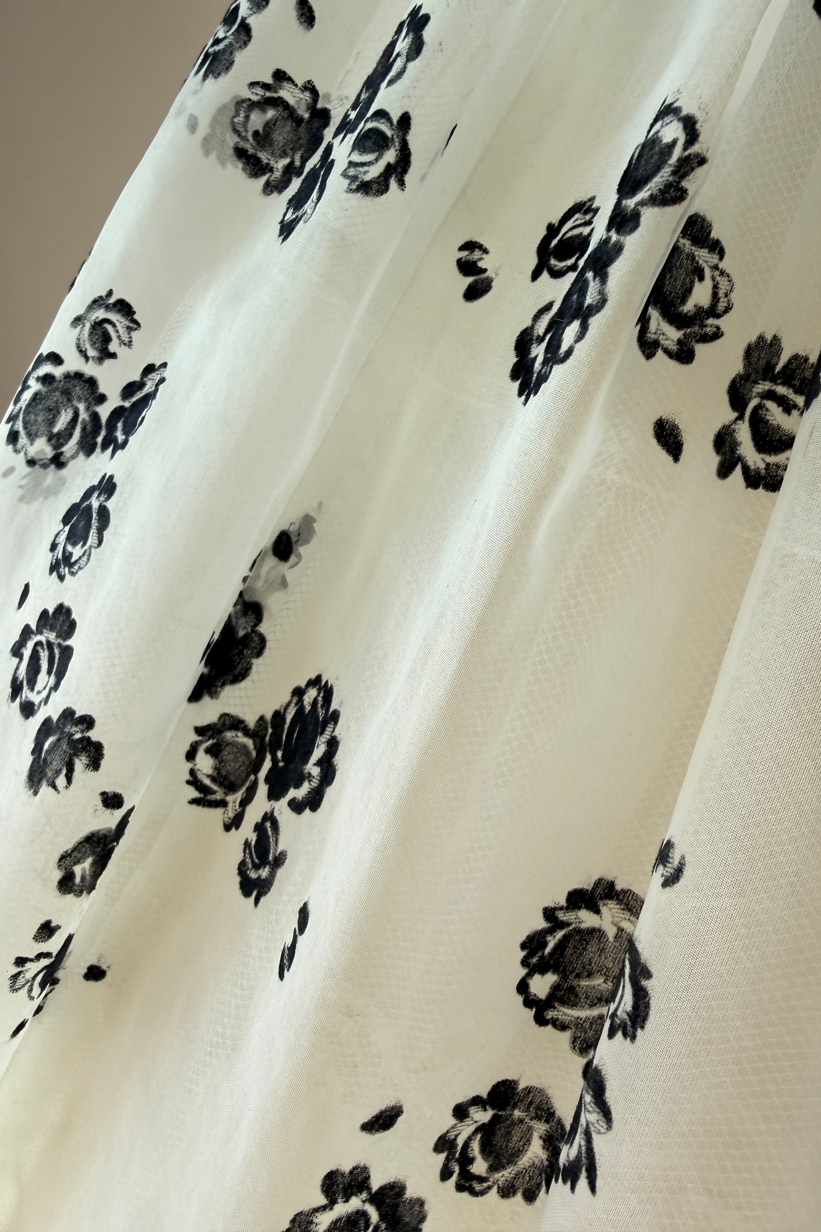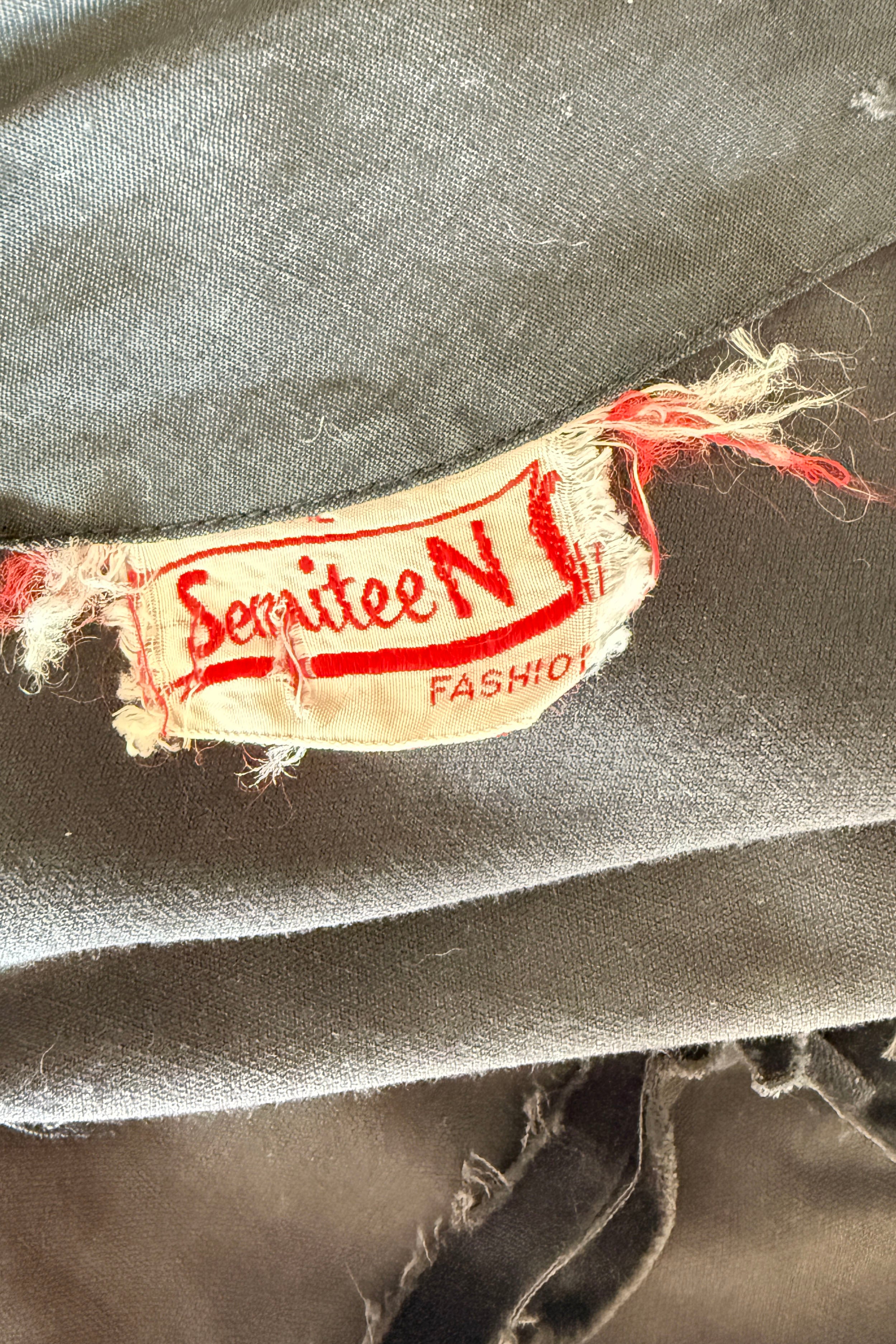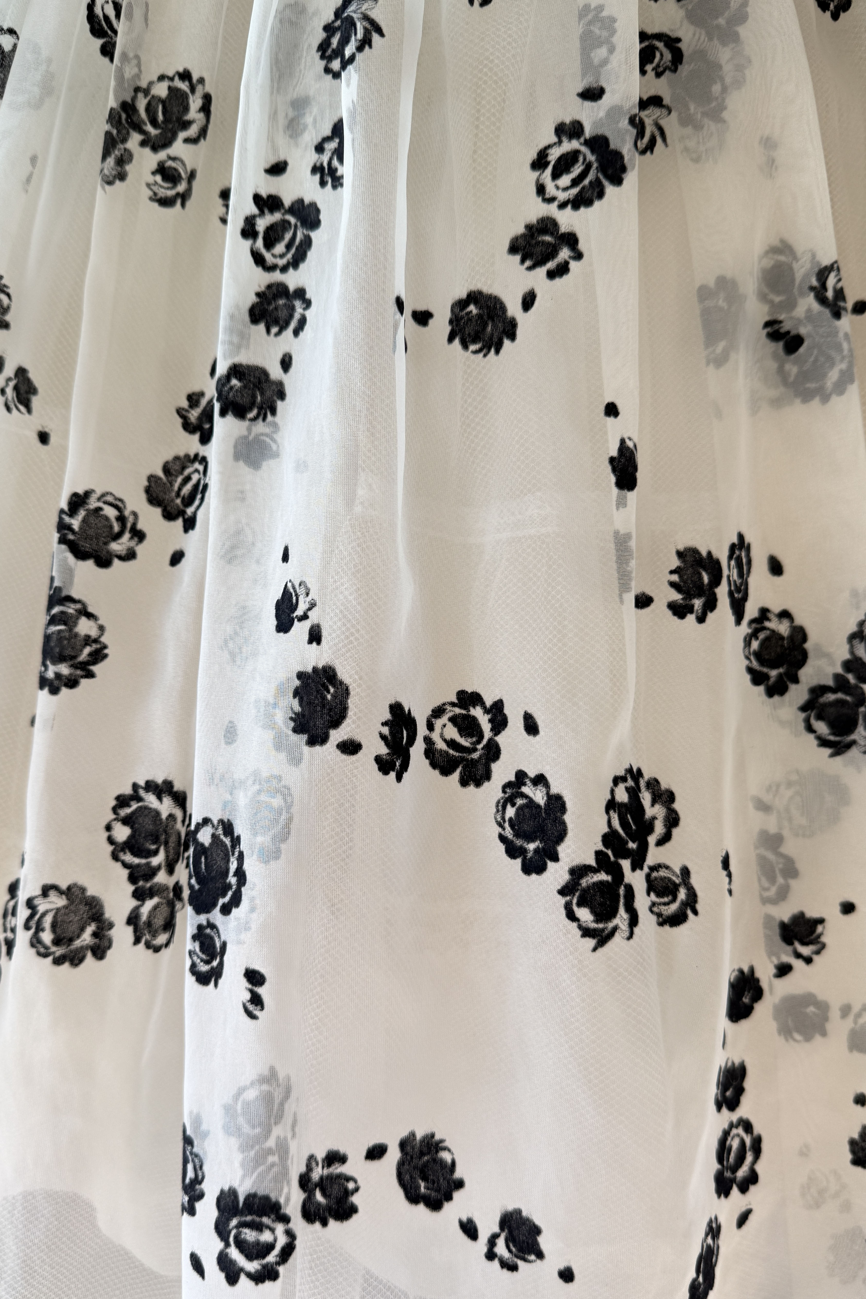 VINTAGE DRESSVintage 1950s dress. Features black velvet bodice, chiffon skirt with flocked roses, acetate lining and built in crinoline, metal back zipper. By Semiteen.Excellent condition. XS/S. Length 41Bodice 15Bust 36Waist 28As with all vintage, please expect wear consistent with age. All sales are final. No order cancellations.0874 | 2607
