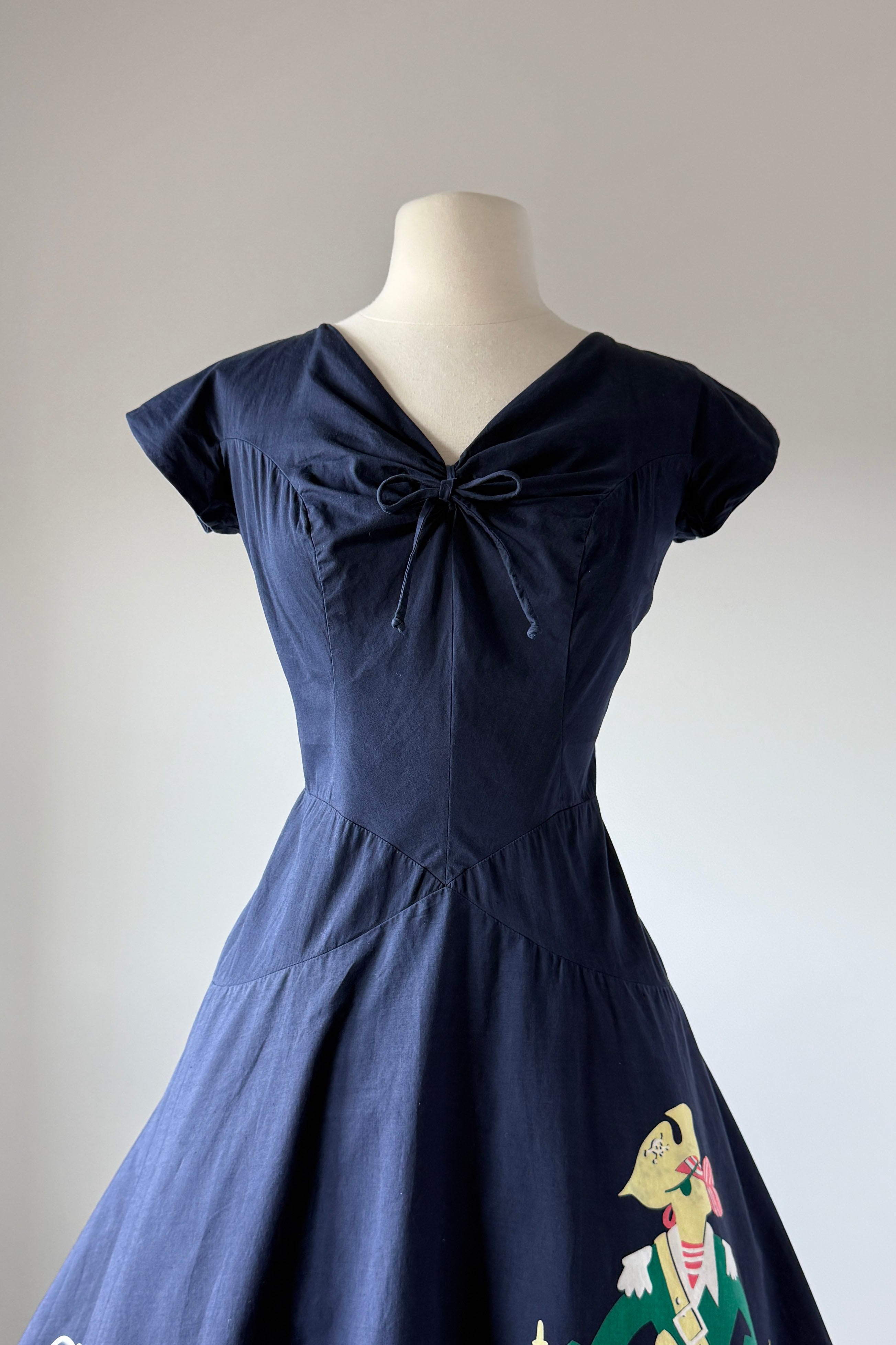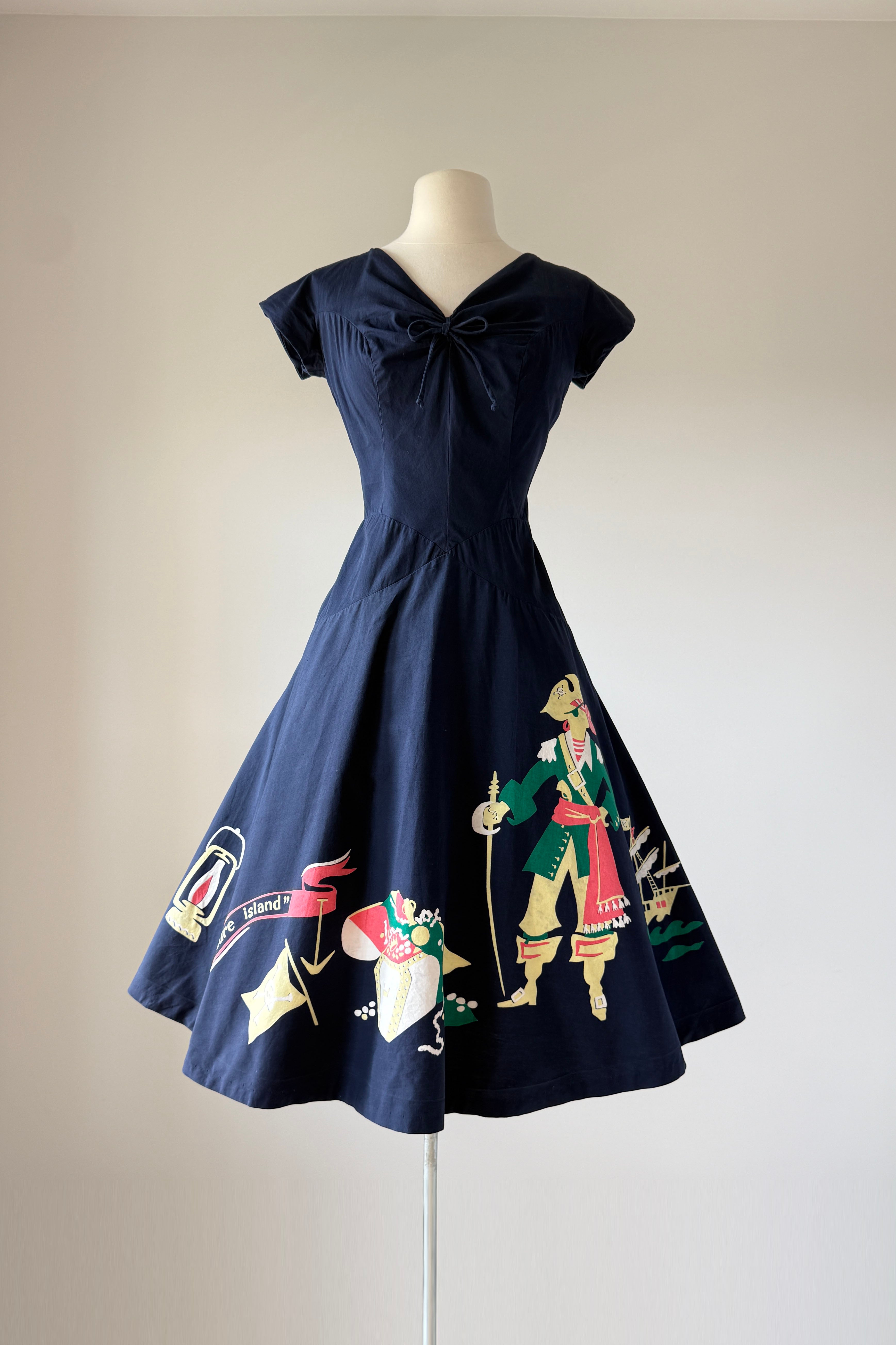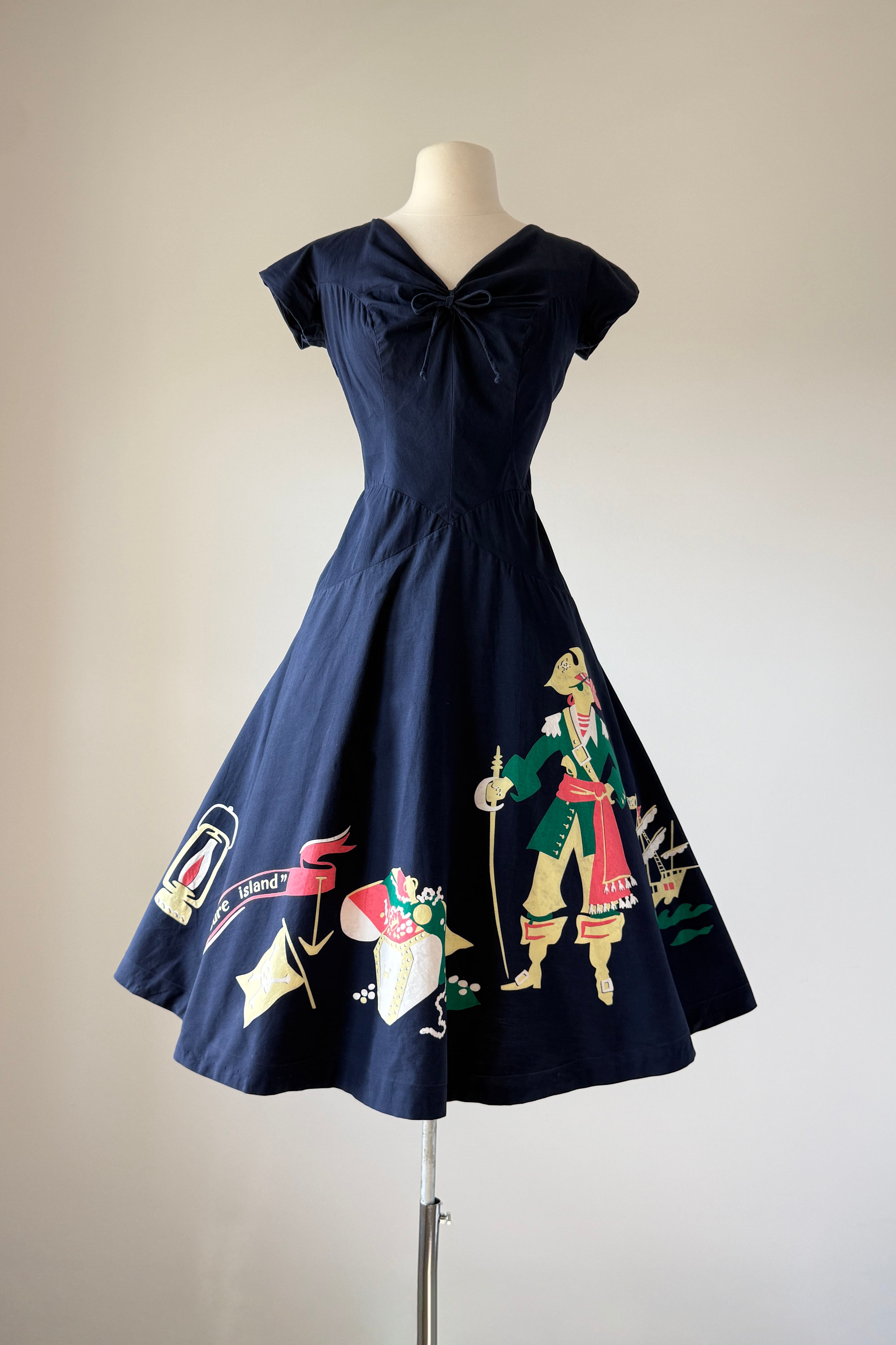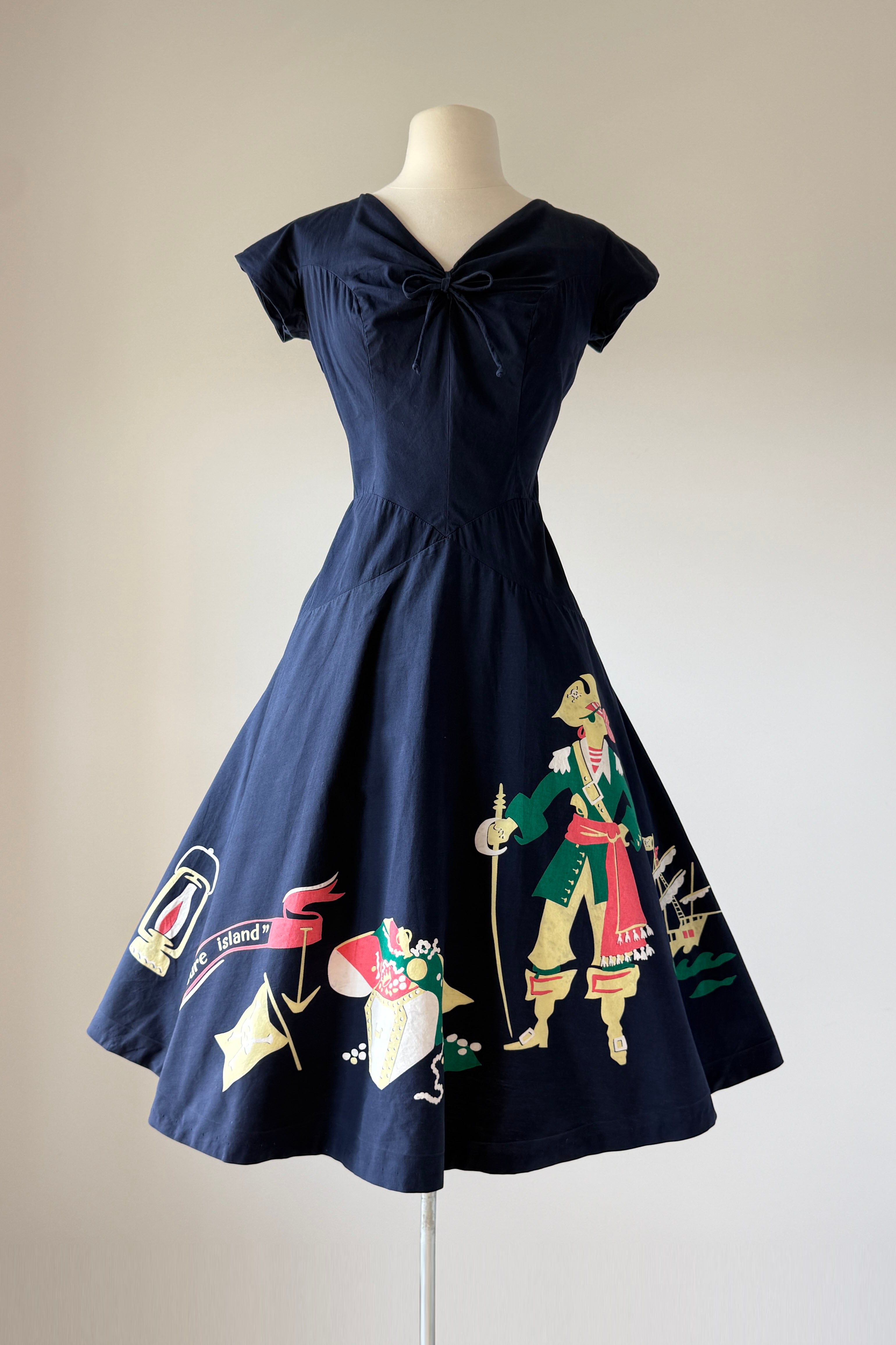 Vintage 1950s dress. Features rare Treasure Island novelty print scene, metal back zipper closure, tie at bust. Dark blue cotton. From The Boutique at Hotel Jefferson, Richmond, Virginia.