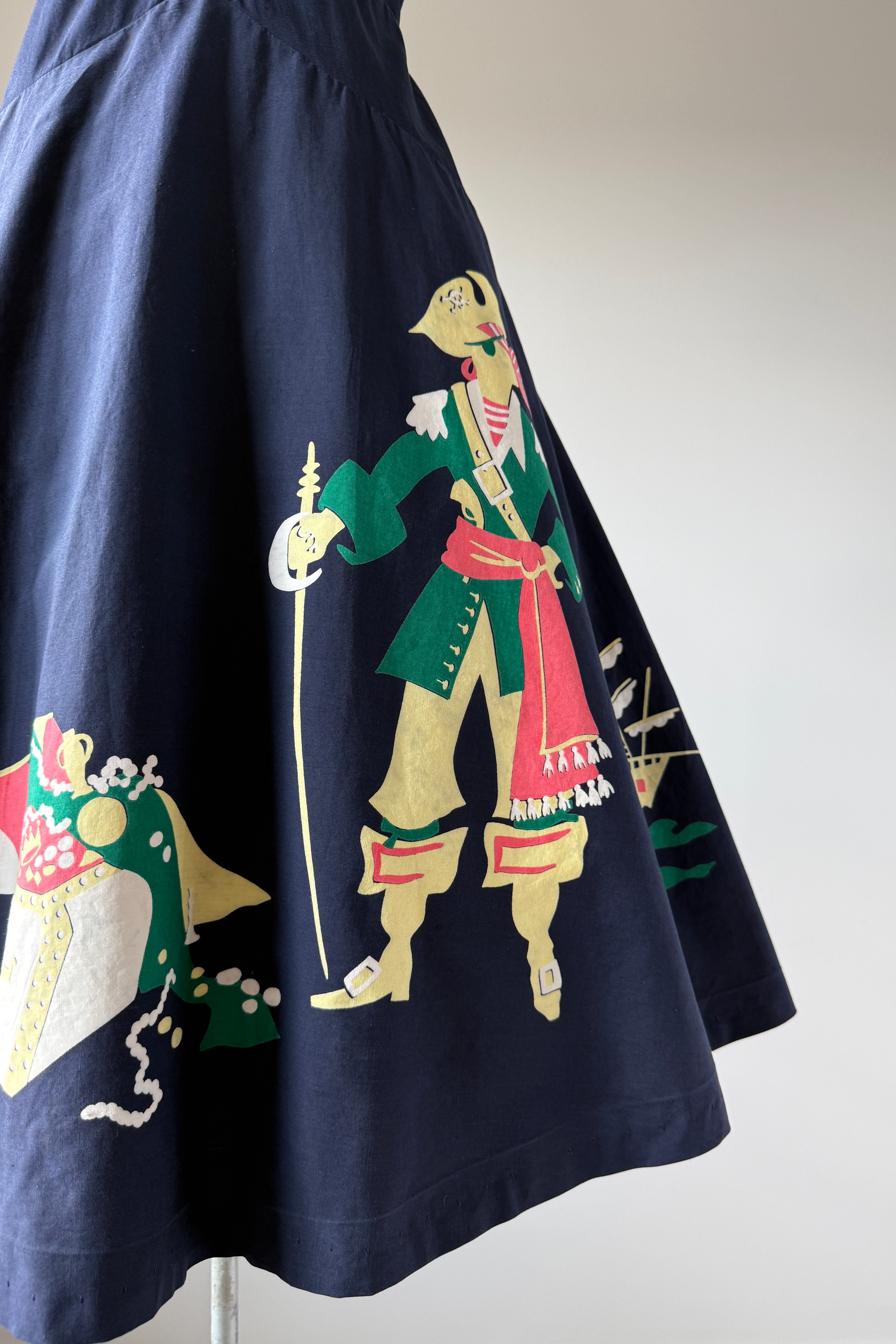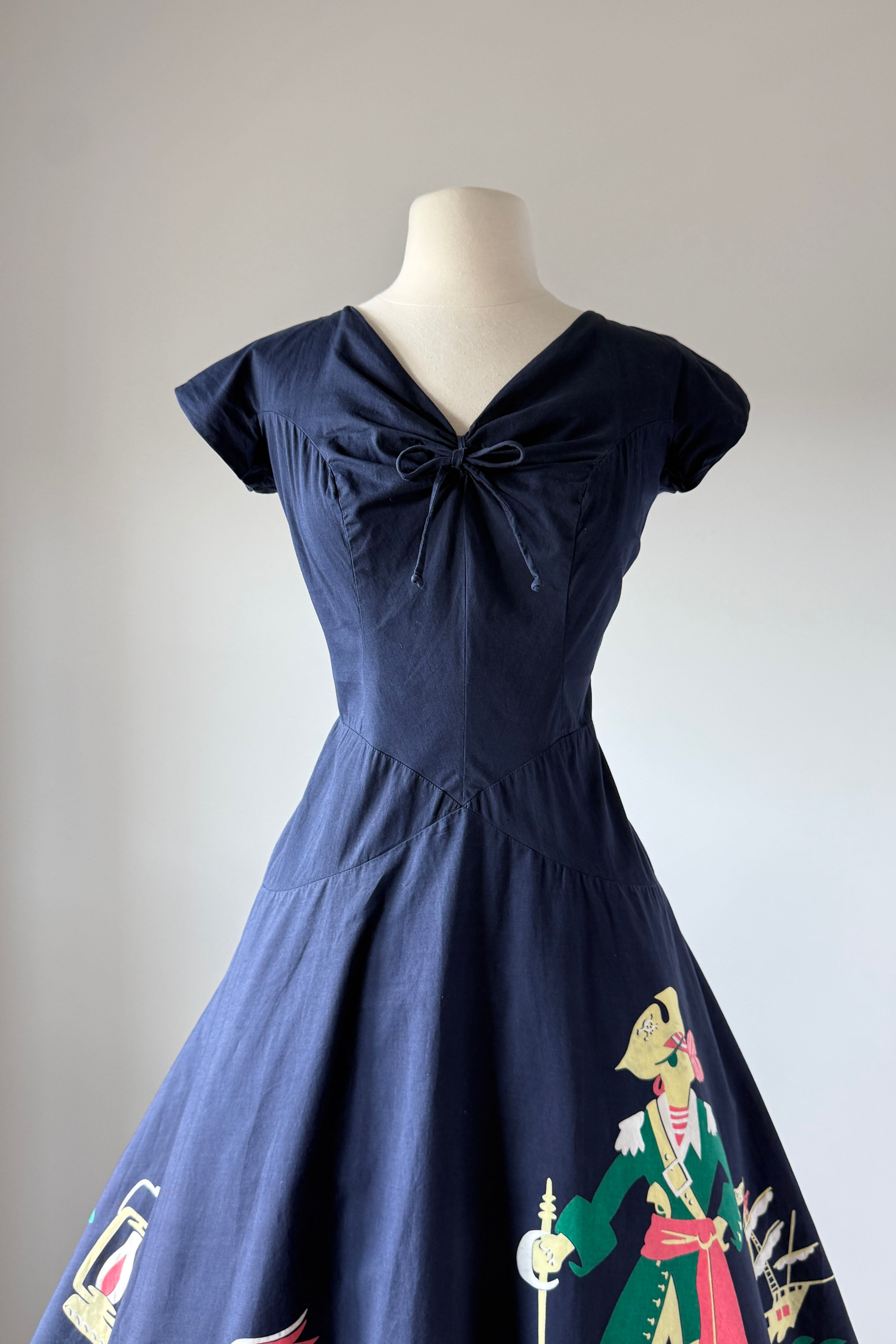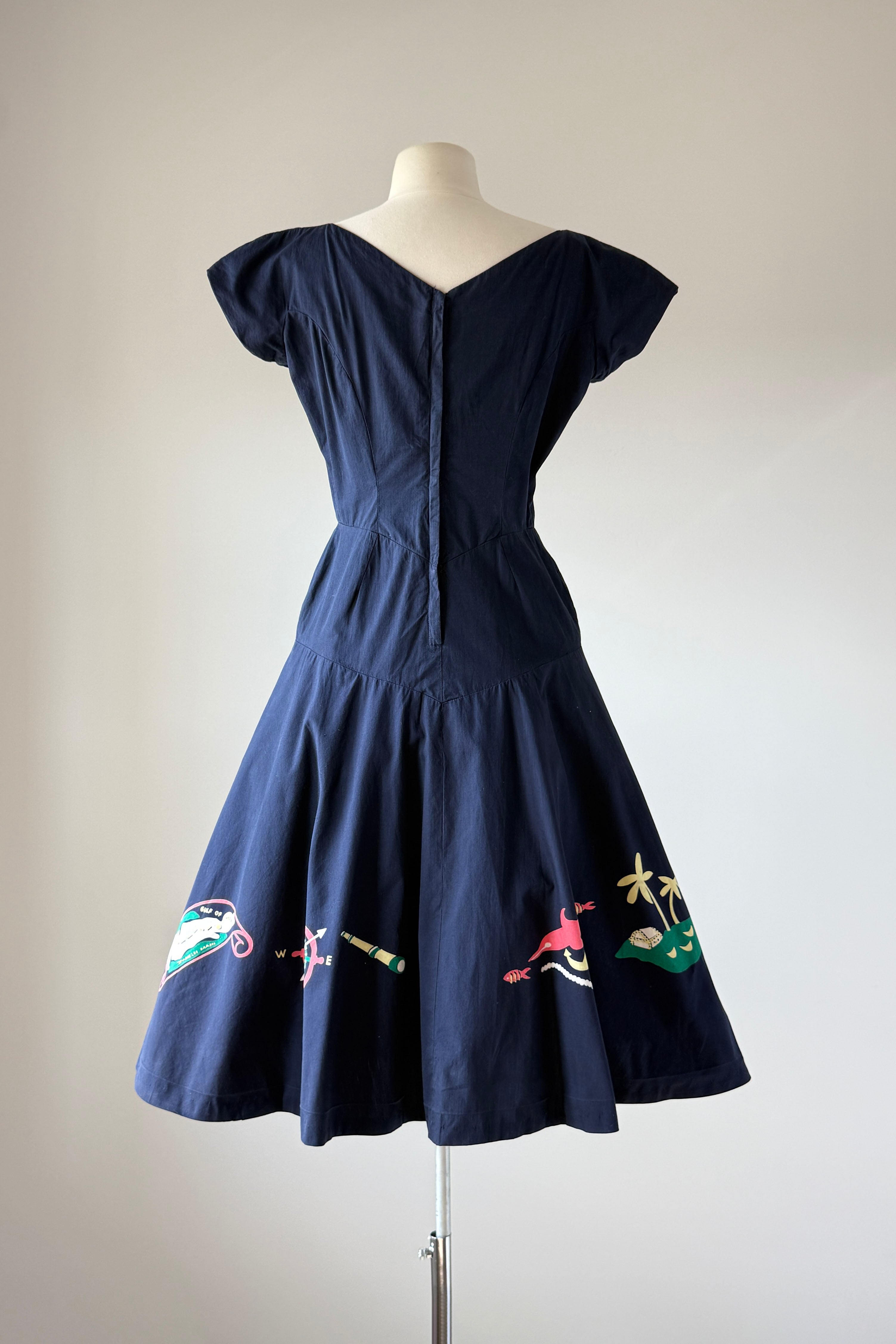 Vintage 1950s dress. Features rare Treasure Island novelty print scene, metal back zipper closure, tie at bust. Dark blue cotton. From The Boutique at Hotel Jefferson, Richmond, Virginia.