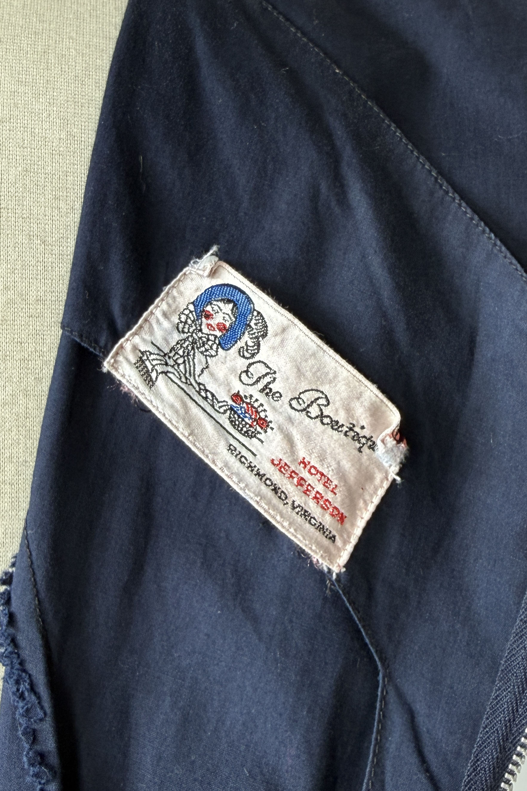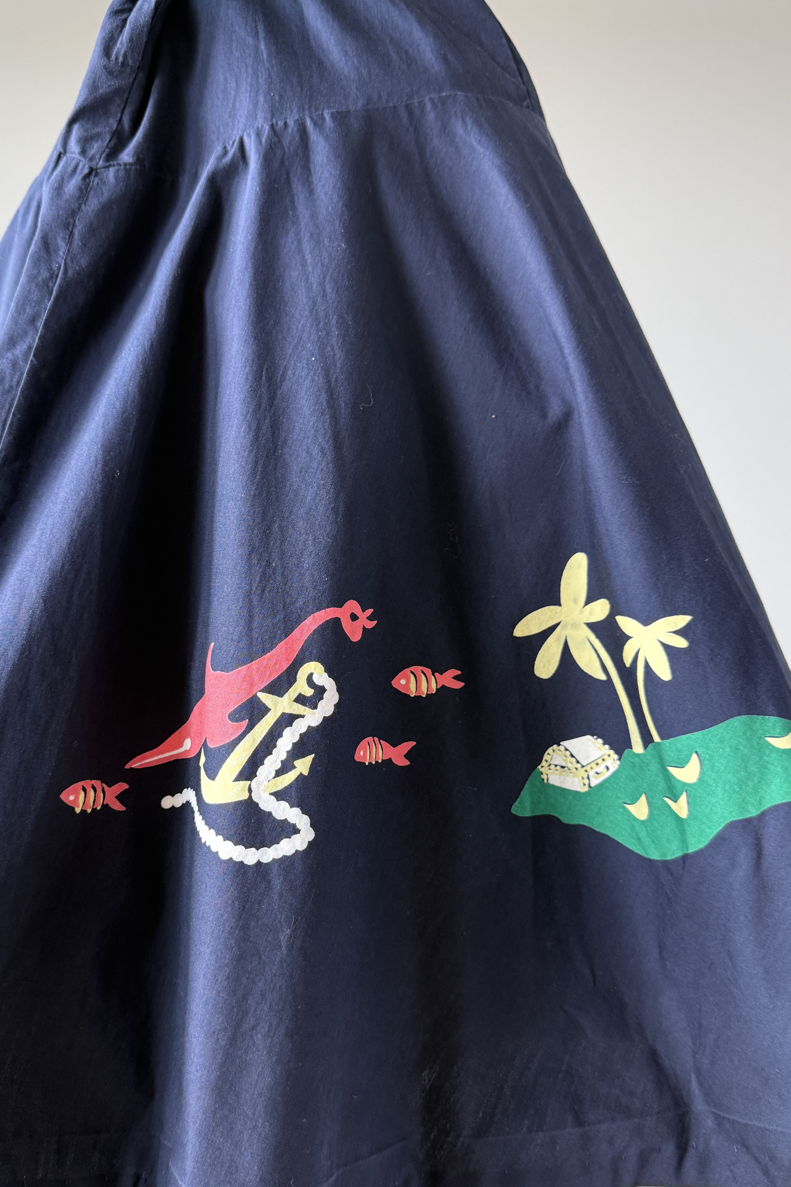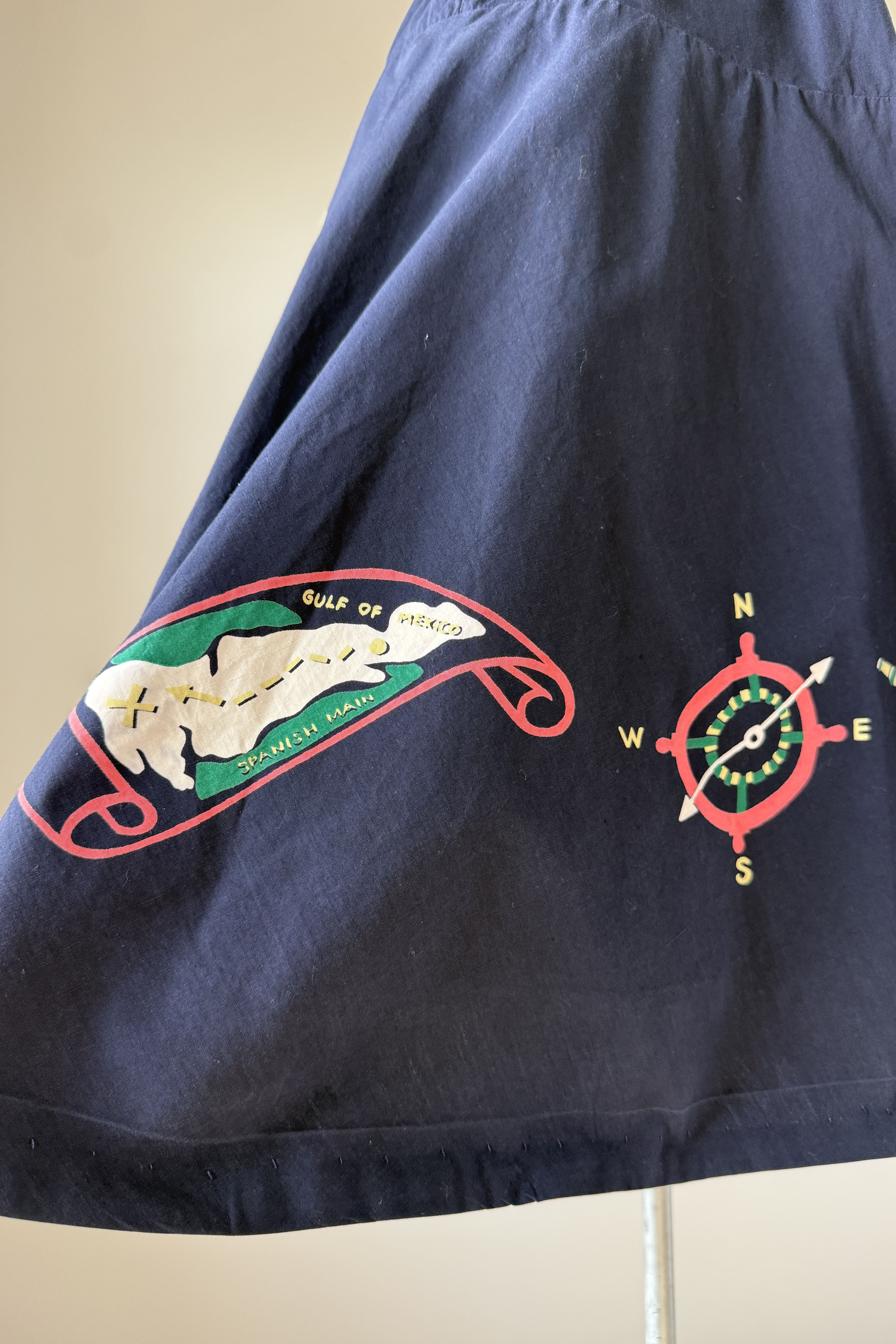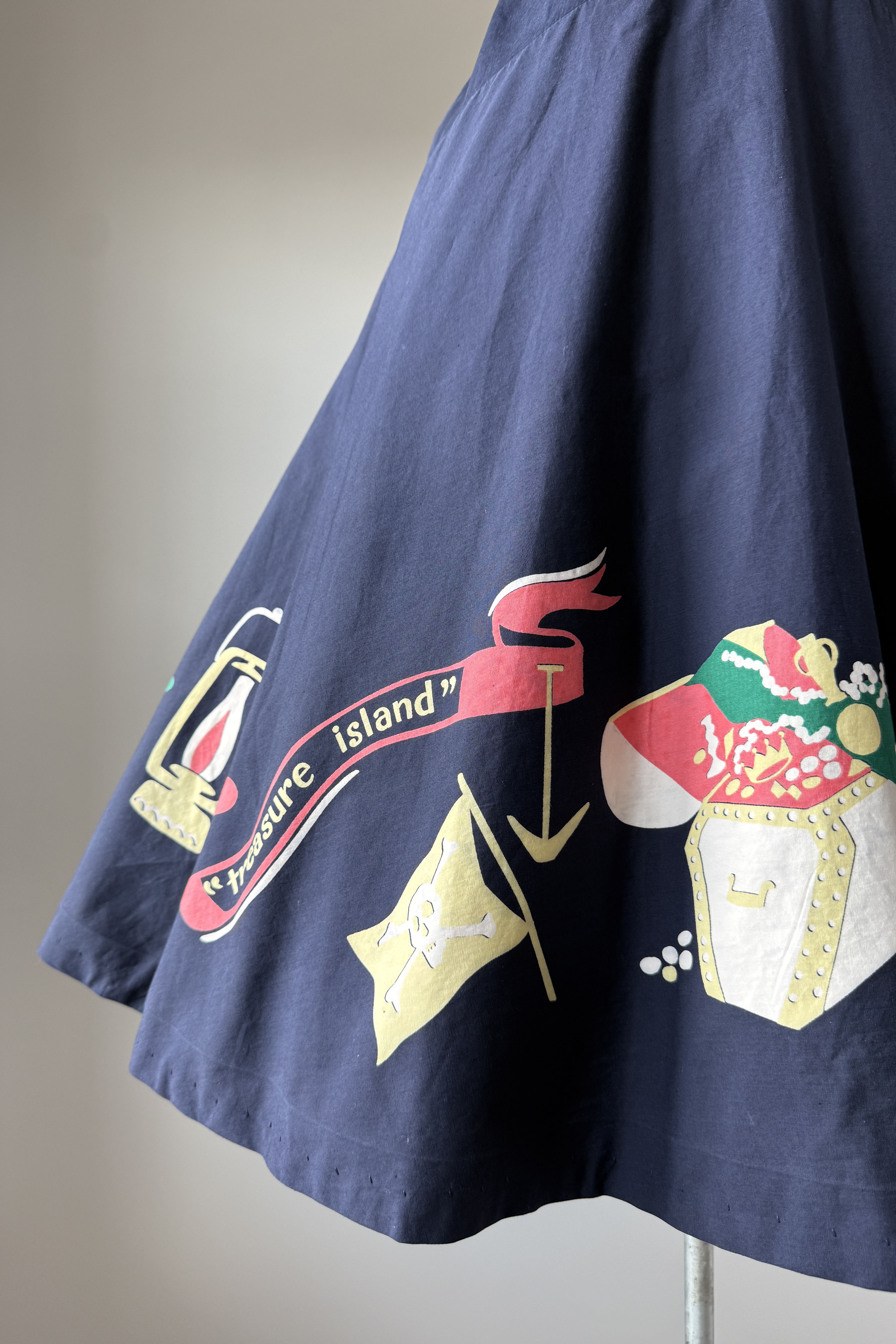 Vintage 1950s dress. Features rare Treasure Island novelty print scene, metal back zipper closure, tie at bust. Dark blue cotton. From The Boutique at Hotel Jefferson, Richmond, Virginia.