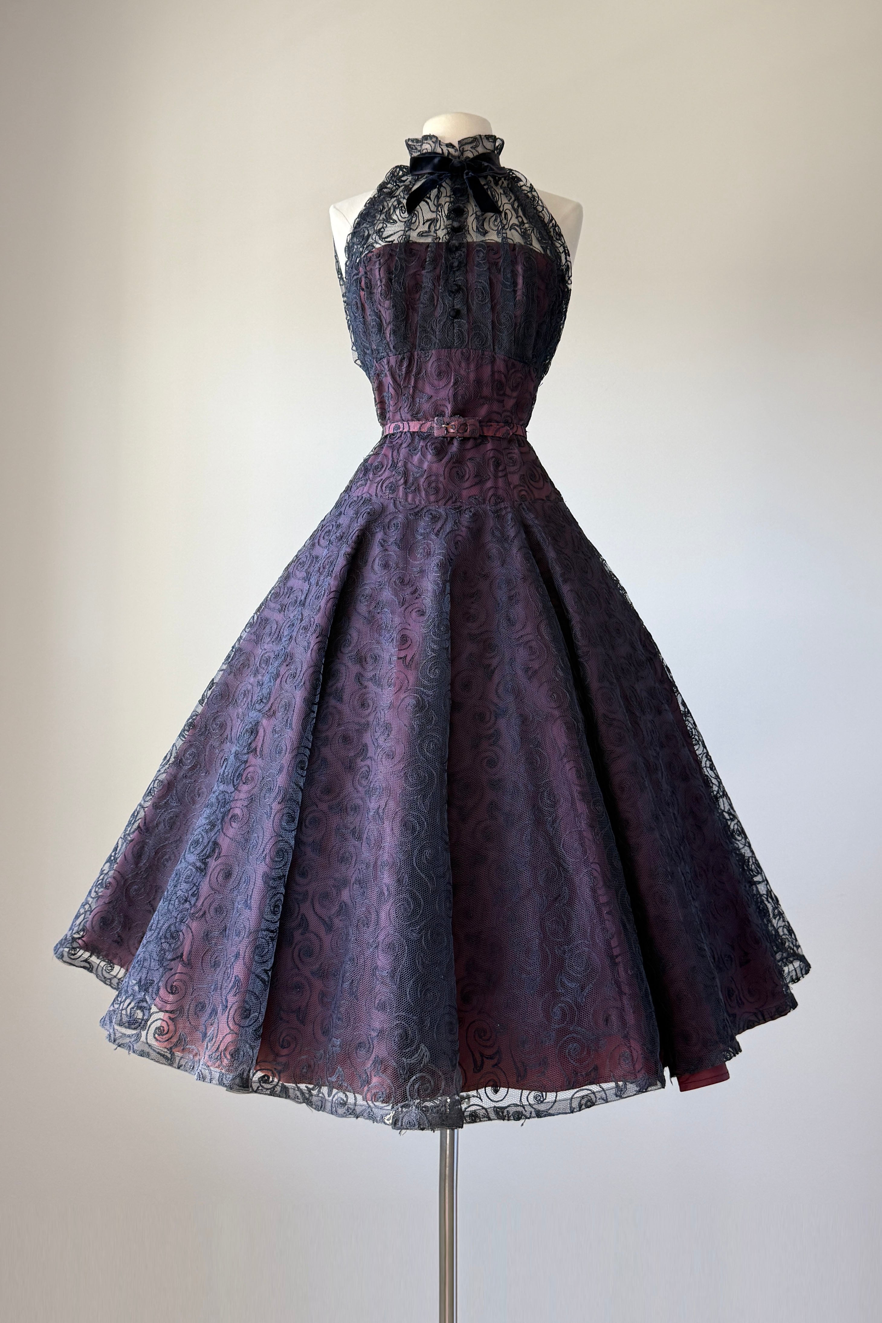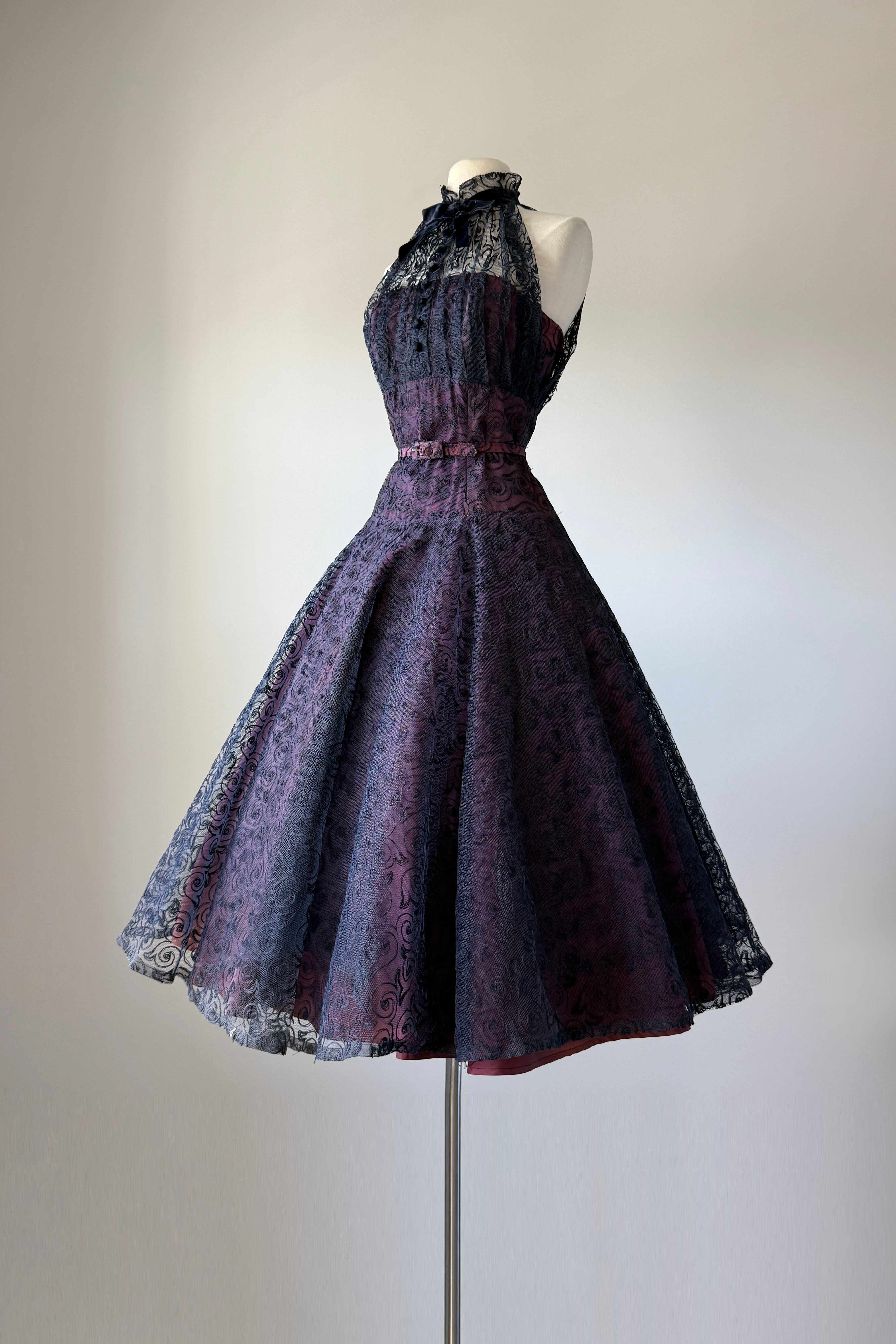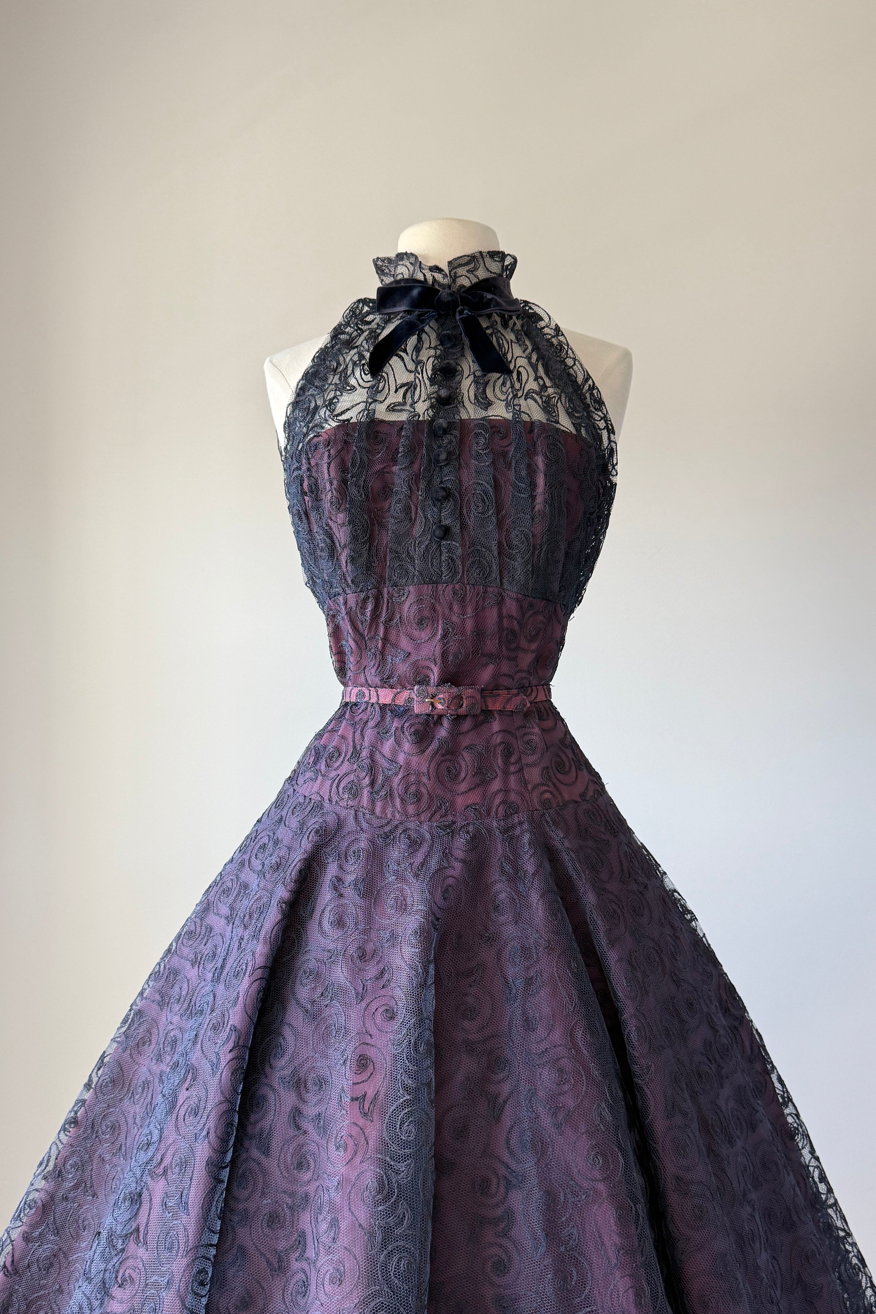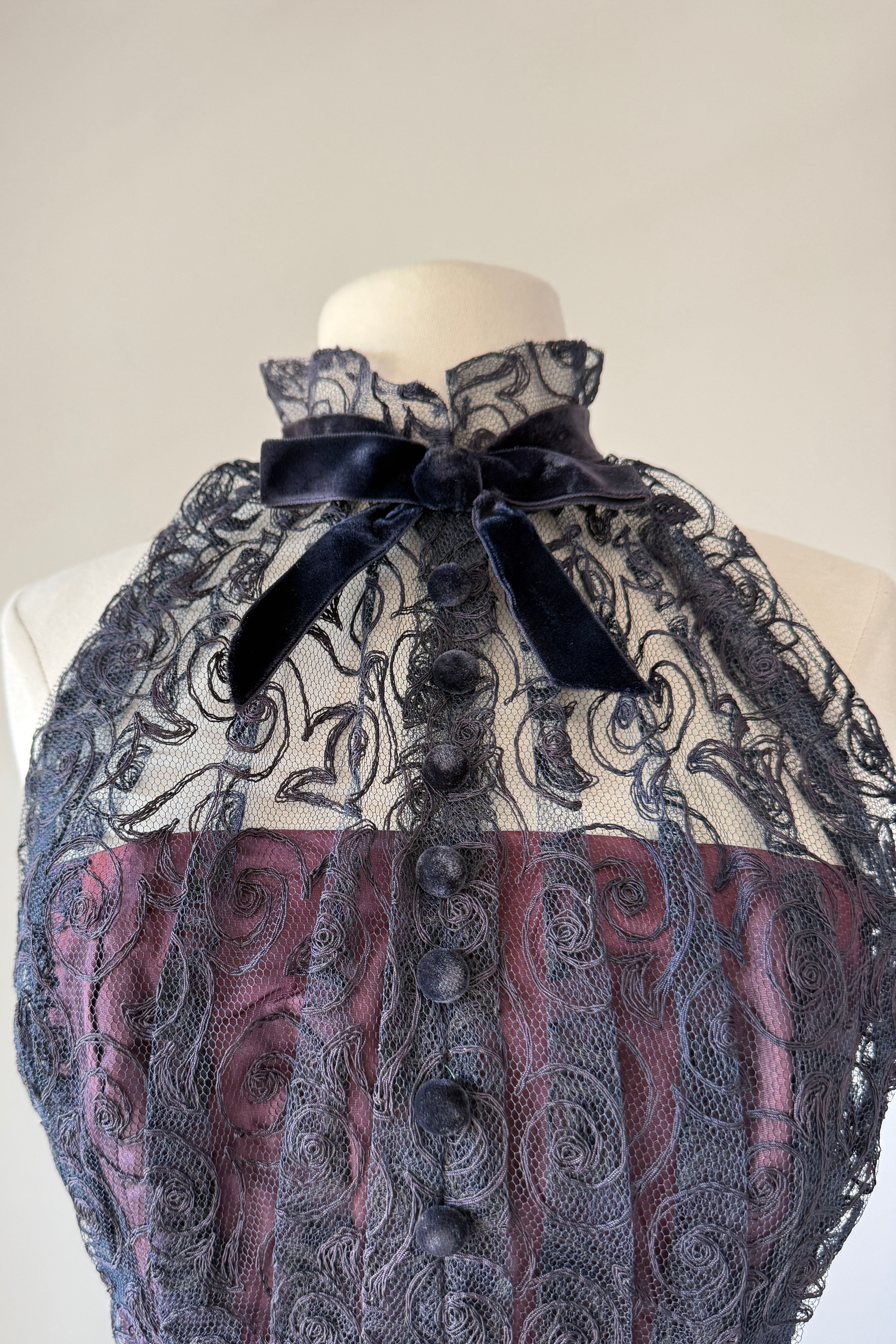 VINTAGE DRESSVintage 1950s dress. Features blue embroidery on tulle with acetate and tulle lining, metal back zipper, halter bodice with stays and velvet tie and decorative buttons. Original belt. By Paul Sachs. Great condition. Some minor color variation and pinhead size holes on lining. Presents beautifully. Fits like SMALL. Length 46Bodice 16Bust 35-36Waist 28-29As with all vintage, please expect wear consistent with age. All sales are final. No order cancellations.0918 | 2611