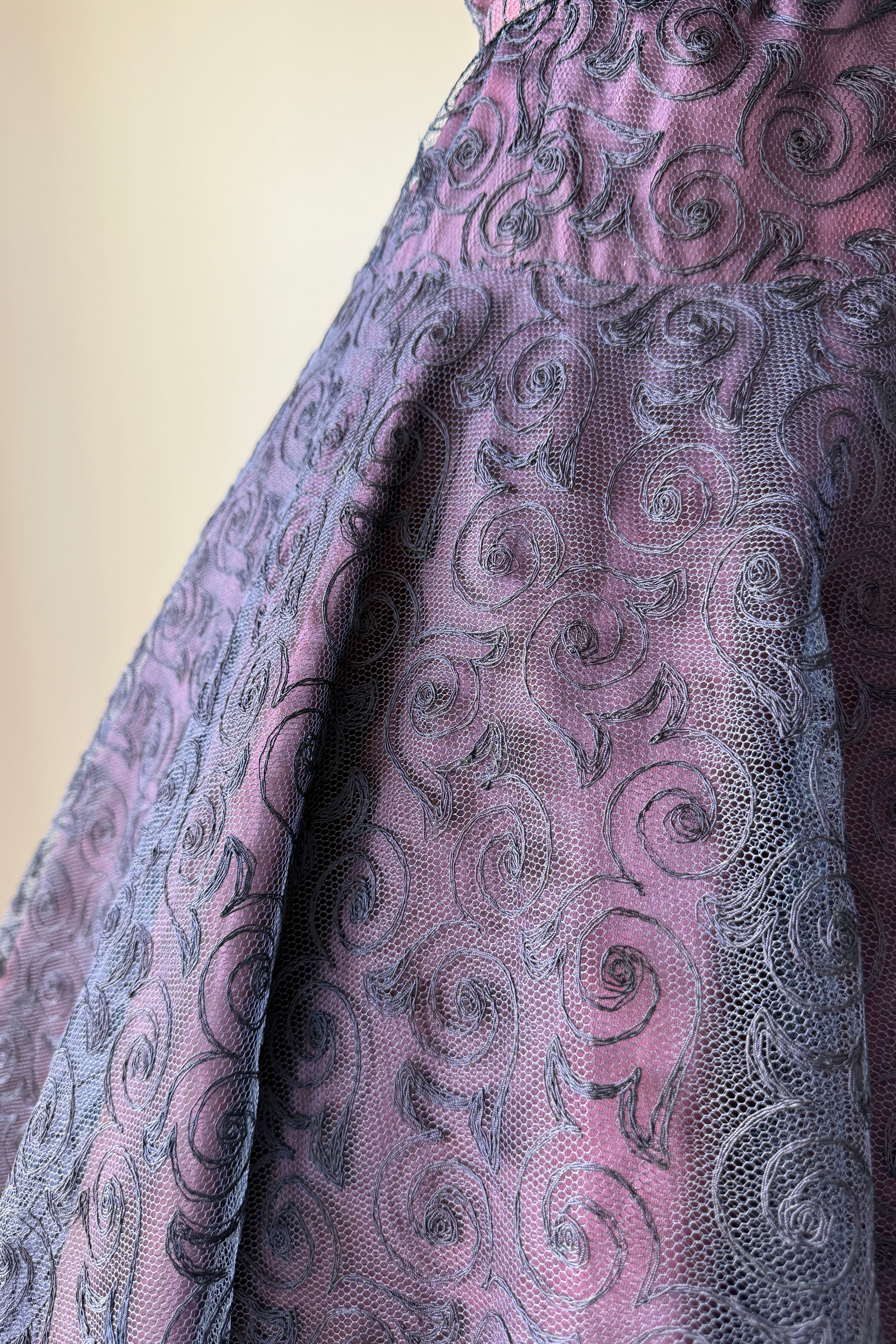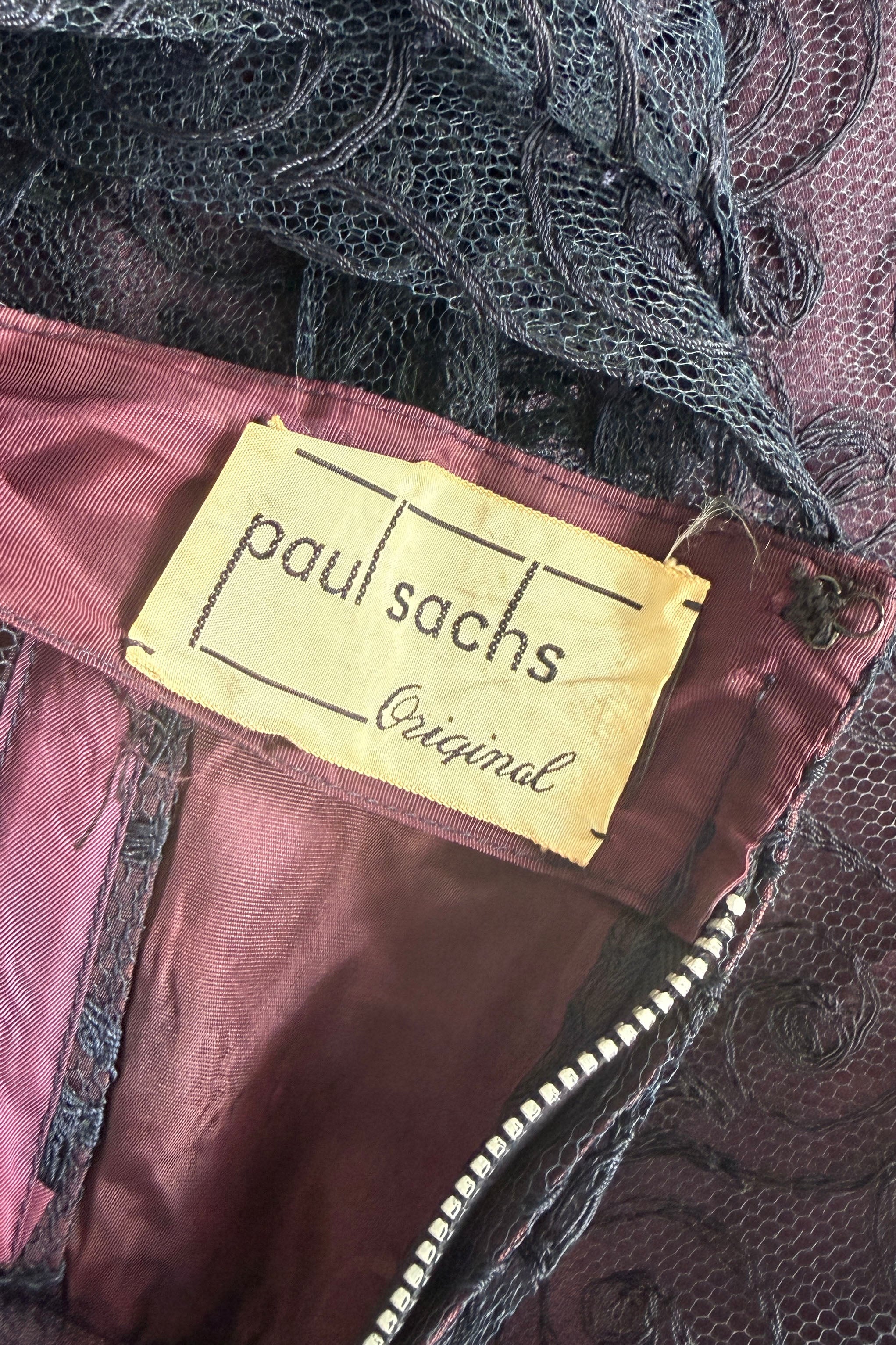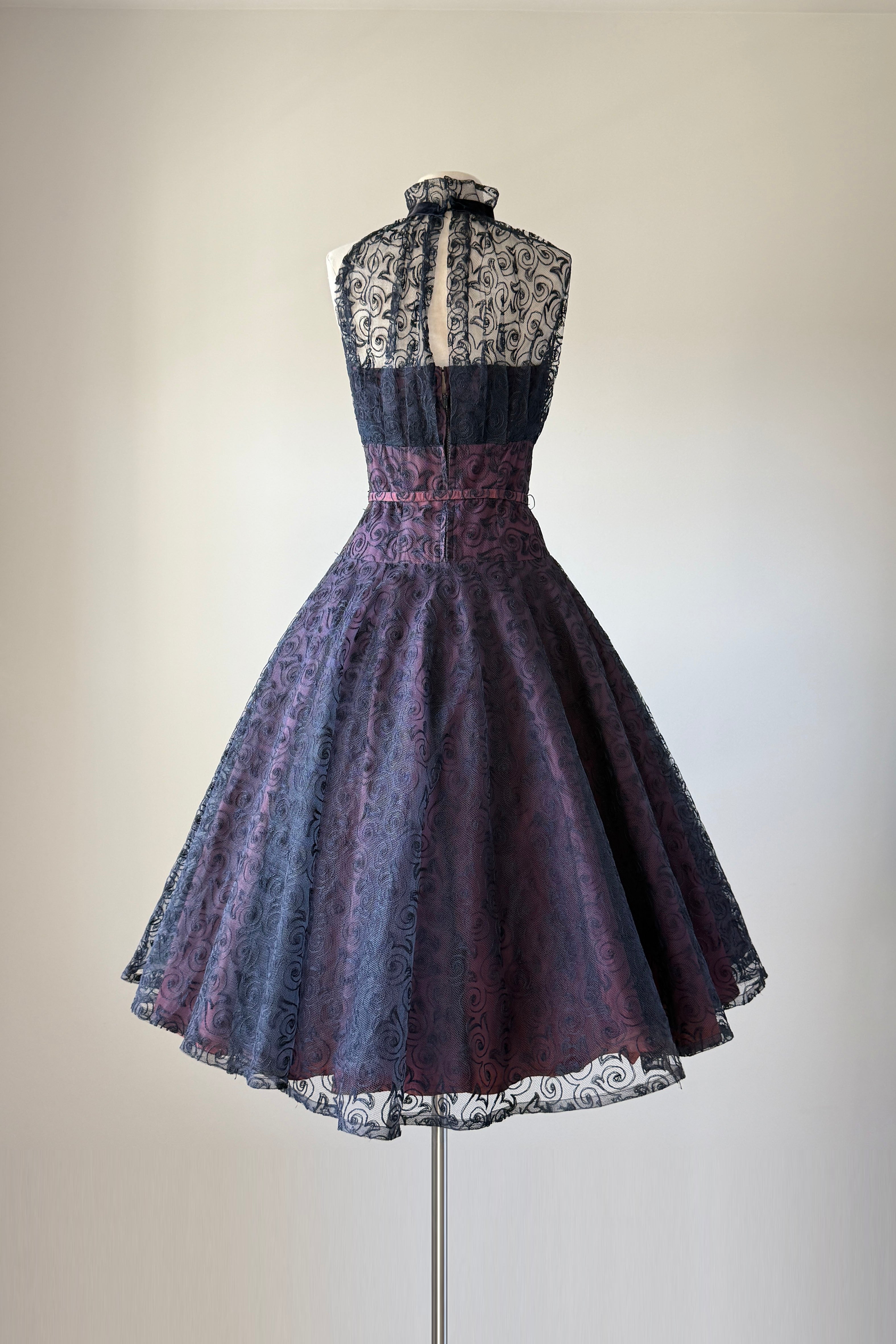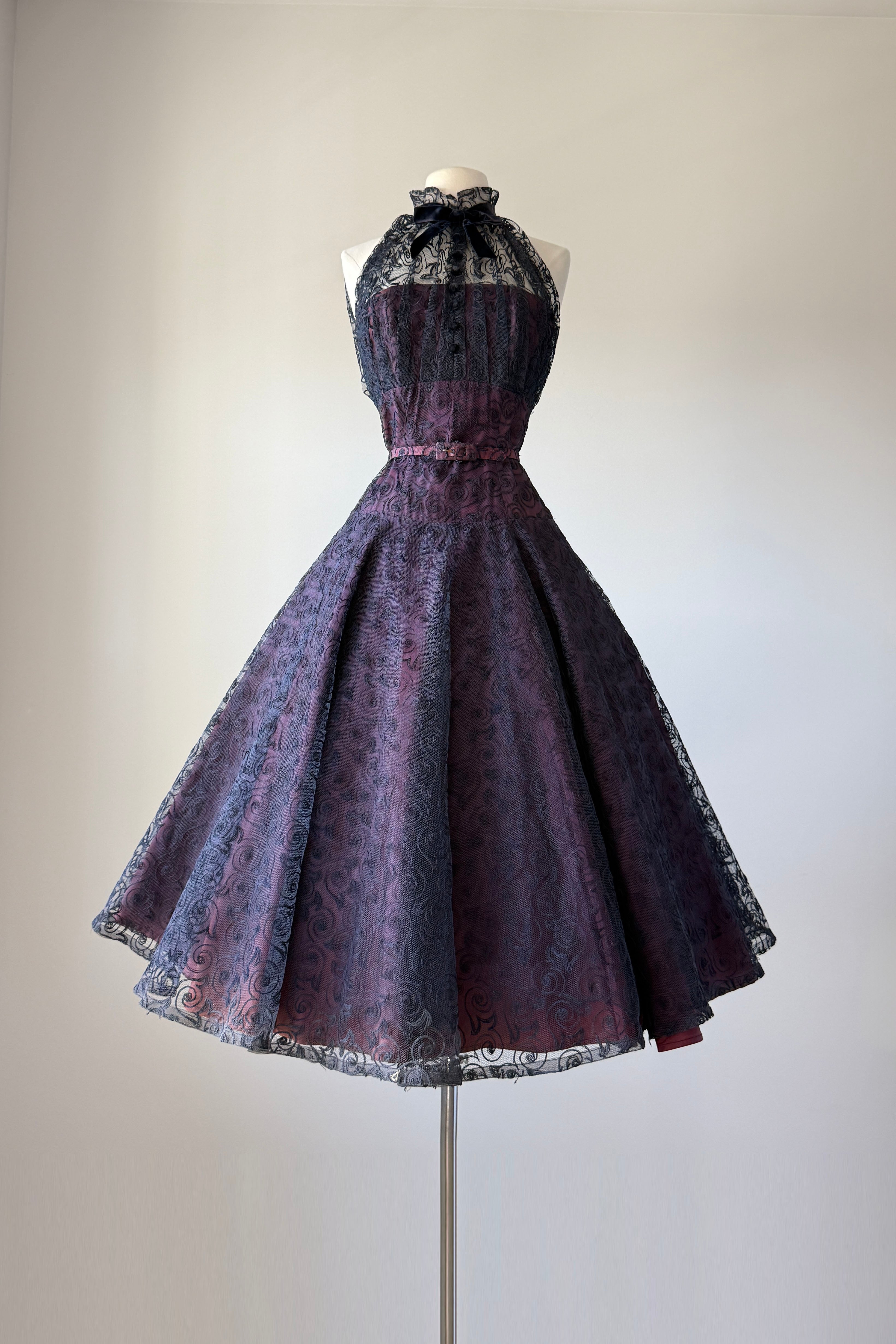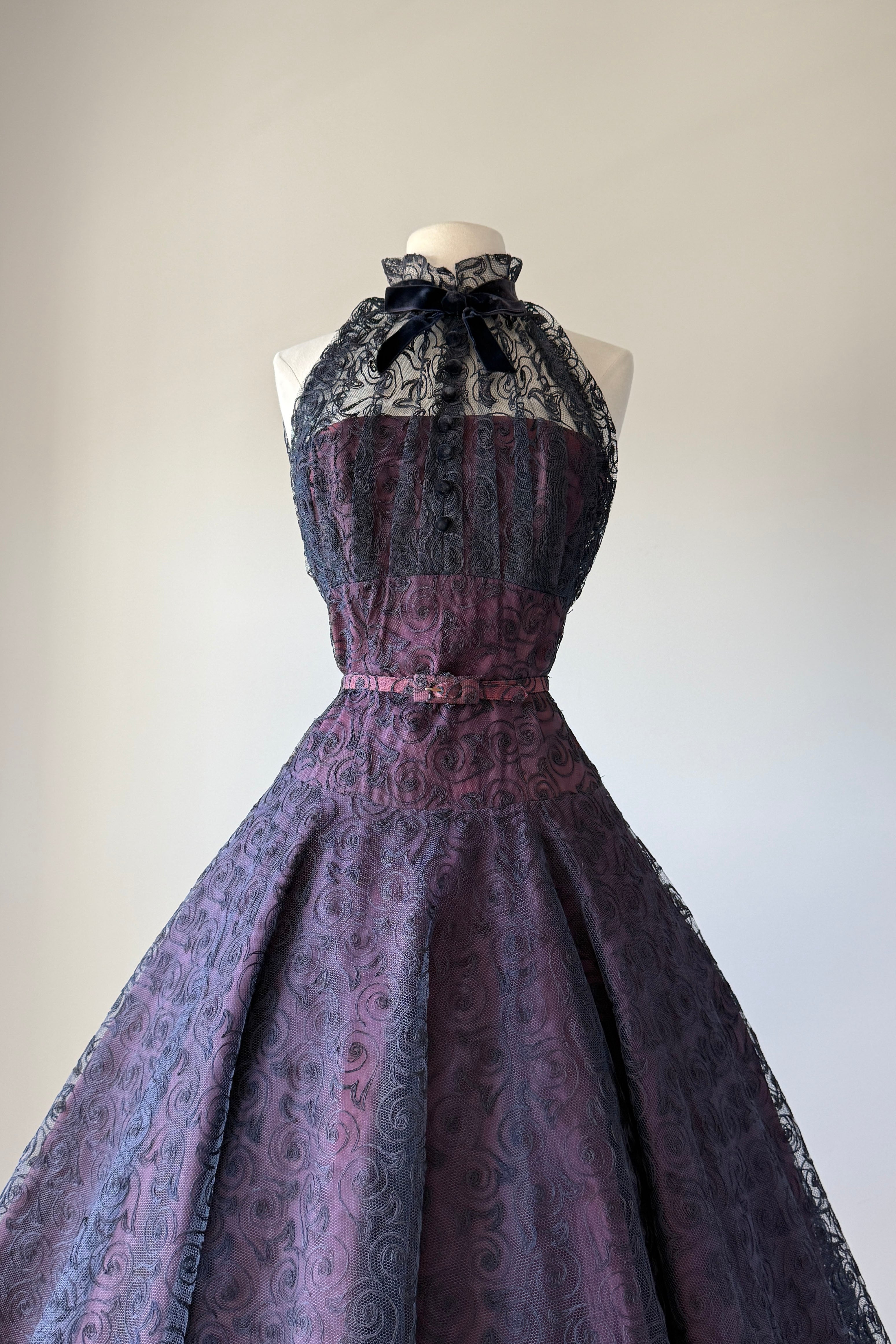 VINTAGE DRESSVintage 1950s dress. Features blue embroidery on tulle with acetate and tulle lining, metal back zipper, halter bodice with stays and velvet tie and decorative buttons. Original belt. By Paul Sachs. Great condition. Some minor color variation and pinhead size holes on lining. Presents beautifully. Fits like SMALL. Length 46Bodice 16Bust 35-36Waist 28-29As with all vintage, please expect wear consistent with age. All sales are final. No order cancellations.0918 | 2611